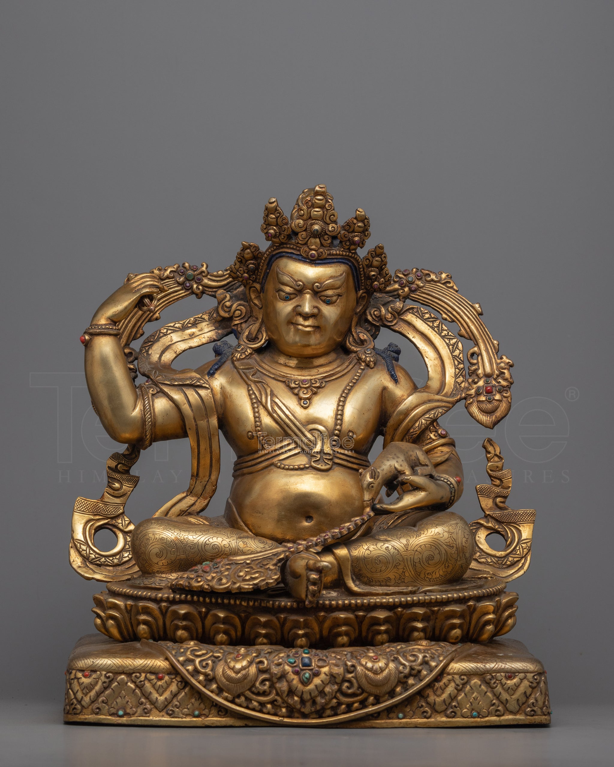 This beautifully crafted piece of Dzambhala statue employs traditional Himalayan motifs and designs delicately produced in our studio. The copper statue is gilded in gold resulting in its final brilliant sheen. In the statue, the Buddhist deity of wealth, prosperity, and good fortune is shown regally sitting on a moon disc lotus seat, looking wrathful, signifying his ability to remove barriers and bestow favors. He holds a mongoose in his right hand and a Vajra in his left, signifying his ability to provide wealth.