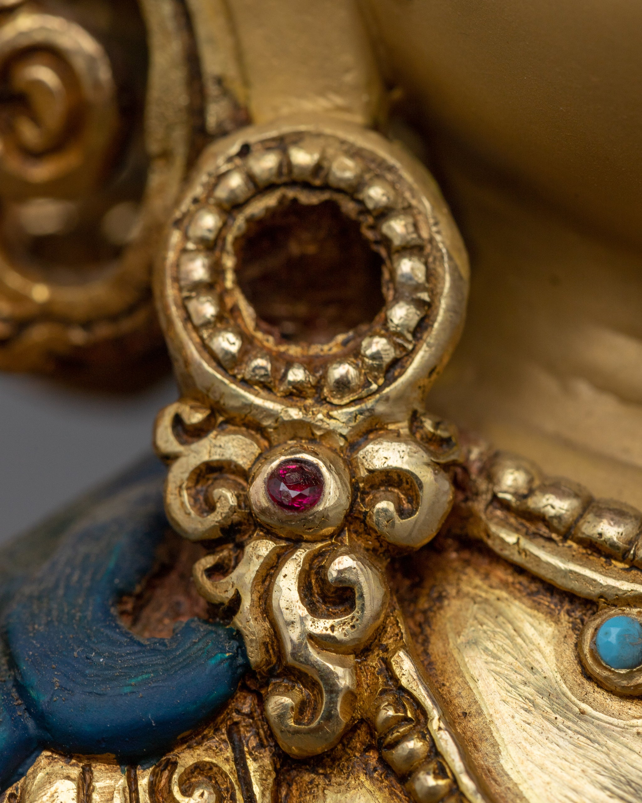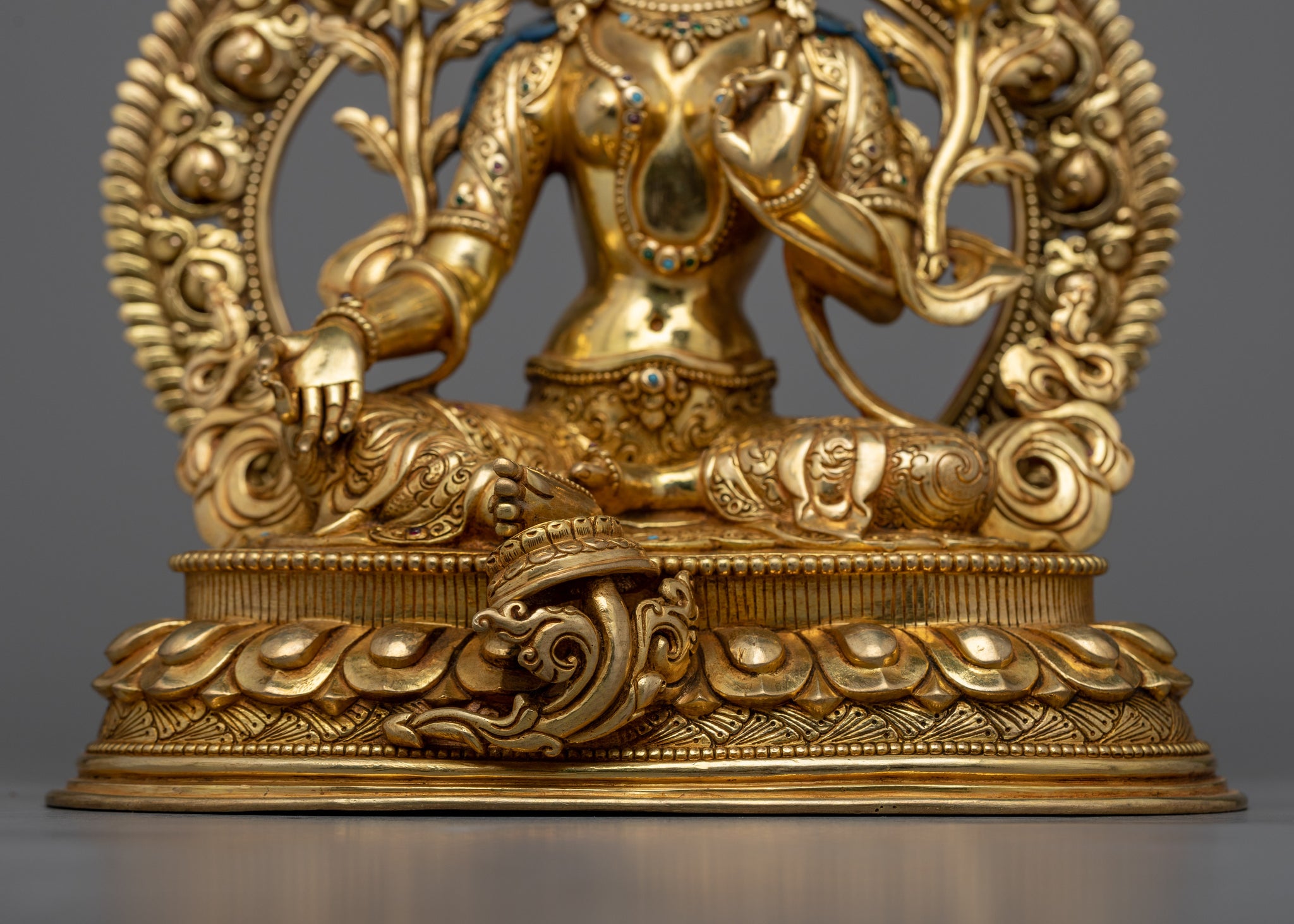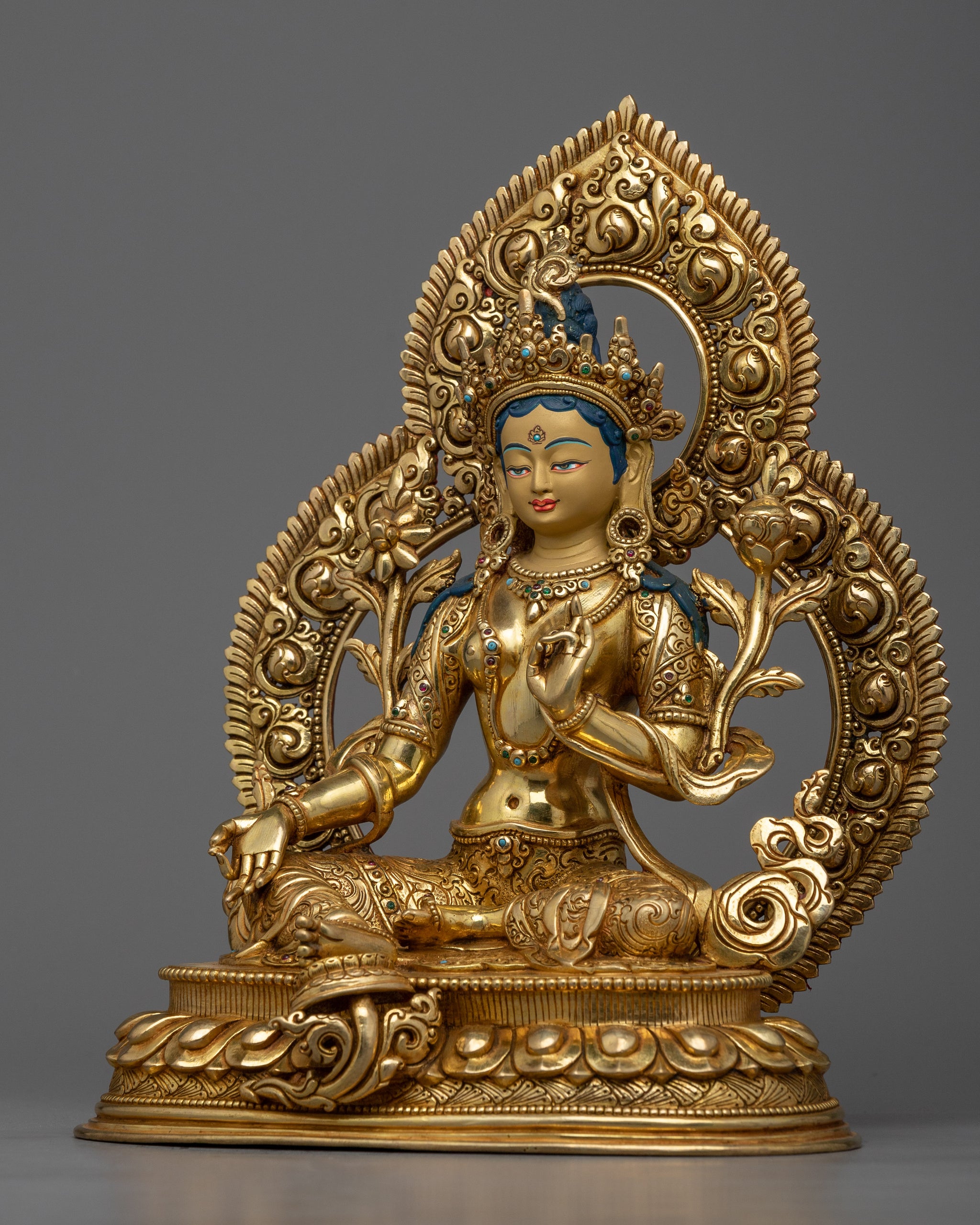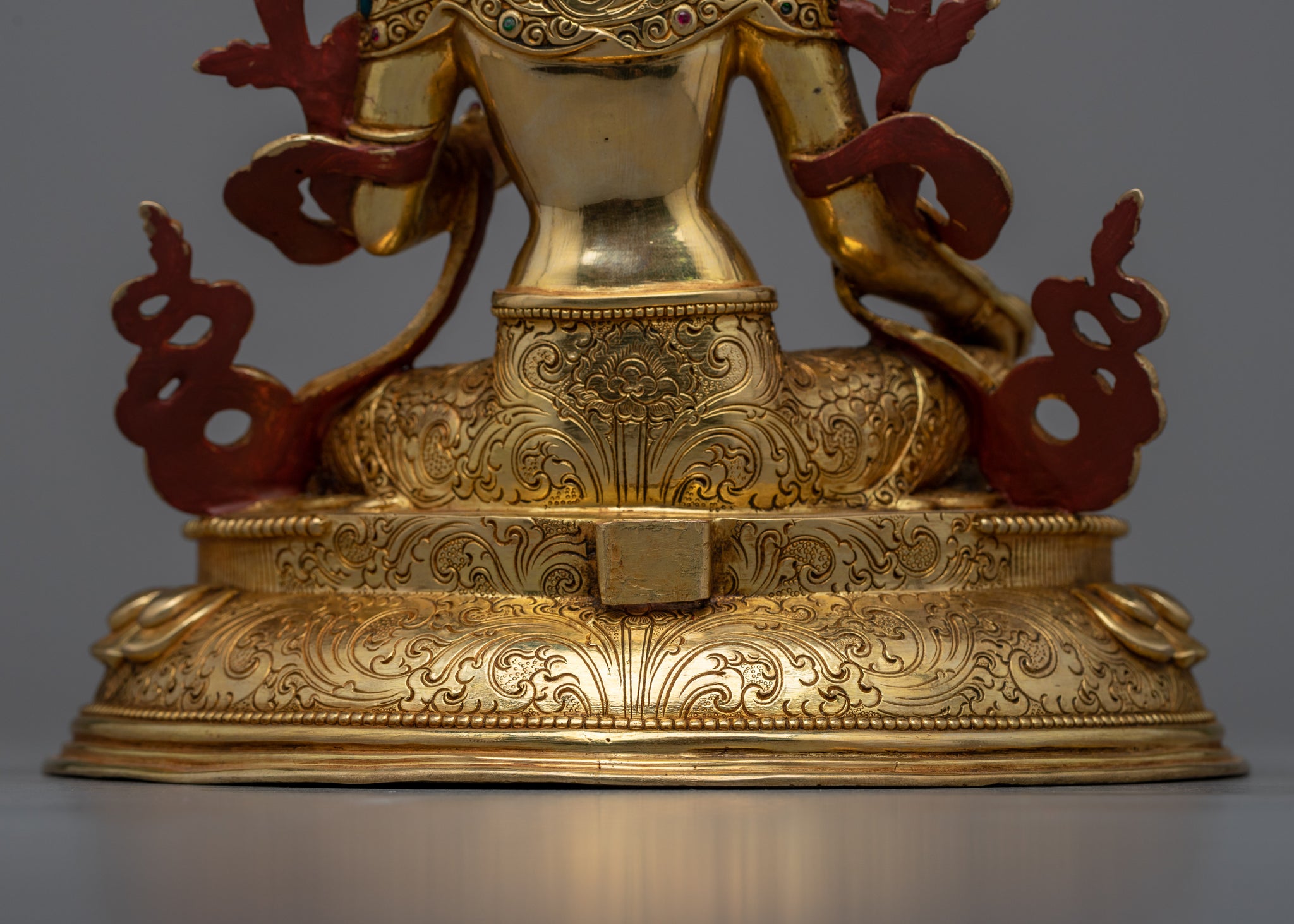 Invite the embodiment of compassion and serenity into your space with our Gold-Gilded Green Tara Statue. Standing at a height of 10.6 inches and with a base of 7.8 inches, this statue is a perfect addition to your shrine, home, or meditation space. The statue is crafted from a copper body, gilded with 24k gold, and adorned with 24k gold and acrylic paintings, reflecting the rich tradition of Buddhist craftsmanship and lending it a unique, regal finish.