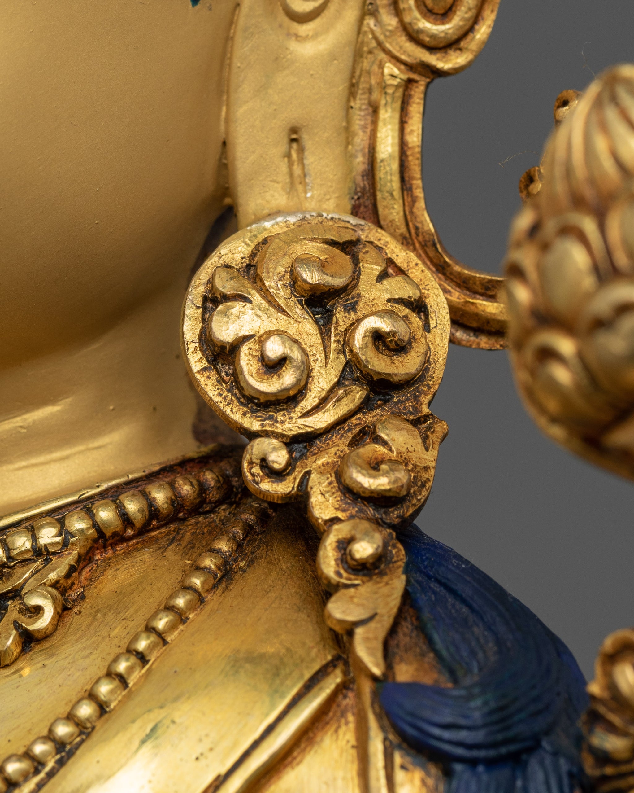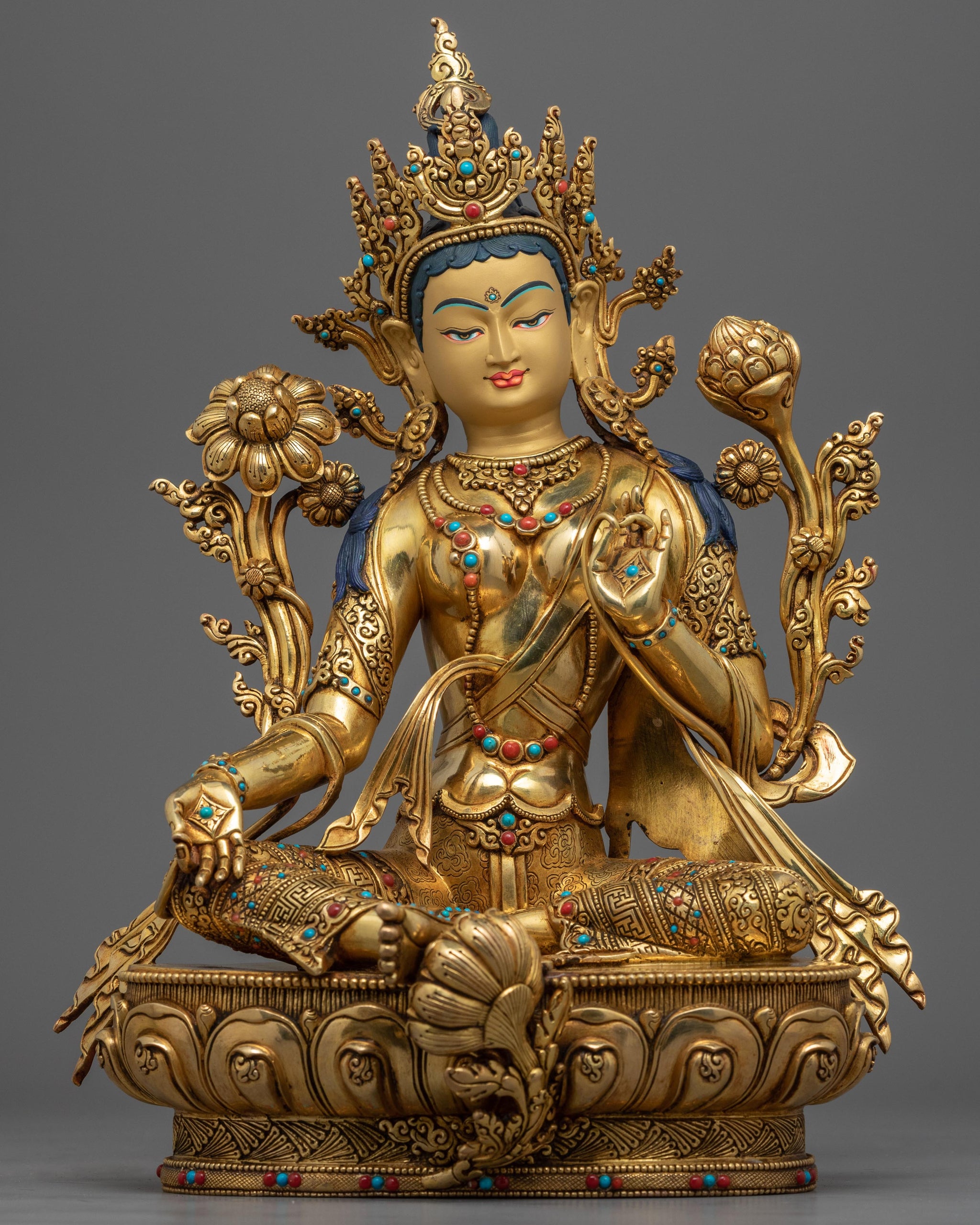 This exquisite piece of Green Tara bodhisattva sculpture employs traditional Himalayan motifs and designs delicately produced in our studio. The statue's copper body was gilded with genuine 24K gold giving its final shine. The deity is depicted seated atop a moon disc lotus seat with serene and compassionate facial expressions. Two Utpala flowers sits beside the deity's head as she is portraying 'Varada Mudra’ (gesture of generosity) and the ‘Vaidarka Mudra’ (gesture of discussion and transmission).