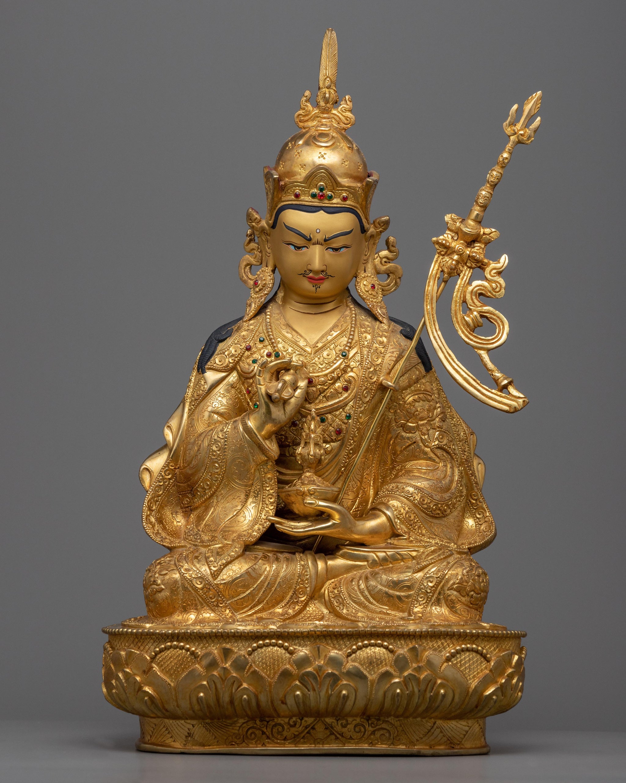 This exquisitely carved Guru Padmasambhava statue makes use of delicately created traditional Himalayan themes and patterns. The statue's luster and brilliance come from the gold leaf that has been applied to its copper body. The statue shows the Lotus-Born sitting majestically on a moon disc lotus seat, holding a vajra and a skull cup with a jar of immortality in each hand. In the arc of his left hand, he holds the Khatvanga trident, his celestial ally of bliss and emptiness.