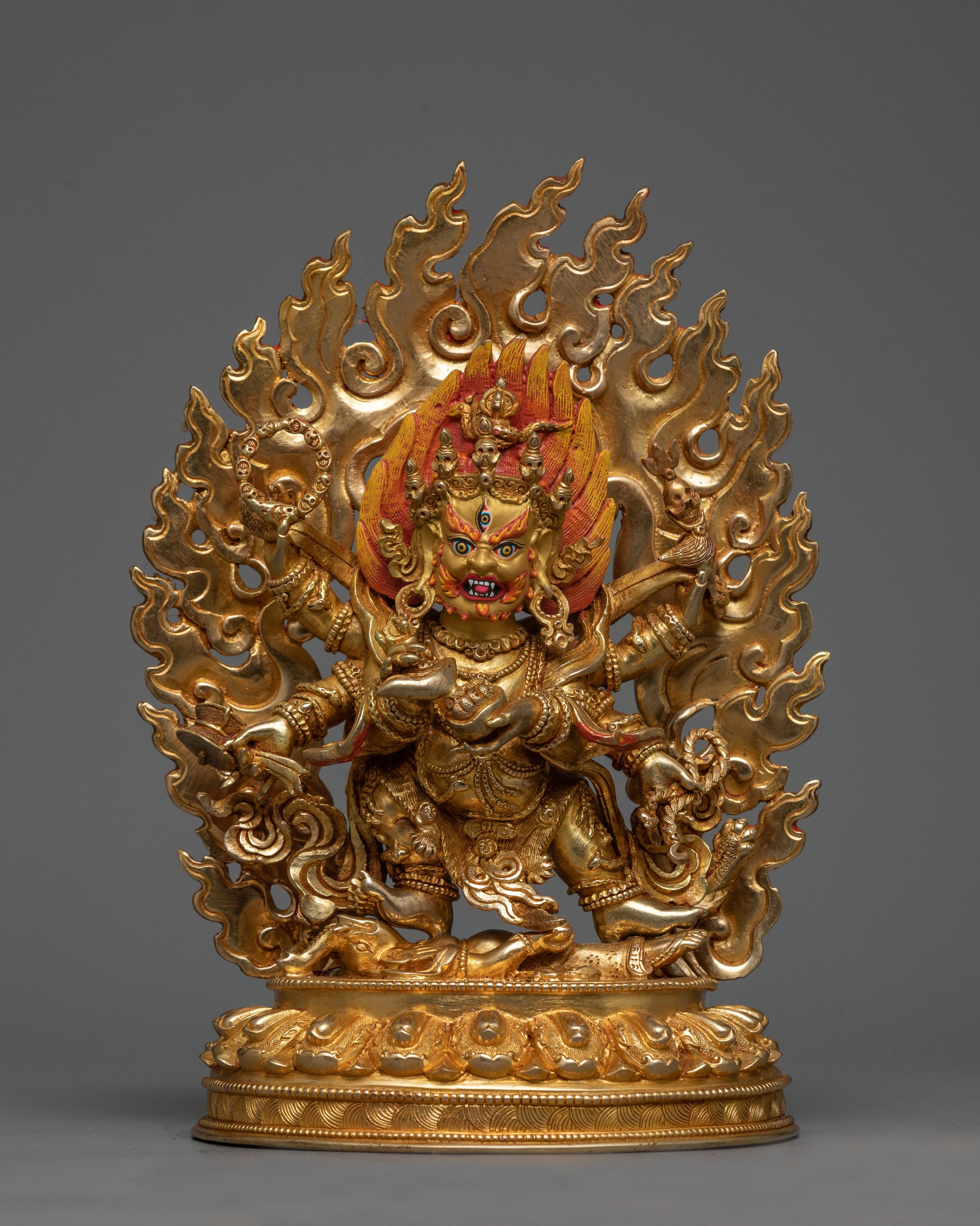The Six-Armed Mahakala figure, adorned with amazing 24K gold gilding and delicate gold and acrylic paintings, radiates golden brilliance, representing the transformational force of wisdom and compassion. His powerful body, crafted from copper, stands as a beacon of strength and fortitude, motivating practitioners to overcome barriers and realize their full potential.