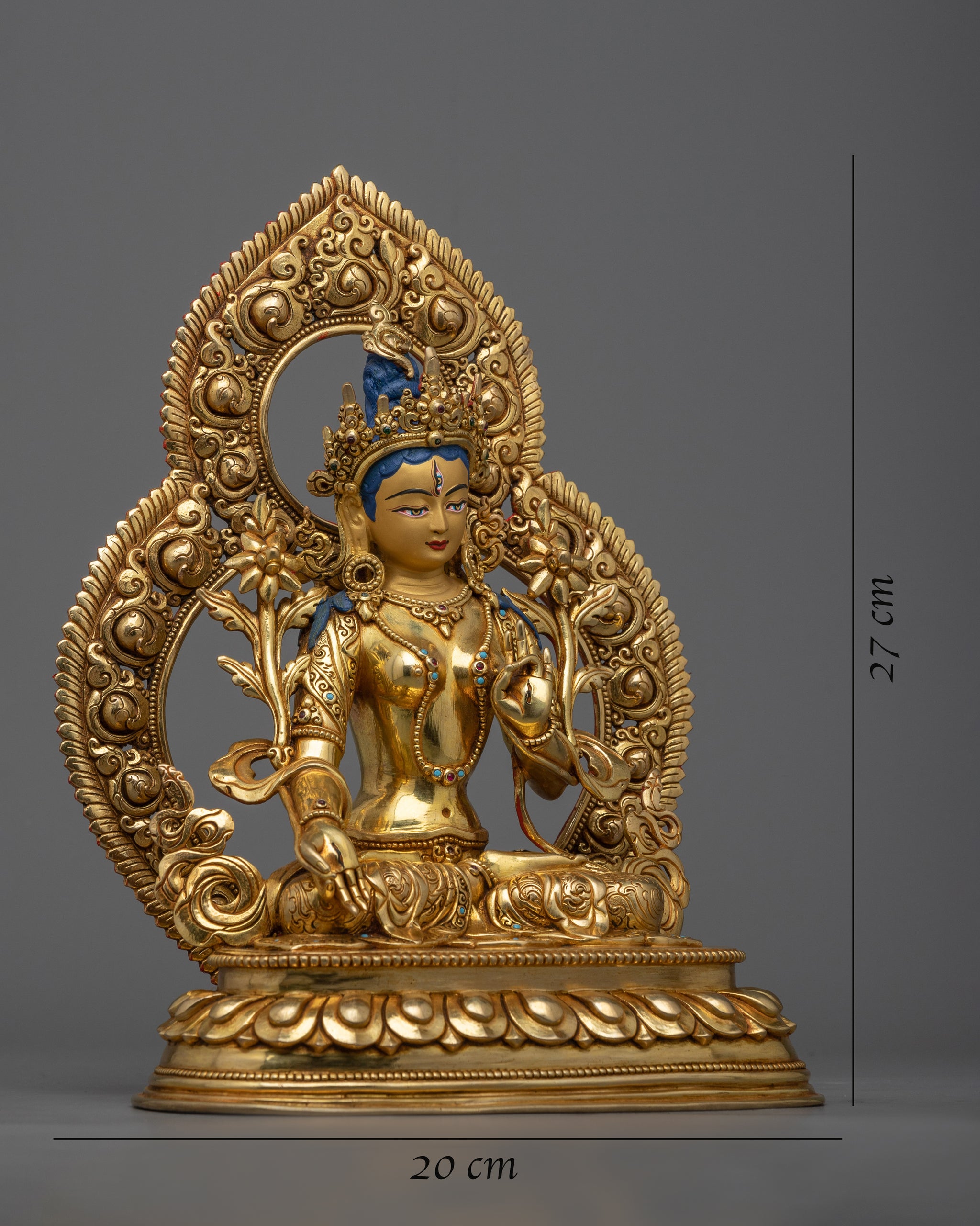 With our Gold-Gilded White Tara Statue, you may bring the personification of compassion and peace into your home. This statue is a great addition to any shrine, house, or meditation place, at 10.6 inches tall and 7.8 inches wide. The statue is made of copper, gilded with 24k gold, and adorned with 24k gold and acrylic paints, representing the long history of Buddhist workmanship and offering it a distinct, regal appearance.
