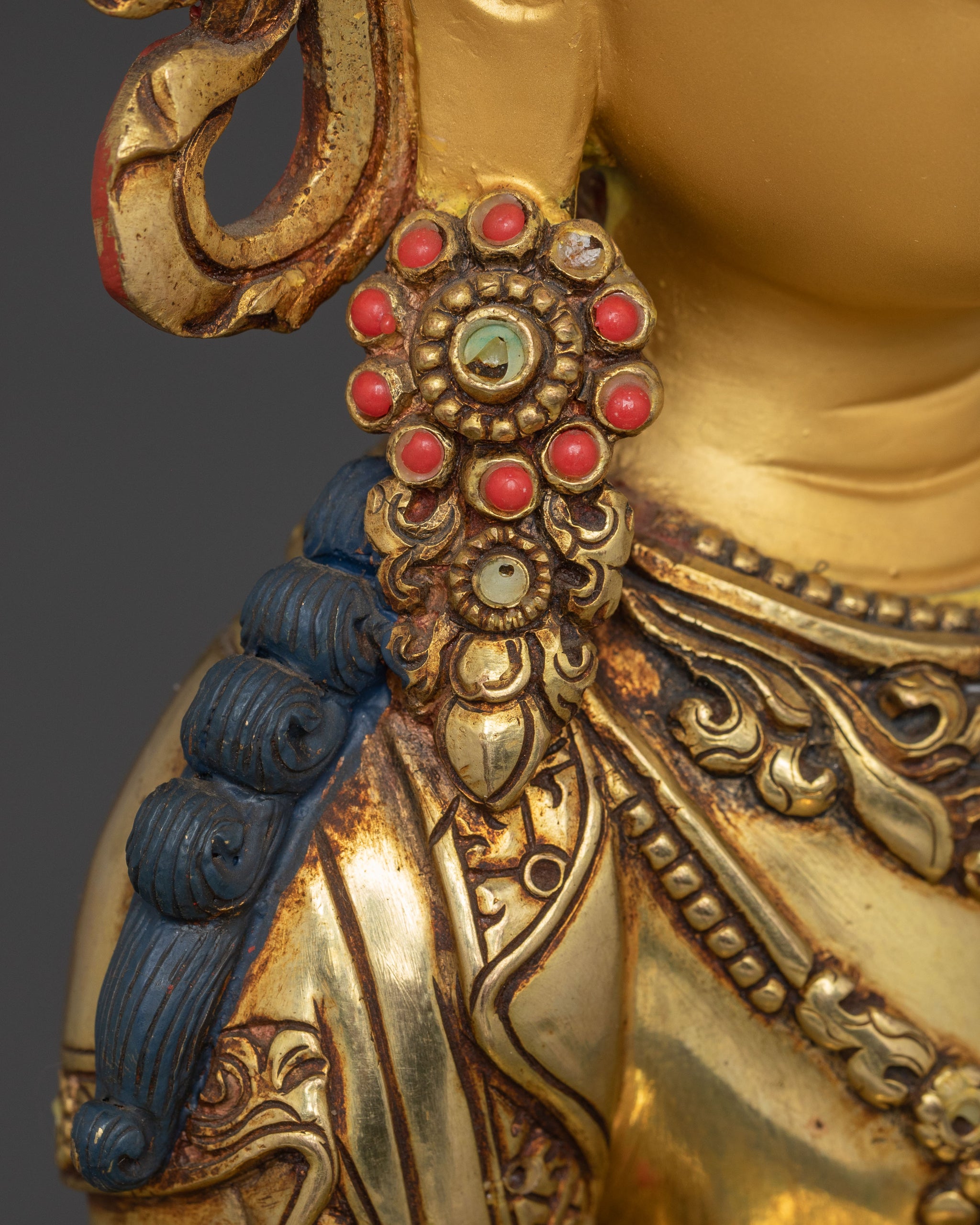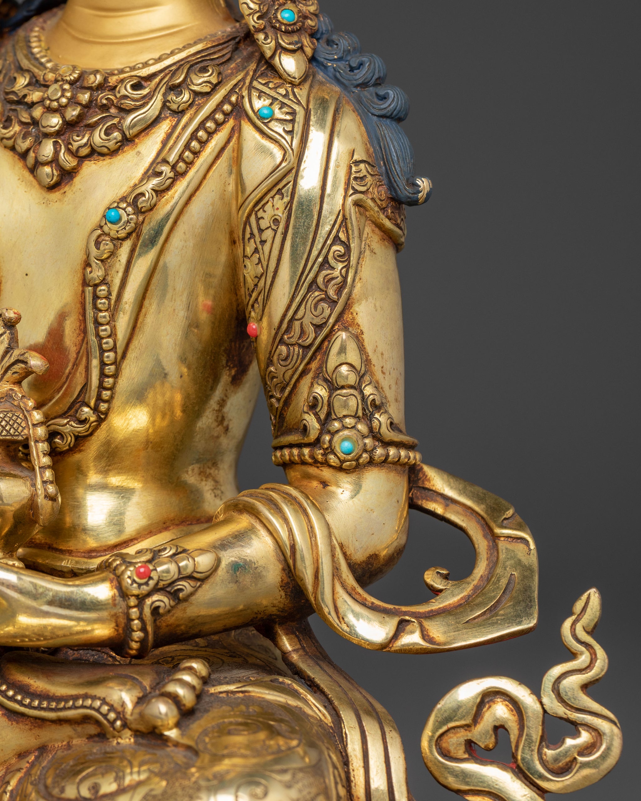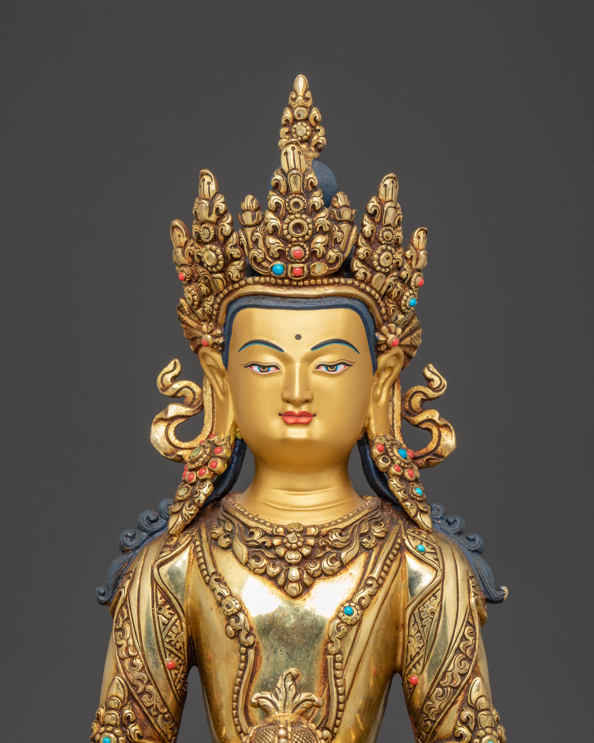 Amitayus, the Buddha of Infinite Life, symbolizes long life, vitality, and spiritual abundance. His calm expression and gentle gaze show his deep compassion for all living beings. He is seated in the vajra posture on a blooming lotus throne, holding a kalasha—the sacred long-life vase filled with the nectar of immortality. His hands rest in the dhyana mudra, the gesture of deep meditation and inner peace. Adorned with jewels and a five-pointed crown representing the Five Dhyani Buddhas, he embodies enlightened wisdom. As one of the Three Long Life Deities, along with White Tara and Ushnishavijaya, Amitayus is often included in practices that promote healing, restore life energy, and support a long and healthy life.