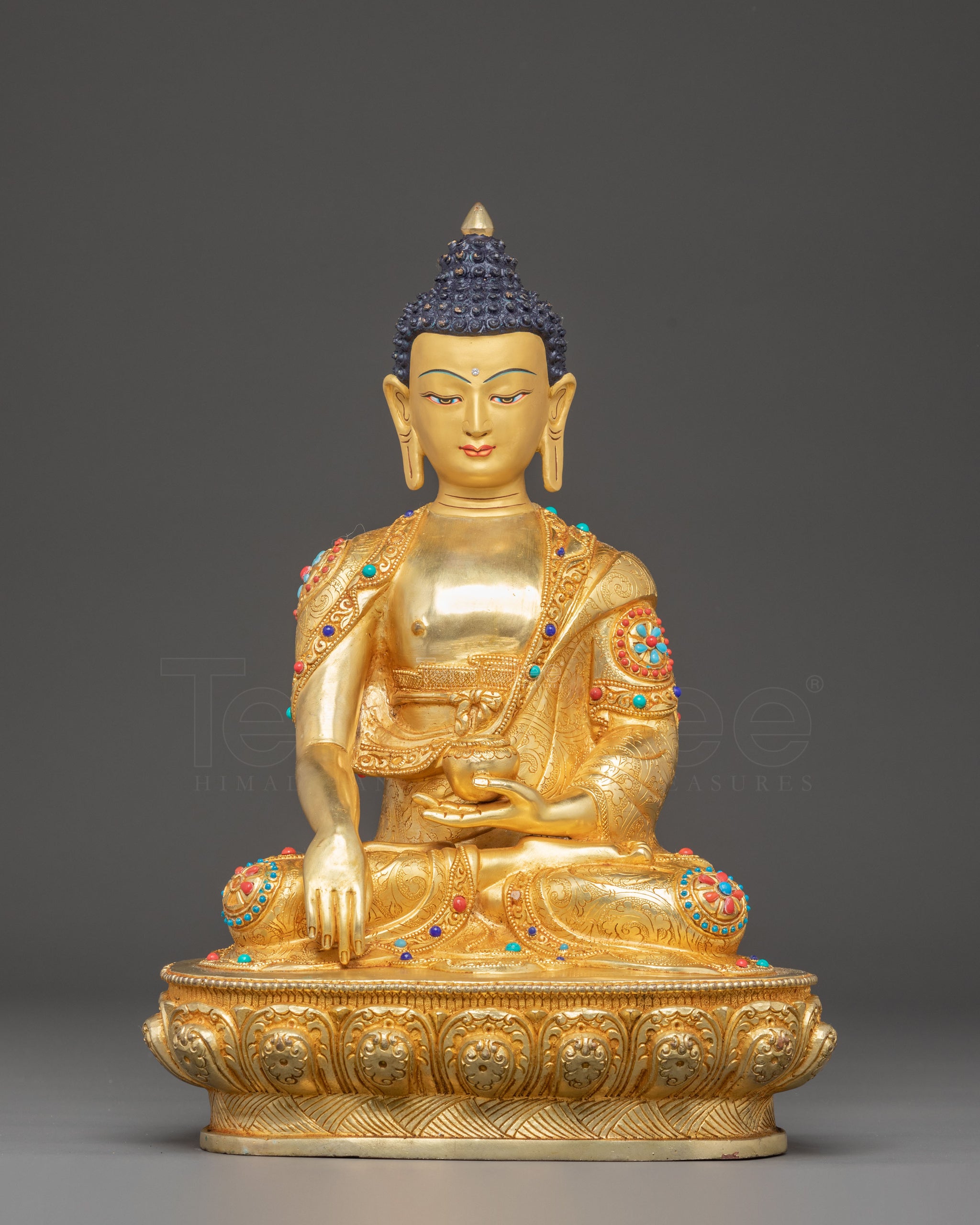 The Traditional Golden Gautama Buddha Handmade Statue measures 13.4” (34 cm) in height and 9.8” (25 cm) at the base, weighing 4.53 kg. Made from copper, covered with a triple layer of 24K gold gilding, and carved with deeply engraved carvings that produce a magnificent 3D-like effect. This sculpture, adorned with gemstones, handcrafted by expert Nepalese artisans, elegantly symbolizes Himalayan Buddhism's sacred traditions, making it an appropriate addition to altars, meditation places, or sacred collections.