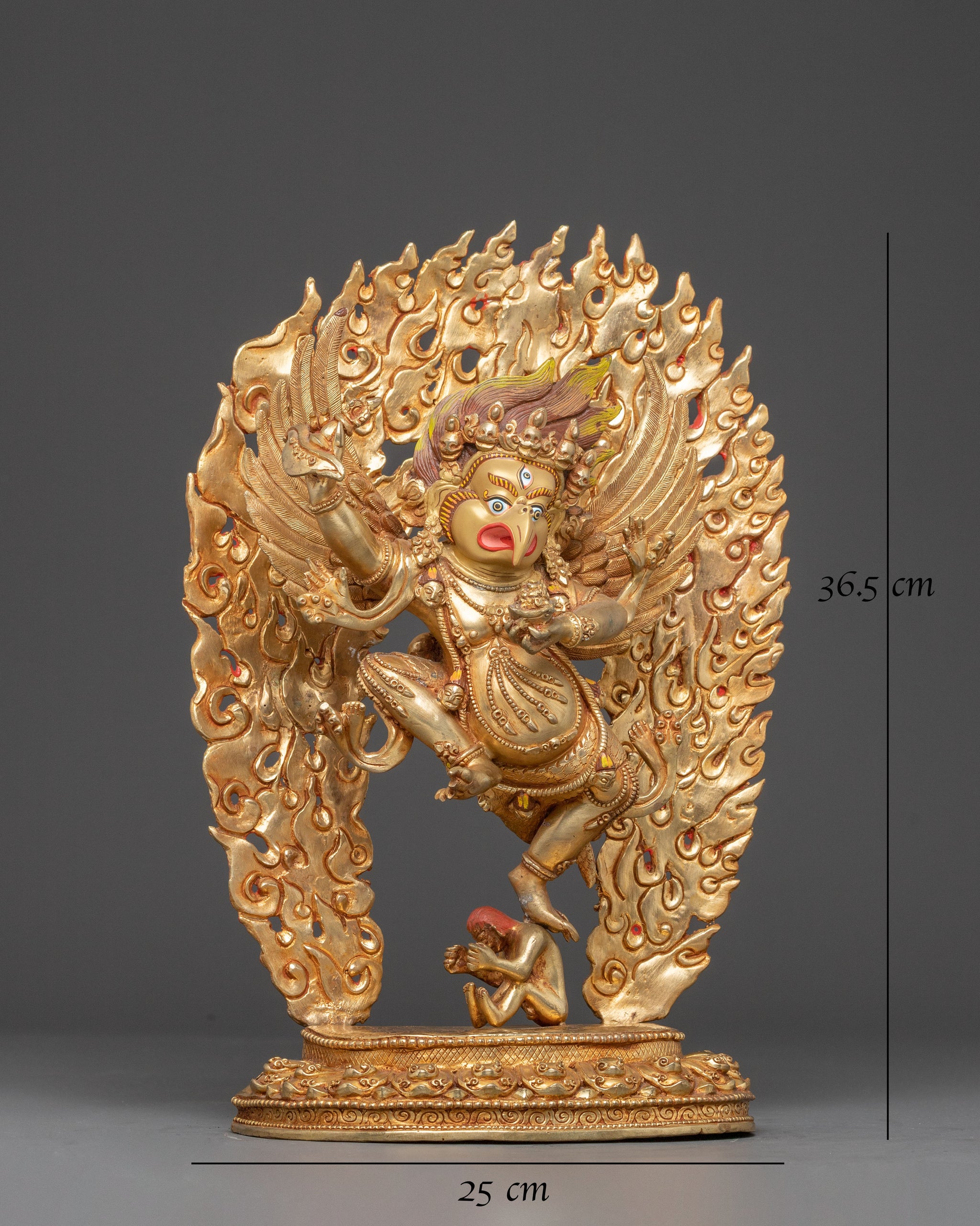 This golden handmade statue of Garuda stands at 14.4”/36.5cm in height and 9.8”/25cm at the base, weighing 4.09 kg. Made from copper and covered with a 24K gold gilding, it features deeply engraved carvings that create a magnificent 3D-like effect. This sculpture is handcrafted by expert Nepalese artisans, elegantly symbolizing the sacred traditions of Himalayan Buddhism, making it an appropriate addition to altars, meditation spaces, or sacred collections.