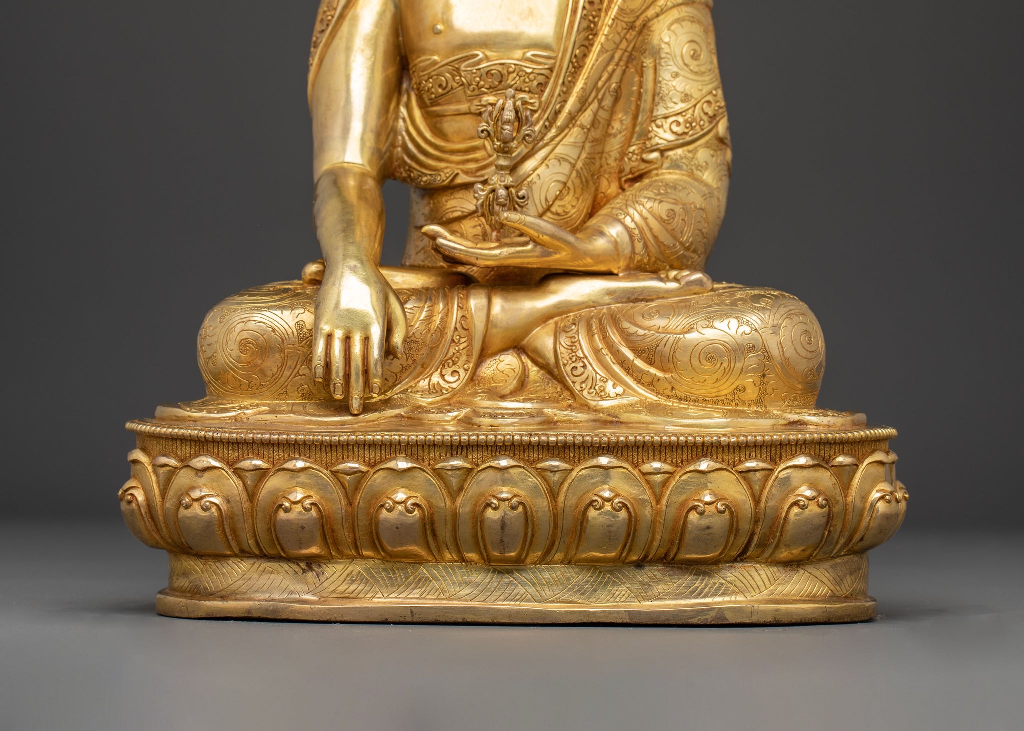 The statue depicts Mitrupa Buddha seated in padmasana (lotus posture) on a lotus base, symbolizing purity and spiritual awakening. His right hand is in Bhumisparsha mudra (the gesture of fearlessness), while his left hand holds a vajra, representing nourishment and renunciation. This serene depiction embodies unshakable calm, protection, and inner strength, making it a powerful presence for meditation, mindfulness, and spiritual refuge.