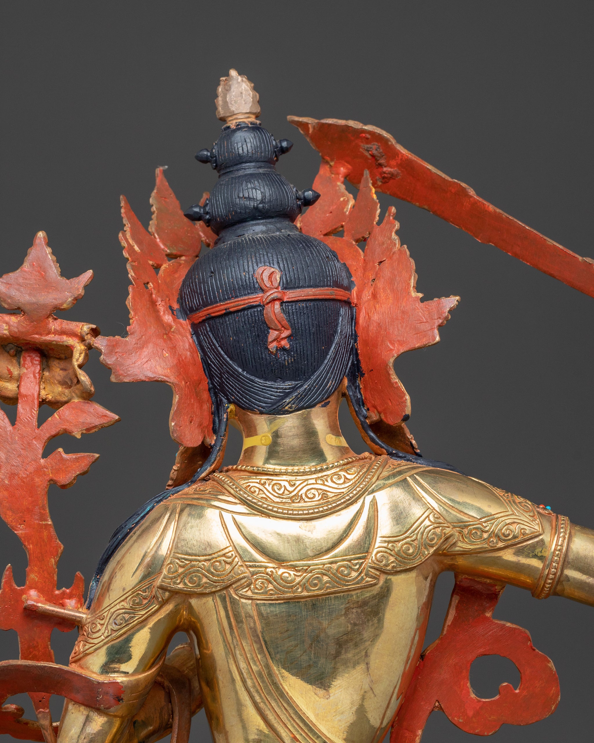 In this depiction, Manjushri is seated on a lotus base, symbolizing purity and spiritual awakening. In his right hand, he wields a flaming sword, representing the sharp power of wisdom that cuts through ignorance and delusion. His left hand performs the Vitarka Mudra, the gesture of teaching and intellectual discussion, while holding a lotus flower that supports the Prajñāpāramitā Sūtra, the sacred text of perfect wisdom. A swirling scarf gracefully flows around him, adding movement and elegance to the statue. This iconography highlights Manjushri’s role as the embodiment of enlightened insight and the guide to liberation.