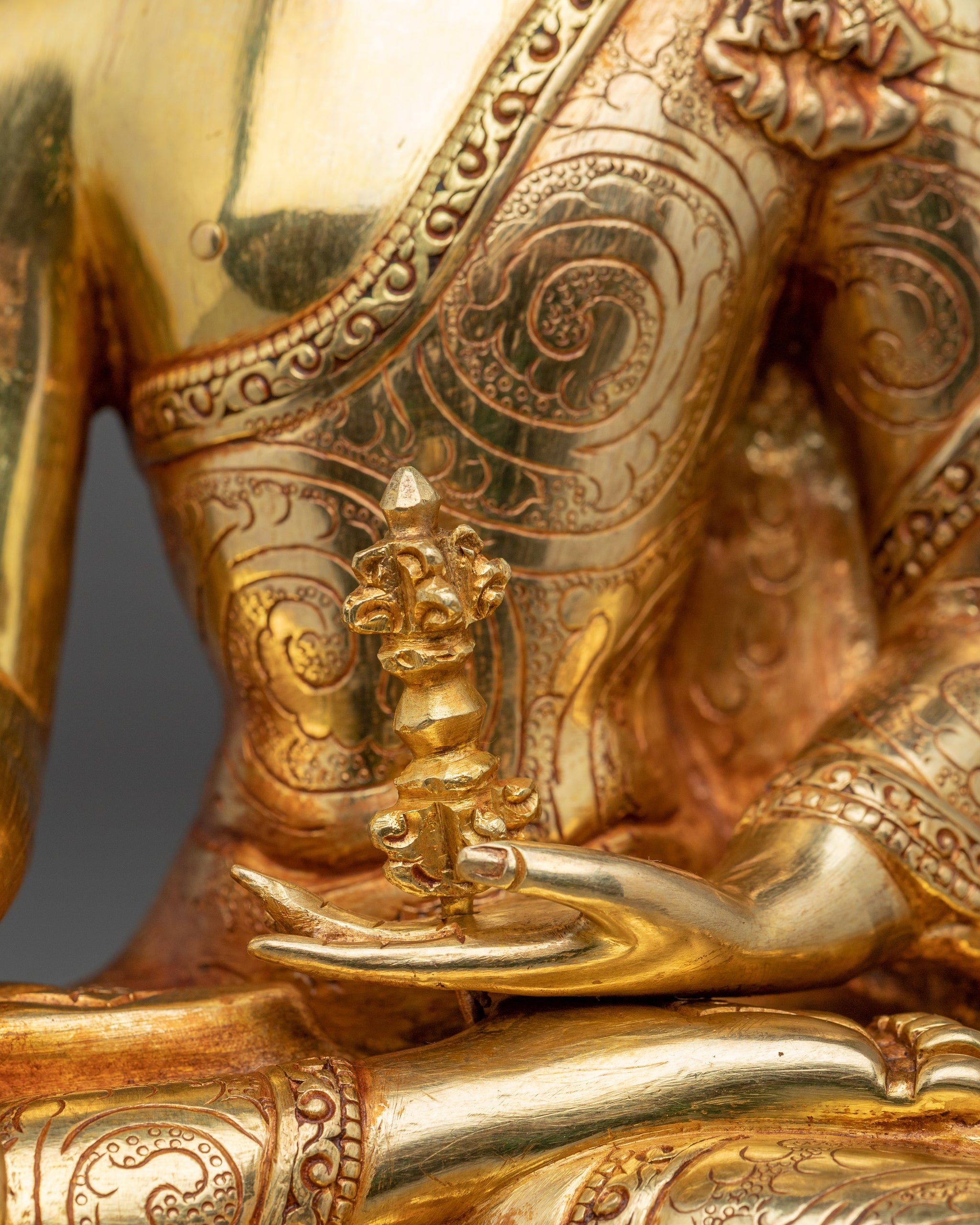 In his iconography, Gautama Buddha is shown with a calm and peaceful face, reflecting his deep inner stillness and awakened mind. He holds an upright vajra in his right hand, a symbol of unshakable truth and spiritual strength. His left hand is in the earth-touching gesture (bhūmisparśa mudrā), which represents the moment he called the Earth to witness his enlightenment. He sits in a firm meditation pose (vajrāsana) on a lotus base with a moon disc, symbols of purity and spiritual clarity. At the top of his head is the uṣṇīṣa, a raised bump that represents his great wisdom and enlightened state.