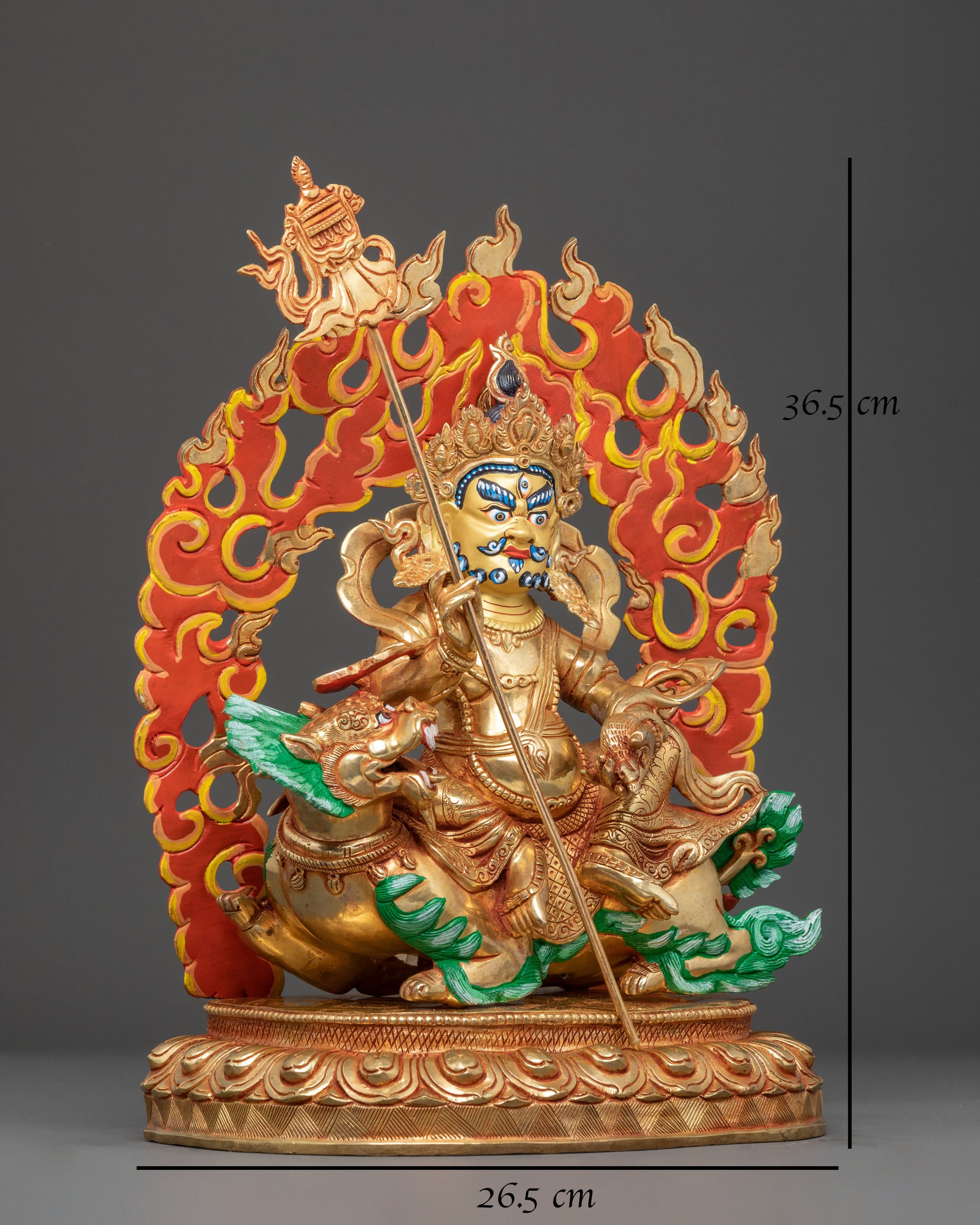 The Handcrafted Golden Namtoshe Statue, also known as the Guardian of the North, stands at 14.4 inches (36.5 cm) in height and has a base width of 10.4 inches (26.5 cm), weighing 5.95 kilograms. Made from a copper body with 24K gold gilding and acrylic paintings, it features intricate detailing that highlights its divine presence. This powerful statue represents Namtoshe’s role in protecting the Dharma and guiding practitioners on their spiritual journey. Its grandeur and craftsmanship make it an ideal centerpiece for altars, meditation spaces, or sacred interiors.