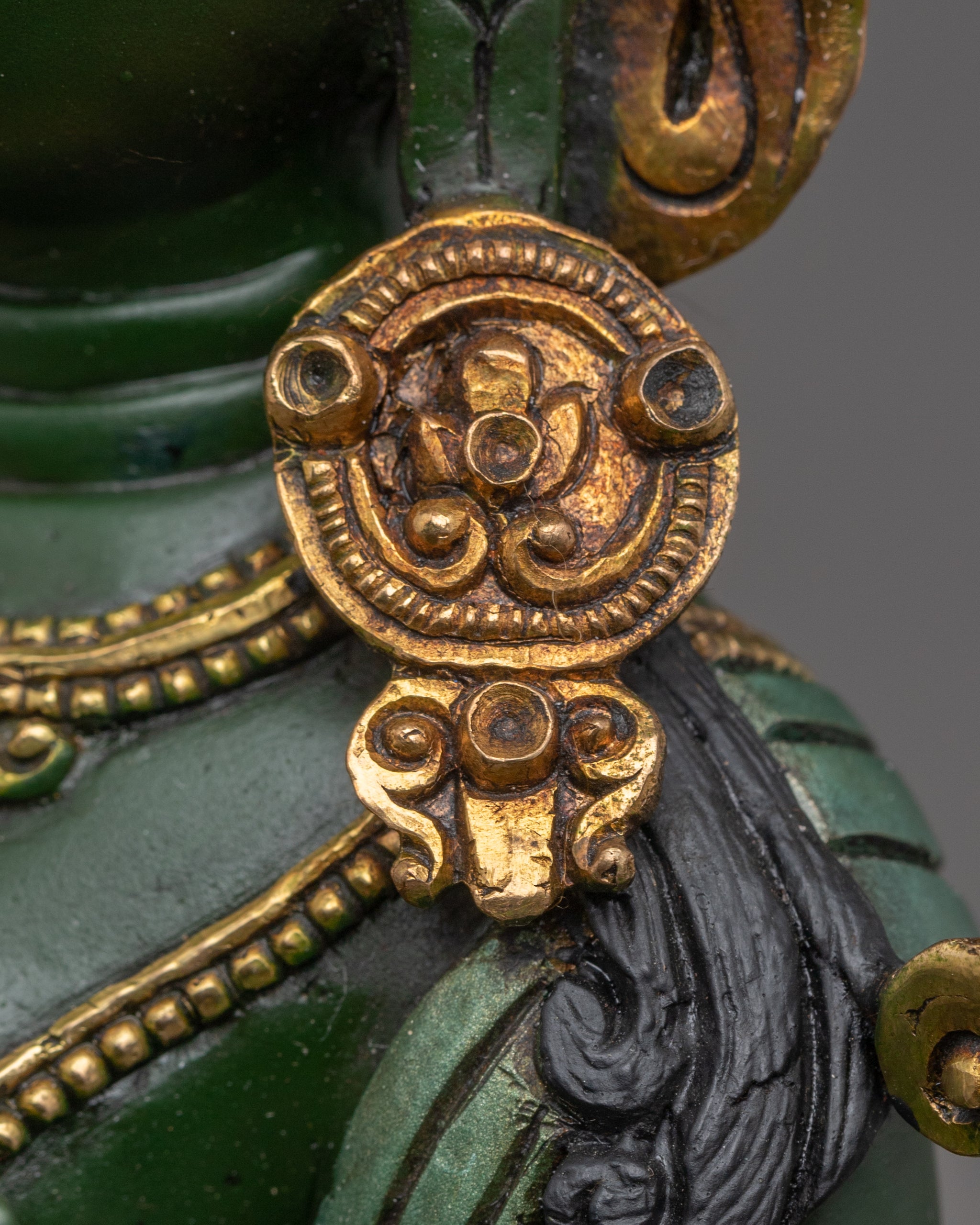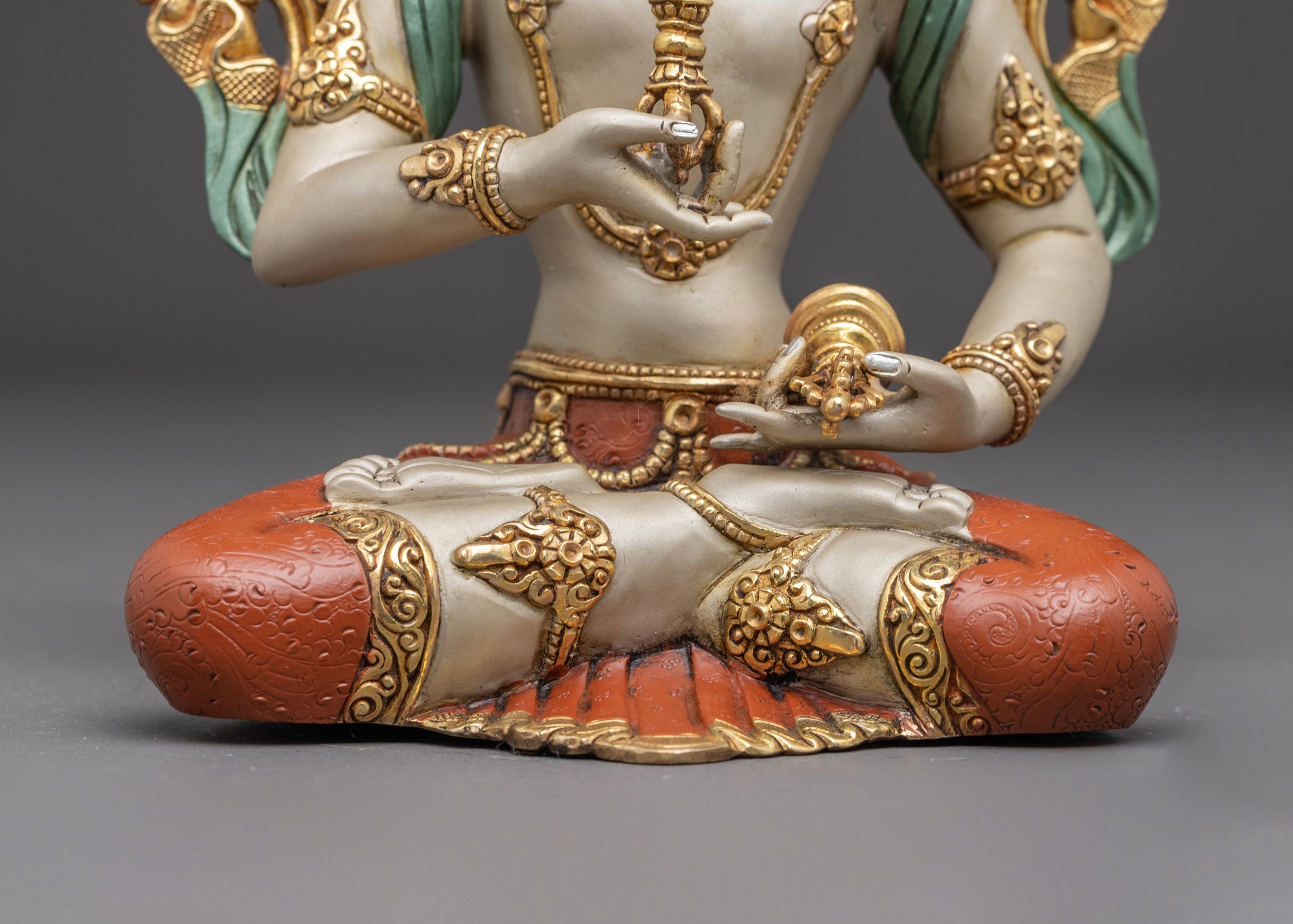Chenrezig is shown seated calmly on a lotus base, radiating compassion and serenity. He has four arms, each representing the boundless qualities of love, compassion, joy, and equanimity. His front two hands are joined at his heart in the Namaskara Mudra, holding a wish-fulfilling jewel that symbolizes pure compassion. The upper right hand holds a crystal mala, used for reciting mantras and guiding beings toward enlightenment, while the upper left hand holds a lotus flower, symbolizing purity and spiritual awakening.