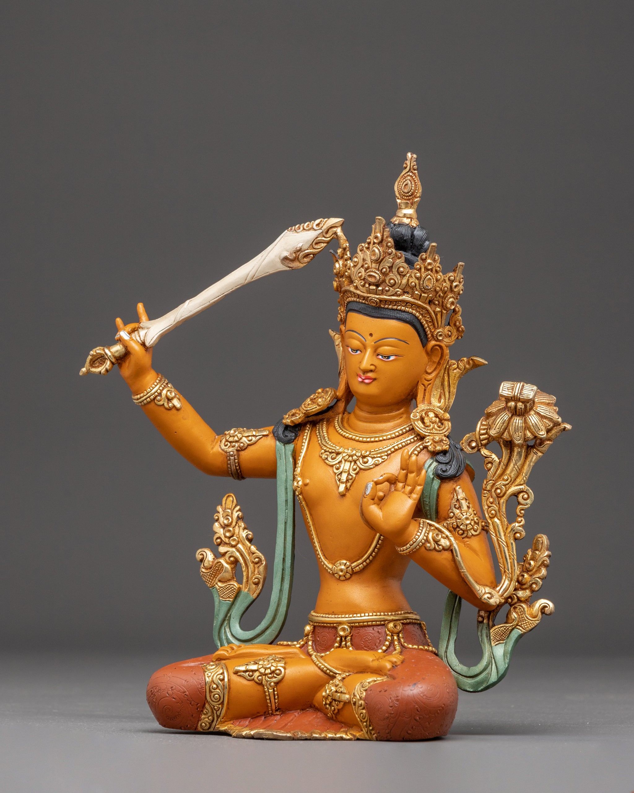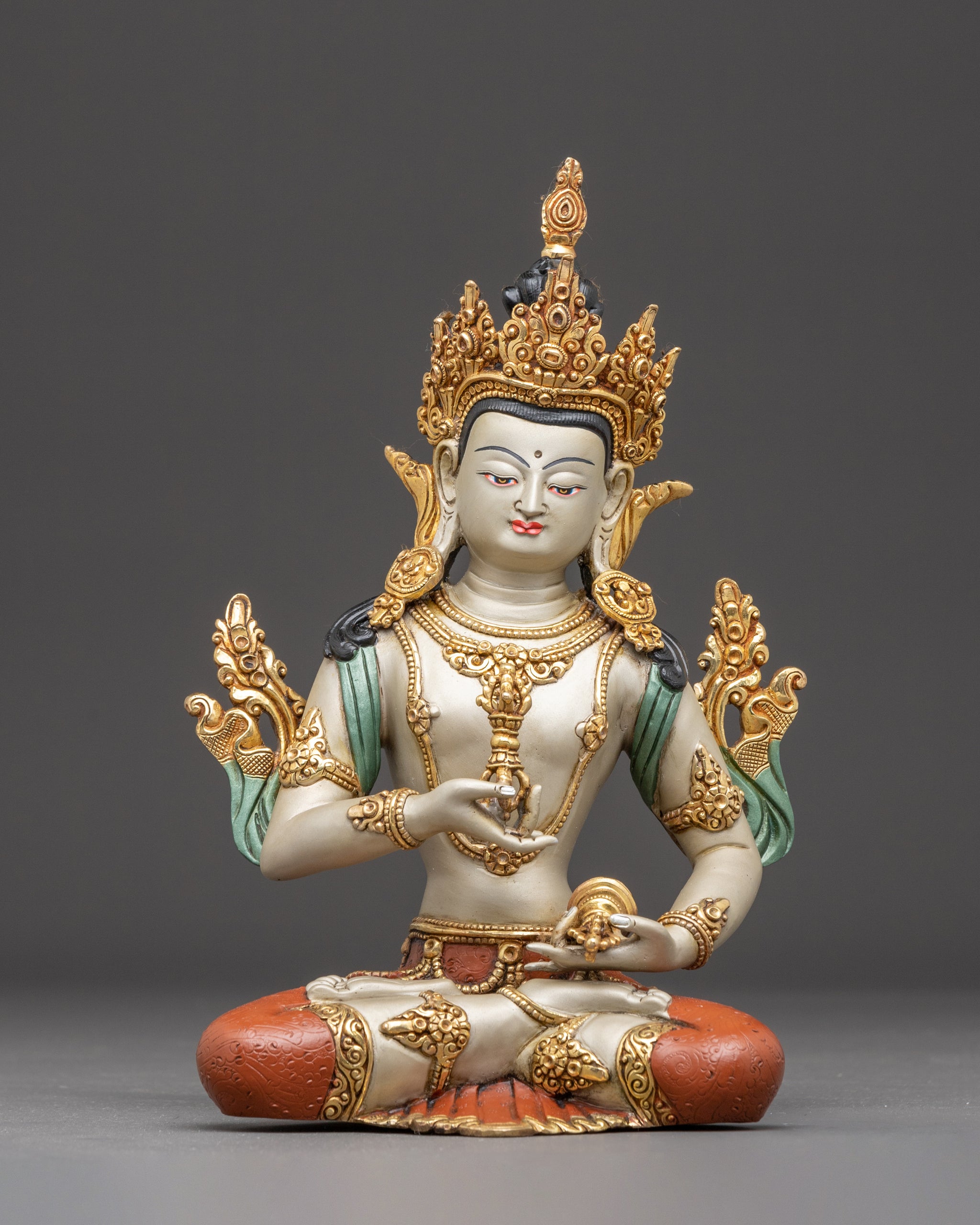 Vajrasattva is depicted seated on a lotus base in a meditative posture, symbolizing purity and spiritual transformation. His right hand holds a vajra, representing indestructible wisdom, while his left hand holds a bell, symbolizing compassion and the feminine principle. The vajra and bell together embody the union of wisdom and method, essential for spiritual purification. Adorned with flowing robes, fine ornaments, and a jeweled crown, Vajrasattva’s serene expression reflects his role in cleansing negative karma and obscurations.