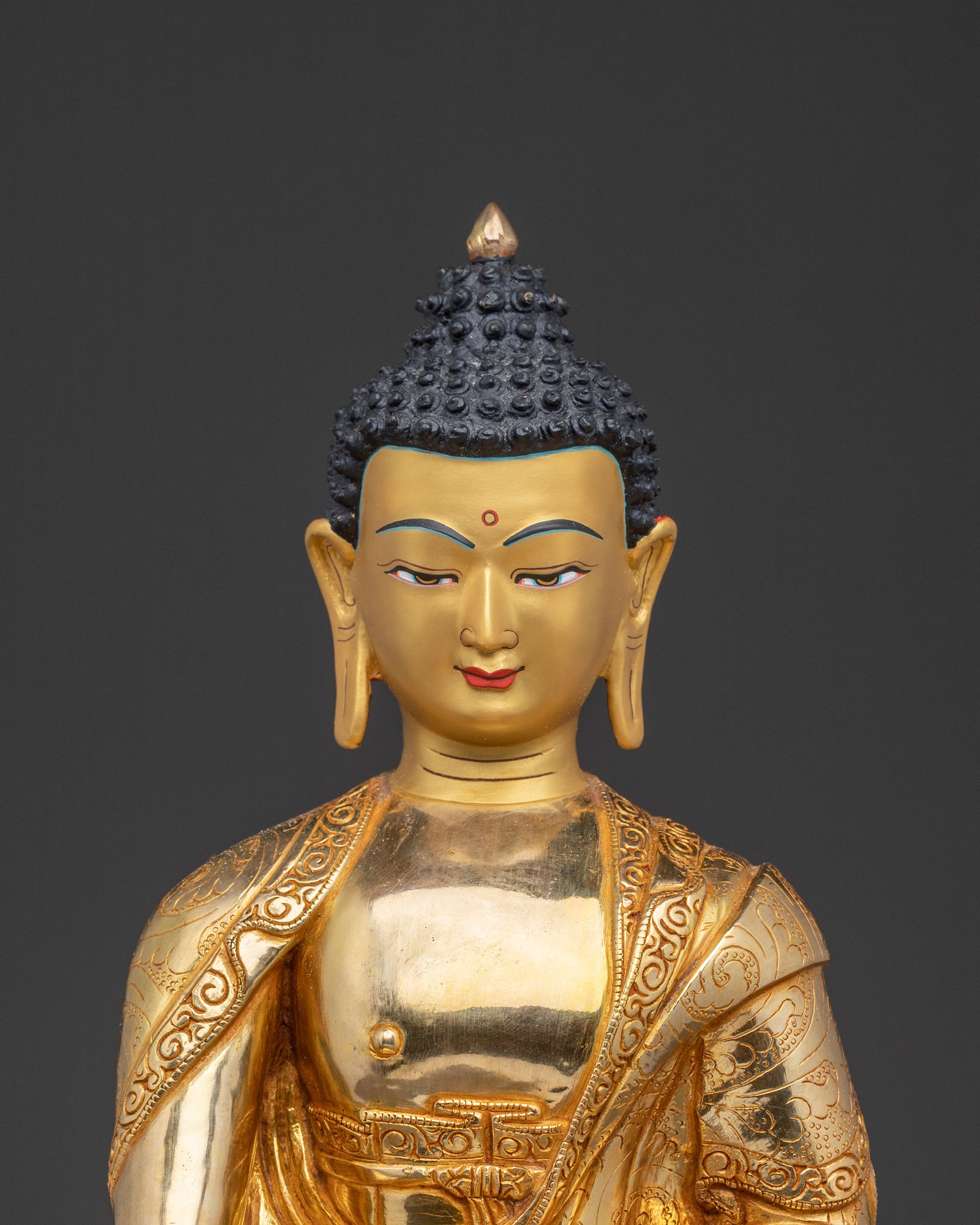 A magnificent golden Shakyamuni Buddha wisdom statue emanates profound serenity from its radiant form. Handcrafted in Nepal from a copper body, meticulously gilded with a triple layer of 24K gold and accented with subtle acrylic paintings, it stands 34.5 cm (13.5”) tall on a 25 cm (9.8”) base and weighs 3.68 kg. Deeply engraved carvings create a striking 3D effect, making it a luminous focal point of peace and spiritual calm.