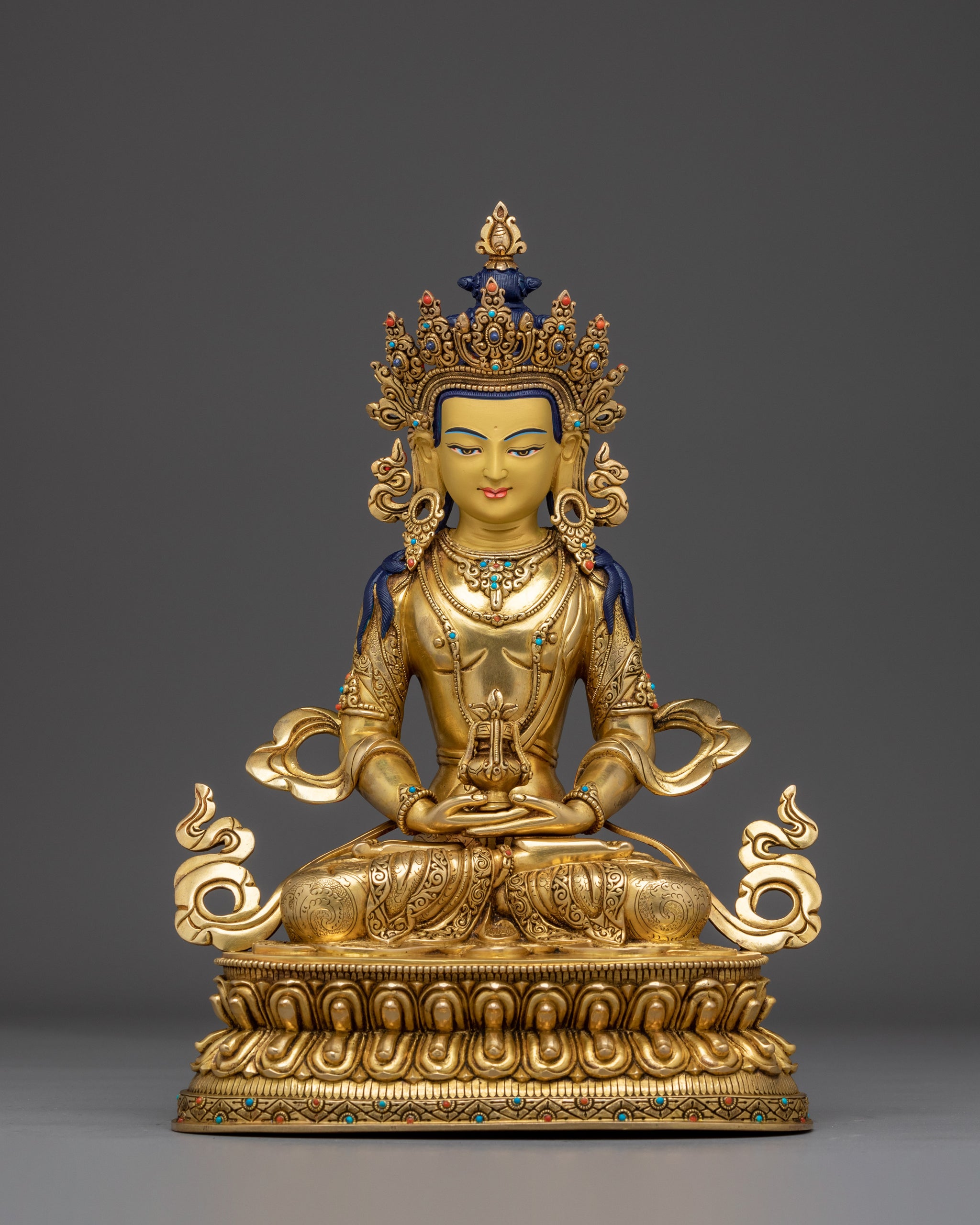 The Golden Statue of Amitayus tells a story of endless life and wisdom. Crowned with five points symbolizing the Five Dhyani Buddhas, Amitayus sits serenely in the padmasana pose atop a lotus base. His ushnisha shines as a mark of supreme insight while his hands gently cradle a kalasha brimming with the nectar of immortality, held in a peaceful dhyana mudra. A swirling scarf dances around him, radiating compassionate energy, and his long earlobes whisper tales of deep listening and renunciation. Draped in bodhisattva jewels, this statue invites you to embrace longevity, compassion, and spiritual awakening.