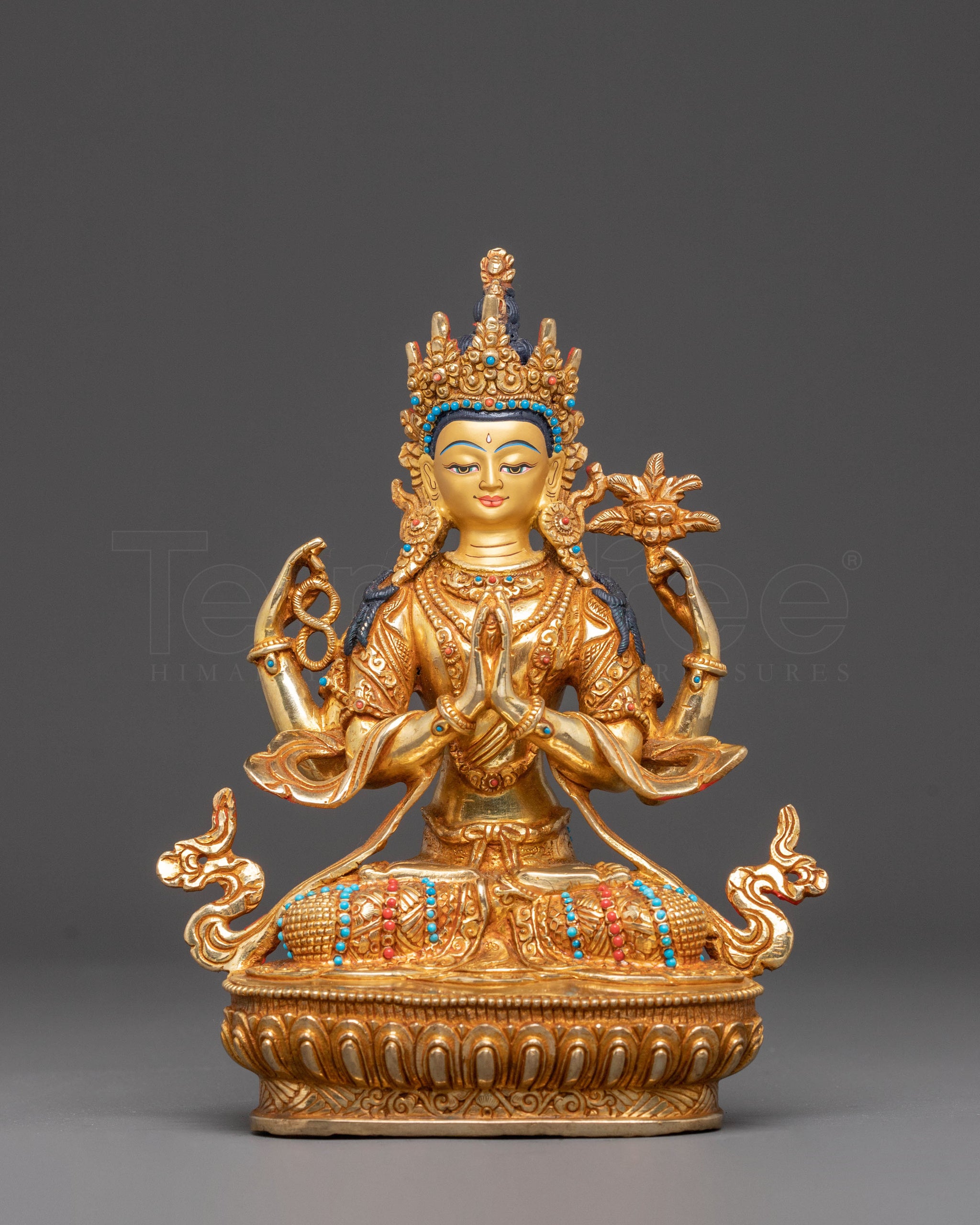 The handmade golden statue of compassion Chenrezig, also known as Avalokiteshvara, measures 9.6 inches (24.5 cm) in height and 6.7 inches (17 cm) at the base, weighing 1.59 kg. It is made of copper, covered with a triple layer of 24K gold gilding, and carved with deeply engraved carvings that produce a magnificent 3D-like effect. This sculpture, adorned with gemstones and handcrafted by expert Nepalese artisans, elegantly symbolizes Himalayan Buddhism's sacred traditions, making it an appropriate addition to altars, meditation places, or sacred collections.