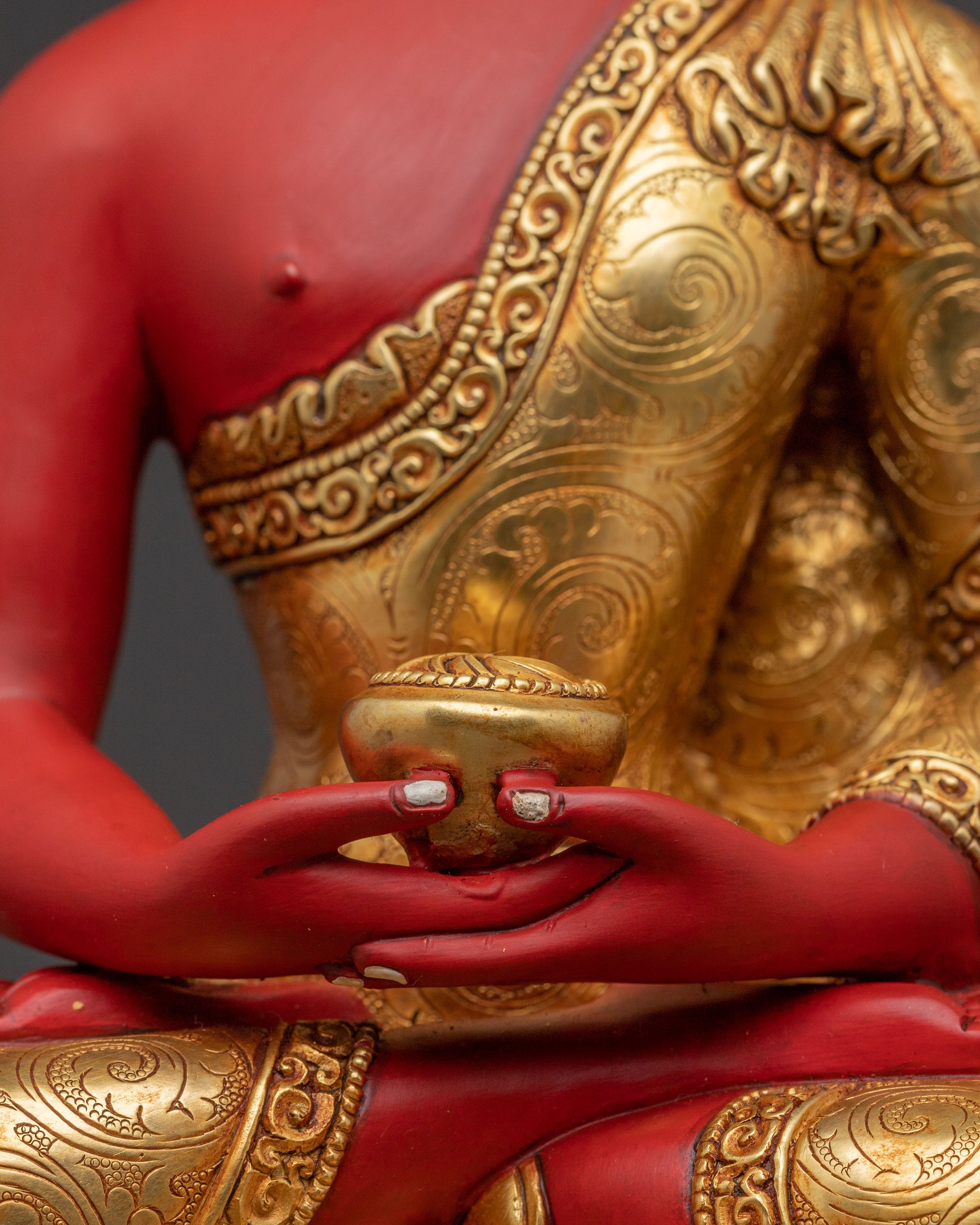 Gazing with profound peace, Amitabha Buddha manifests in this exquisite 10.4-inch statue, emanating boundless compassion. This sacred figure, handcrafted in Nepal, embodies the core essence of light and liberation. Adorned with 24K gold gilding, it brings a serene, luminous presence to any space. The Amitabha Buddha sits in the Dhyana Mudra, the gesture of meditation and concentration, symbolising profound inner peace. This posture invites introspection and connection to pure wisdom. His presence represents the aspiration for rebirth in the Pure Land, a realm of ultimate joy and spiritual development.