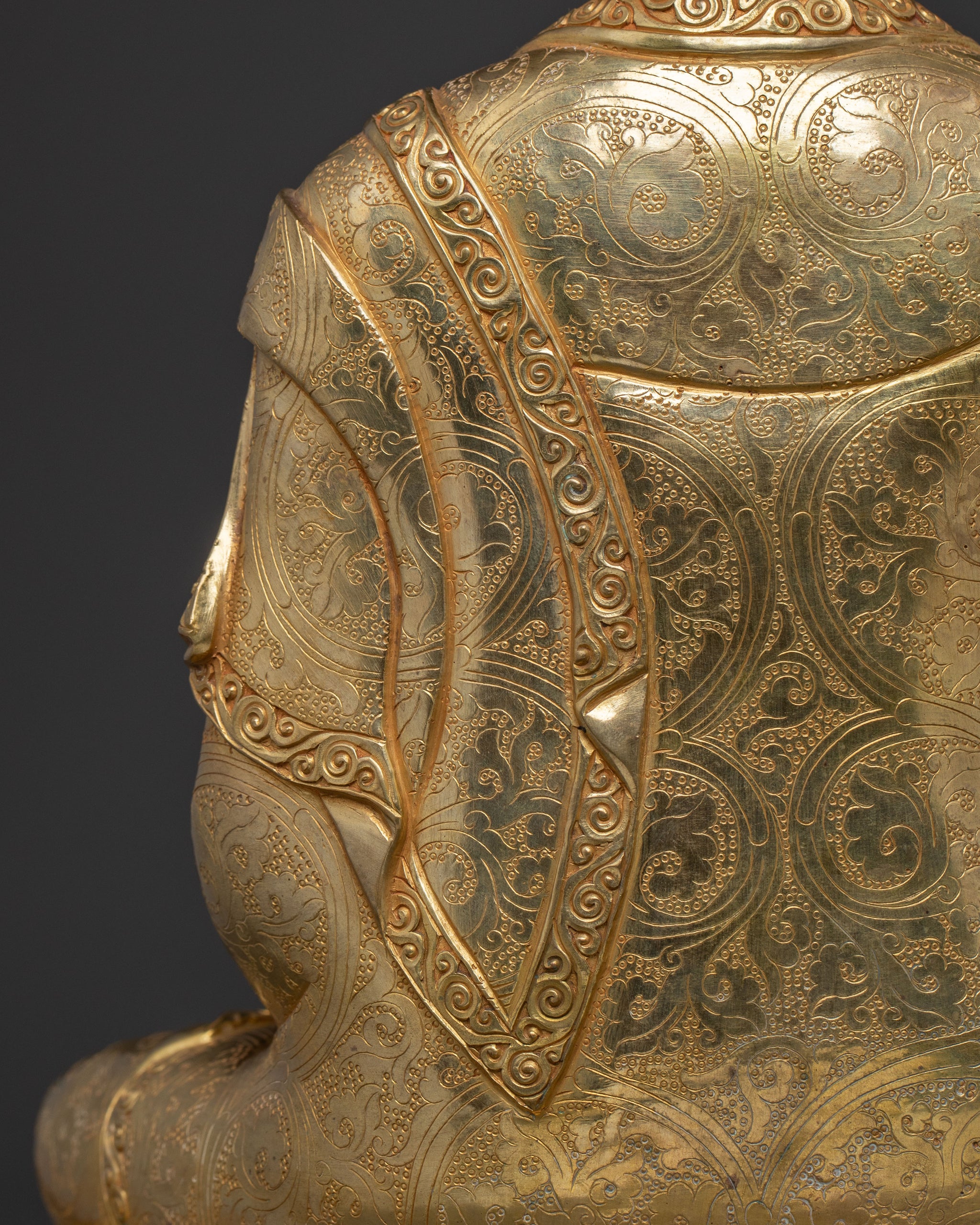 Radiating an aura of profound peace, this exquisite golden statue of Shakyamuni Buddha embodies enlightened wisdom. Handcrafted in Nepal, this solid copper statue is meticulously gilded in 24K gold, depicting the historical Buddha in deep meditation. Standing 38 cm tall with a 28 cm base, it makes a striking focal point for any spiritual space. Weighing 6.55 kg, this piece is a testament to the skilled craftsmanship of Nepalese artisans, who have fashioned it with 24K gold gilding, acrylic paintings, and a copper body, creating a serene presence that invites contemplation and tranquility into your sacred space.