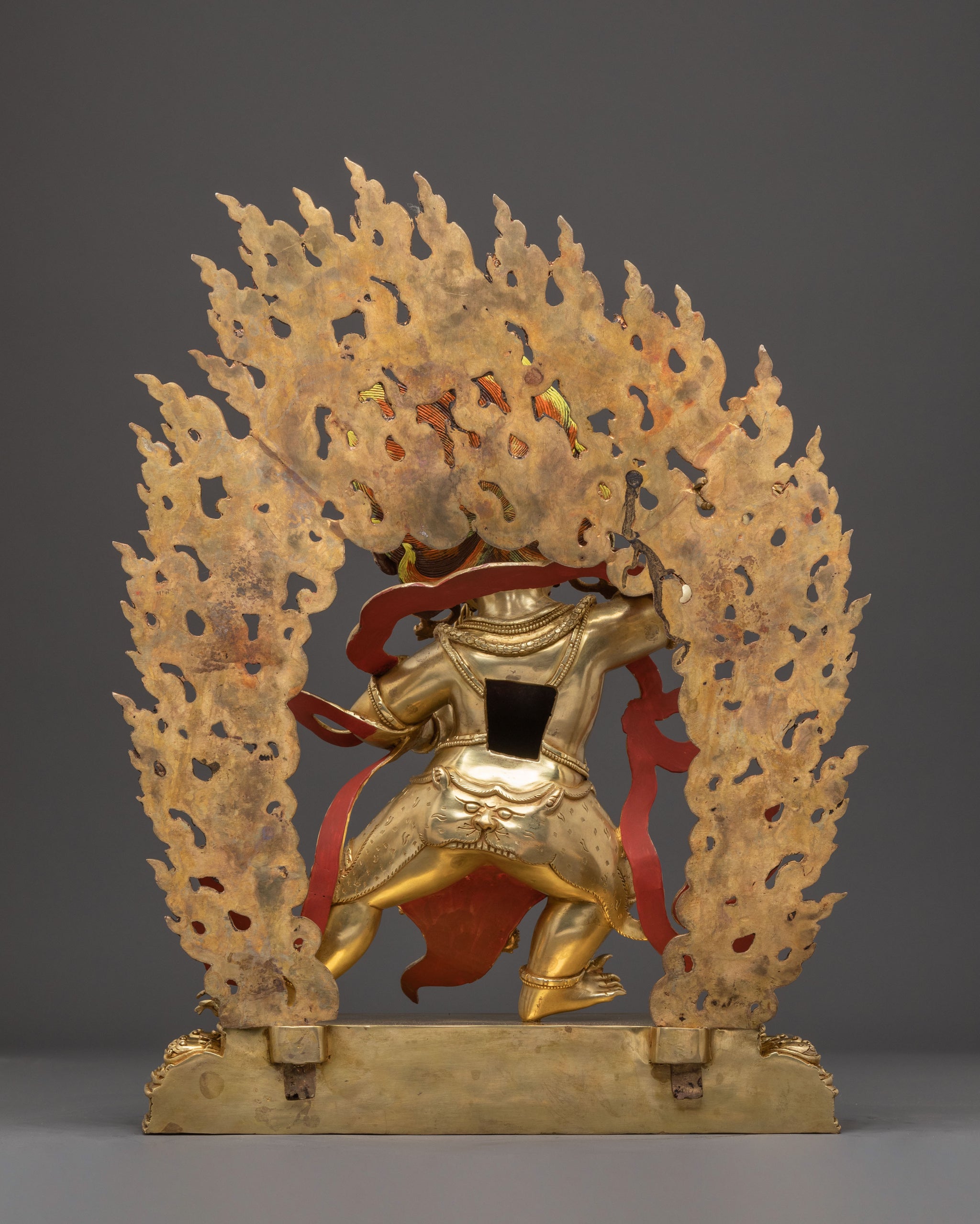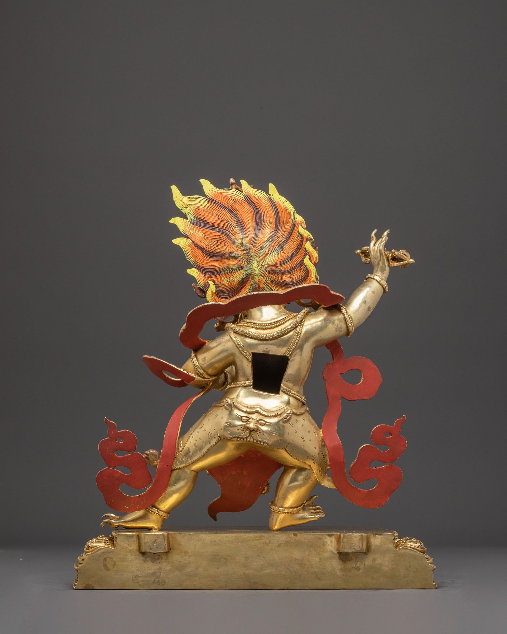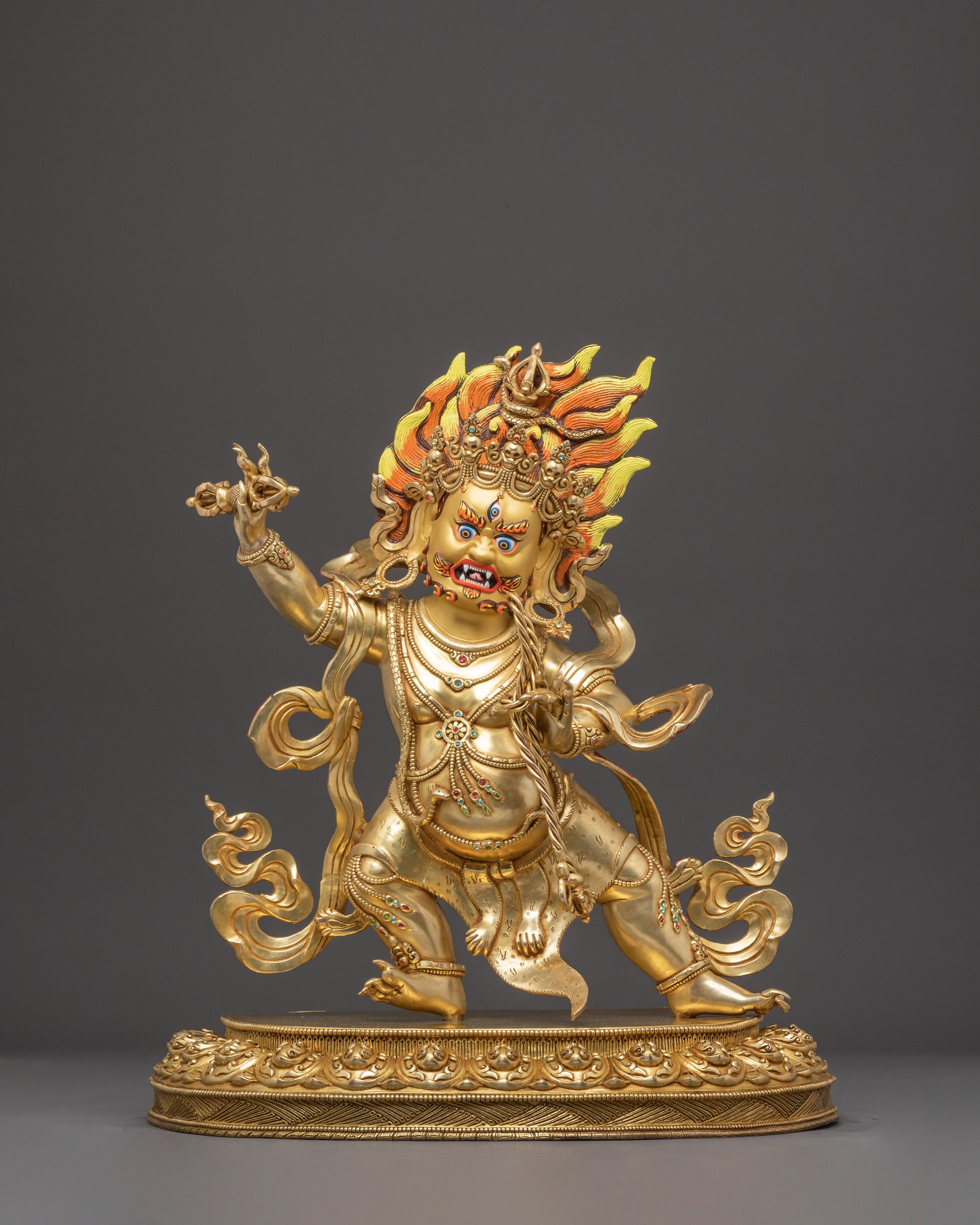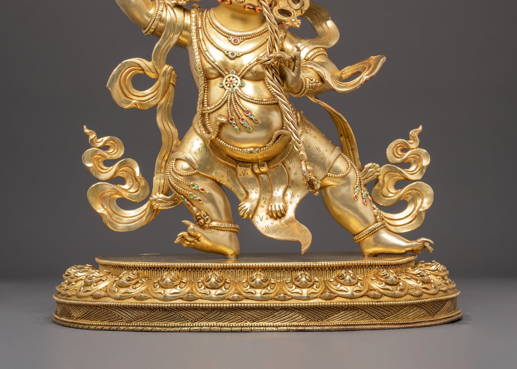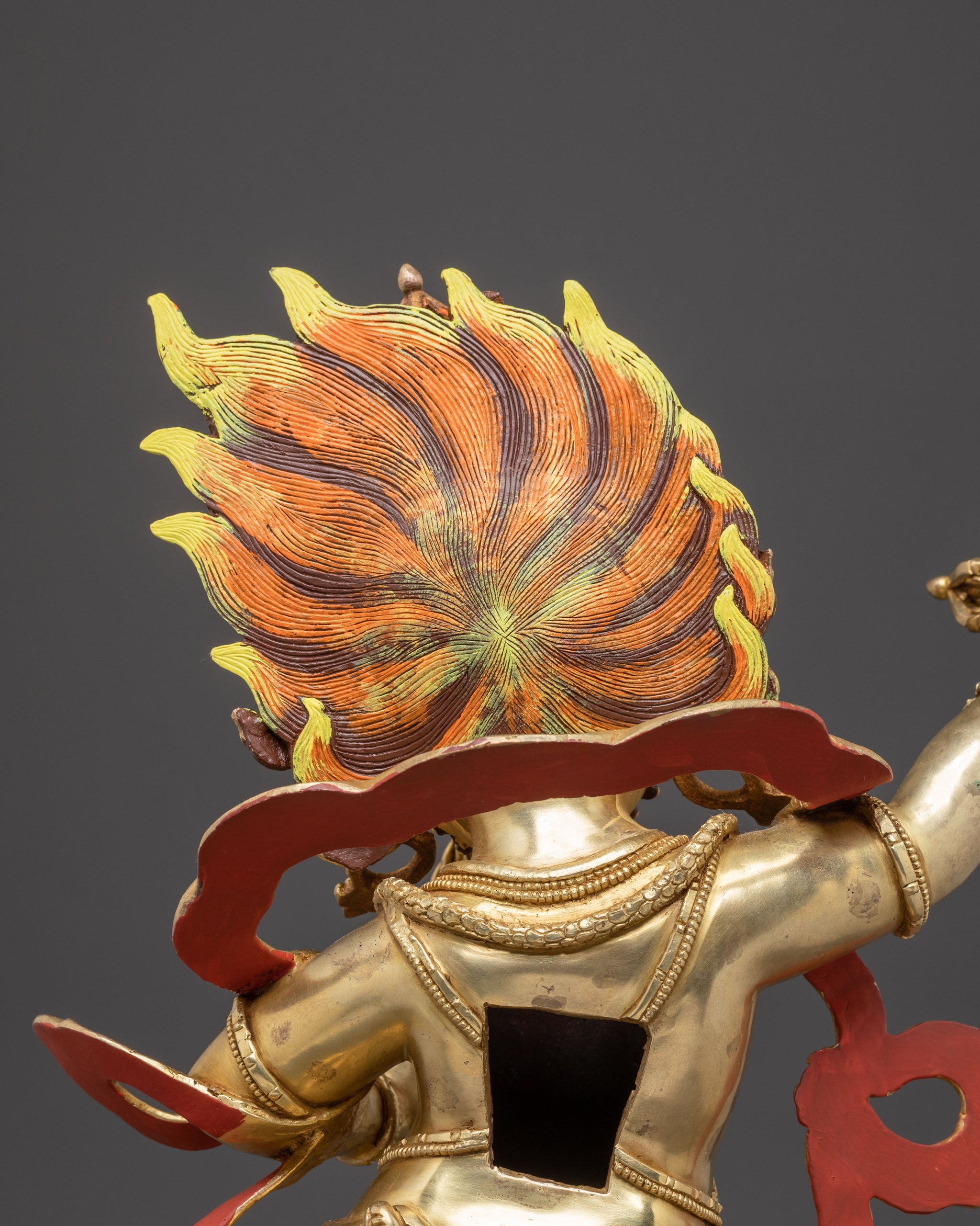 The Golden Vajrapani Statue for Sacred Spaces stands at an impressive height of 19.9 inches (50.5 cm), with a base width of 15.4 inches (39 cm), making it a commanding centerpiece for any sacred space. Crafted from a copper body, it is adorned with radiant 24K gold gilding that enhances its divine presence and spiritual significance. The combination of these high-quality materials creates a striking visual effect, reflecting both artistic mastery and deep spiritual reverence.