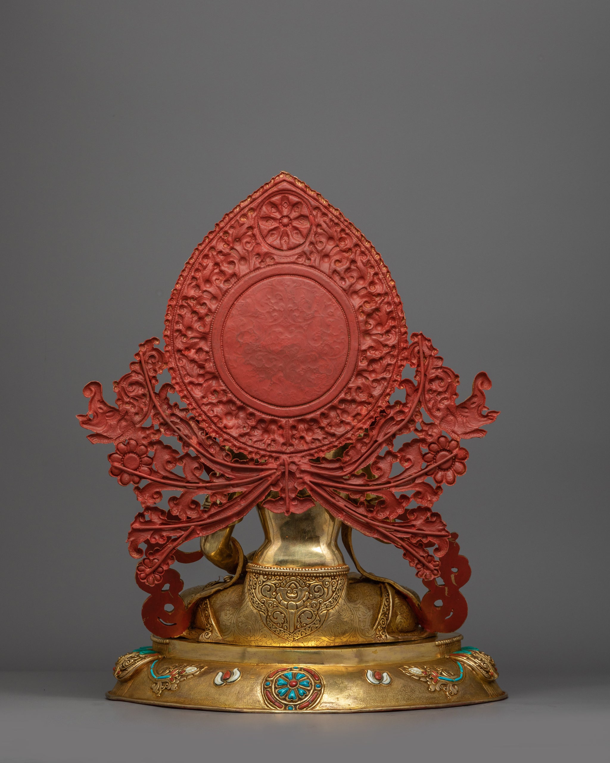 Vajrayogini is stunning. The details are amazing. It's easy to make out her facial expressions, skulls, feet, and the ring of fire around her. You can tell she's handmade. There is a consecration hole in her back.