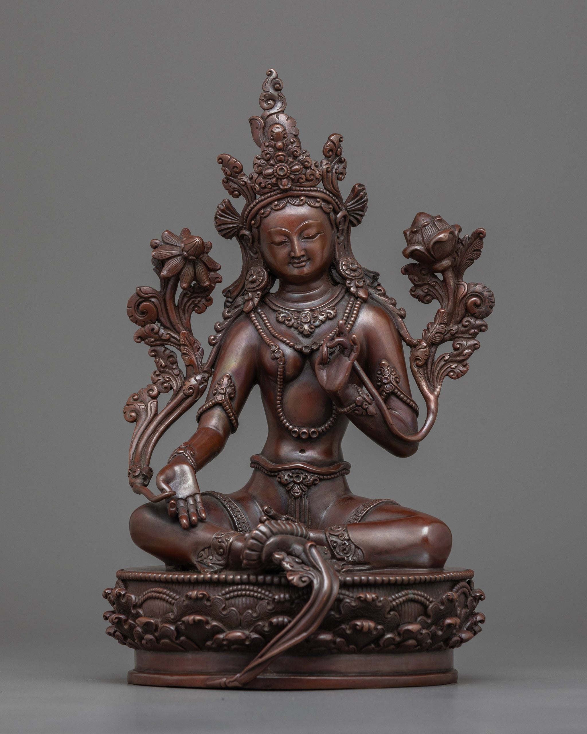 Delight in the tender embrace of the Green Dolma Statue, a revered representation of reconciliation and kindness. This gorgeous statue, made of an oxidized copper body, invites you to connect with the nourishing presence of Green Tara by radiating a sense of healing and tranquility. This monument, with its beautiful details and elegant curves, is a powerful reminder of the healing and transformational power of compassion.