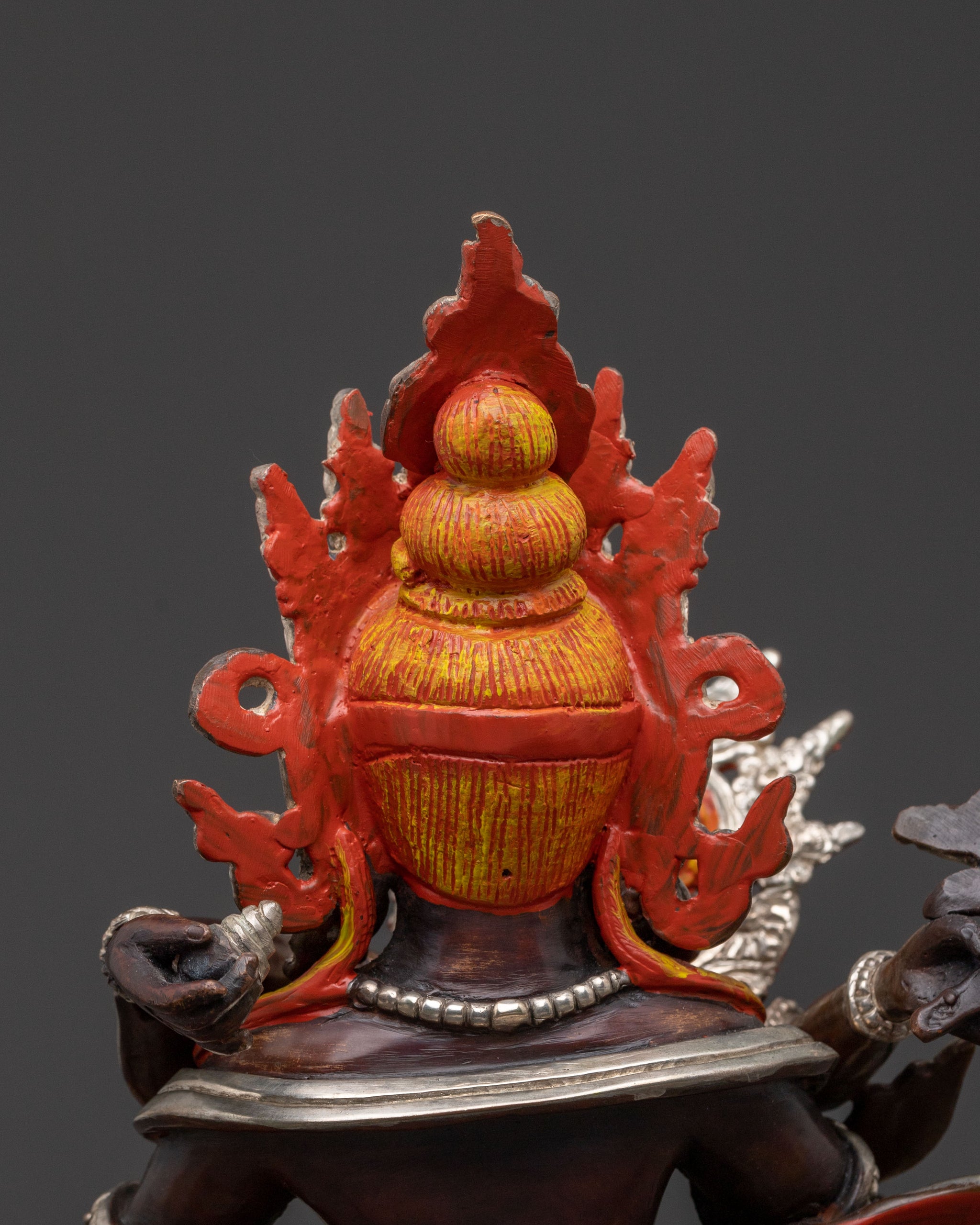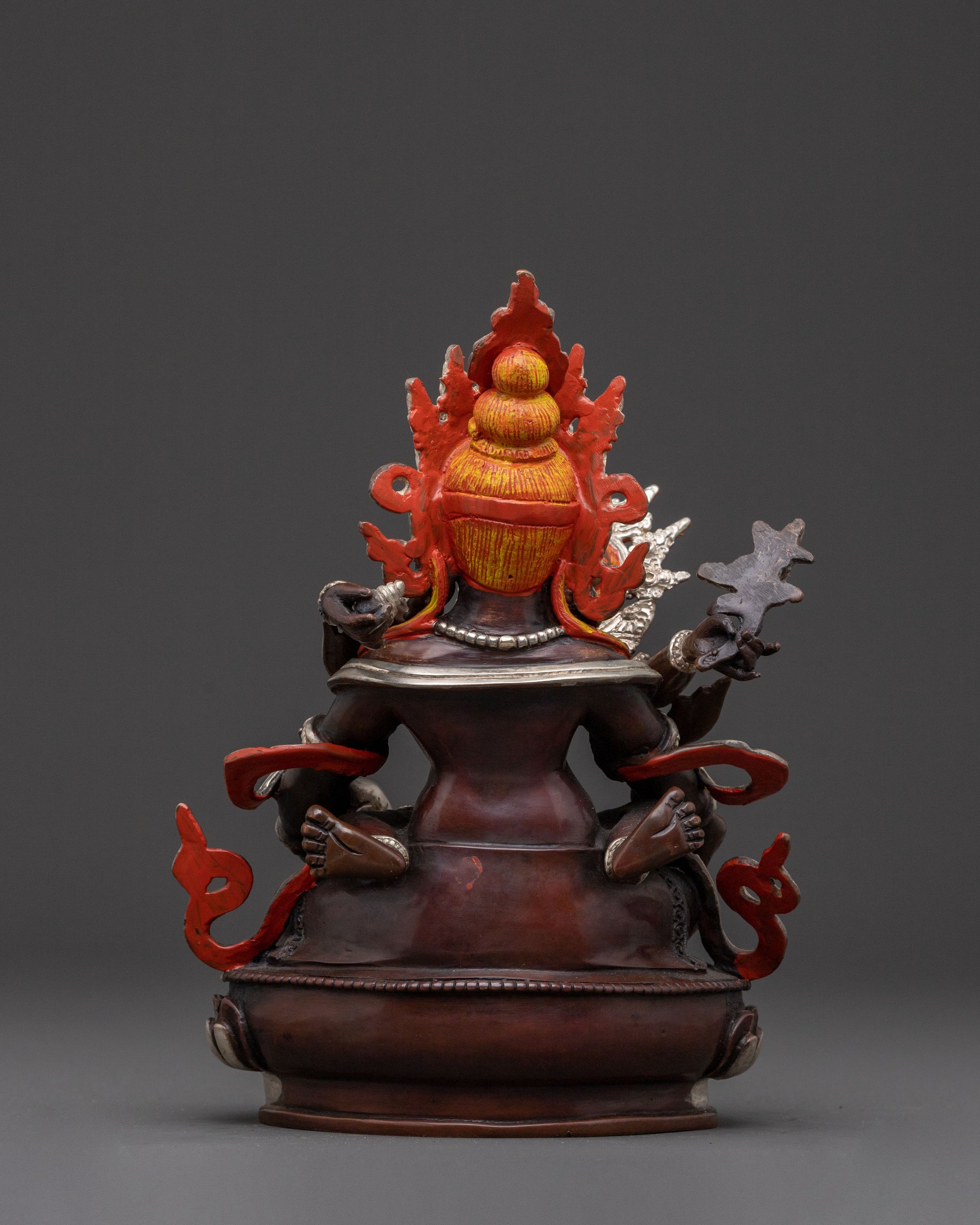This Green Dzambhala statue with consort stands at 8.66 inches (22cm) in height with a base measuring 7.08 inches (18cm) and weighs 2.32 kg. Crafted from an oxidized copper body and enhanced with silver electroplating and acrylic paintings, this piece reflects refined Himalayan metal artistry. Handcrafted in Nepal by skilled Newar artisans, it is ideal for personal altars, small shrines, or sacred meditation spaces.