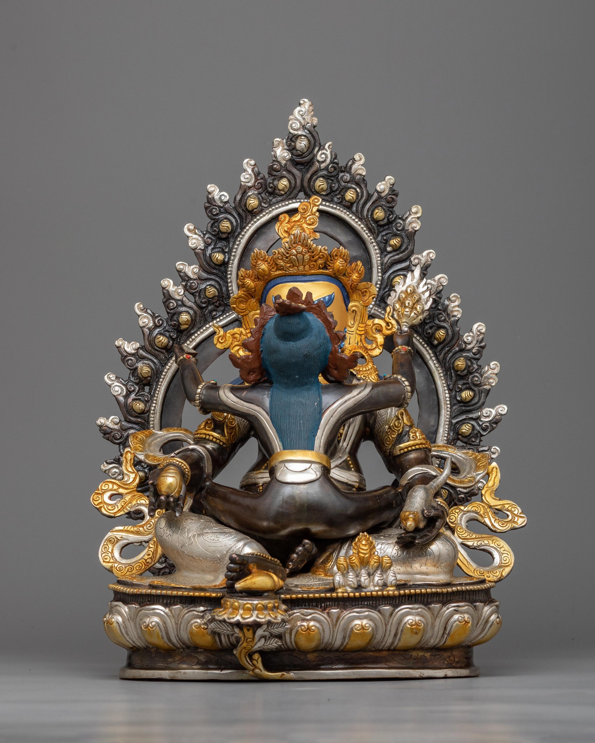 The sculpture is expertly fashioned from oxidized copper, which was chosen for its long-lasting beauty and traditional resonance. It is lavishly gilded in 24K gold and plated in silver, producing a remarkable visual contrast that showcases the delicate details of Green Dzambhala and his spouse. The elaborate gold and acrylic paintings provide color and depth to the statue, highlighting the deities' regal presence and profound symbolism.