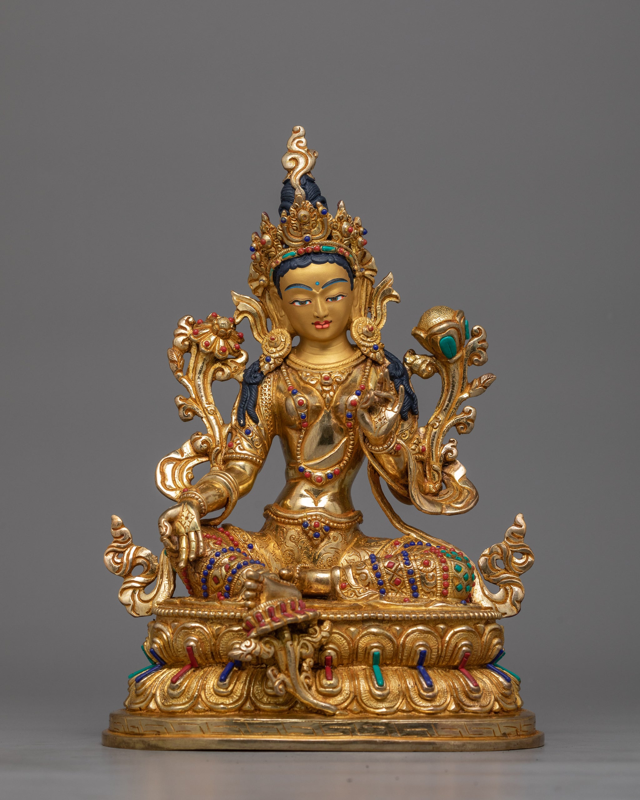 Experience the Serene Majesty of the Green Tara Beautifully Gold-Gilded Statue