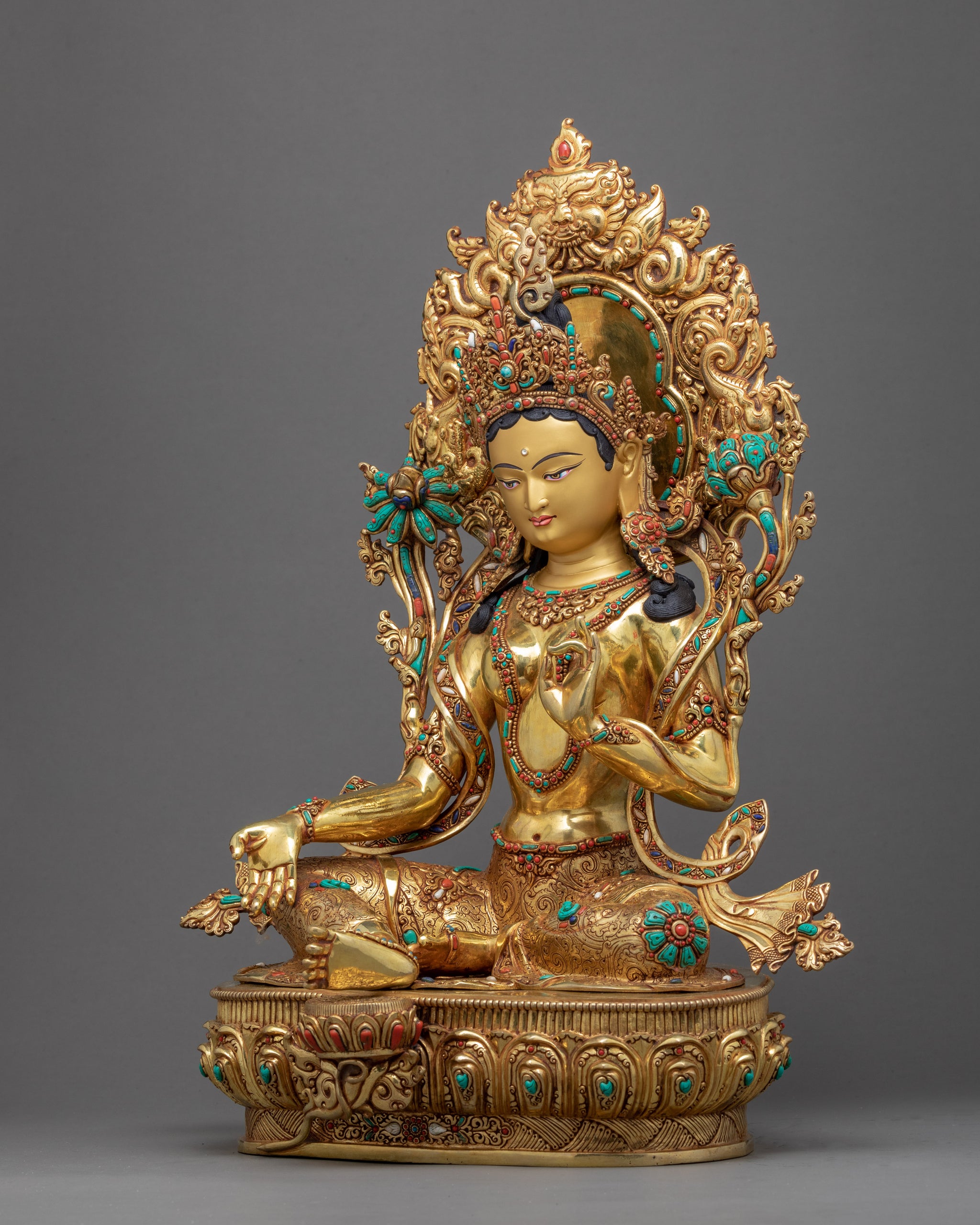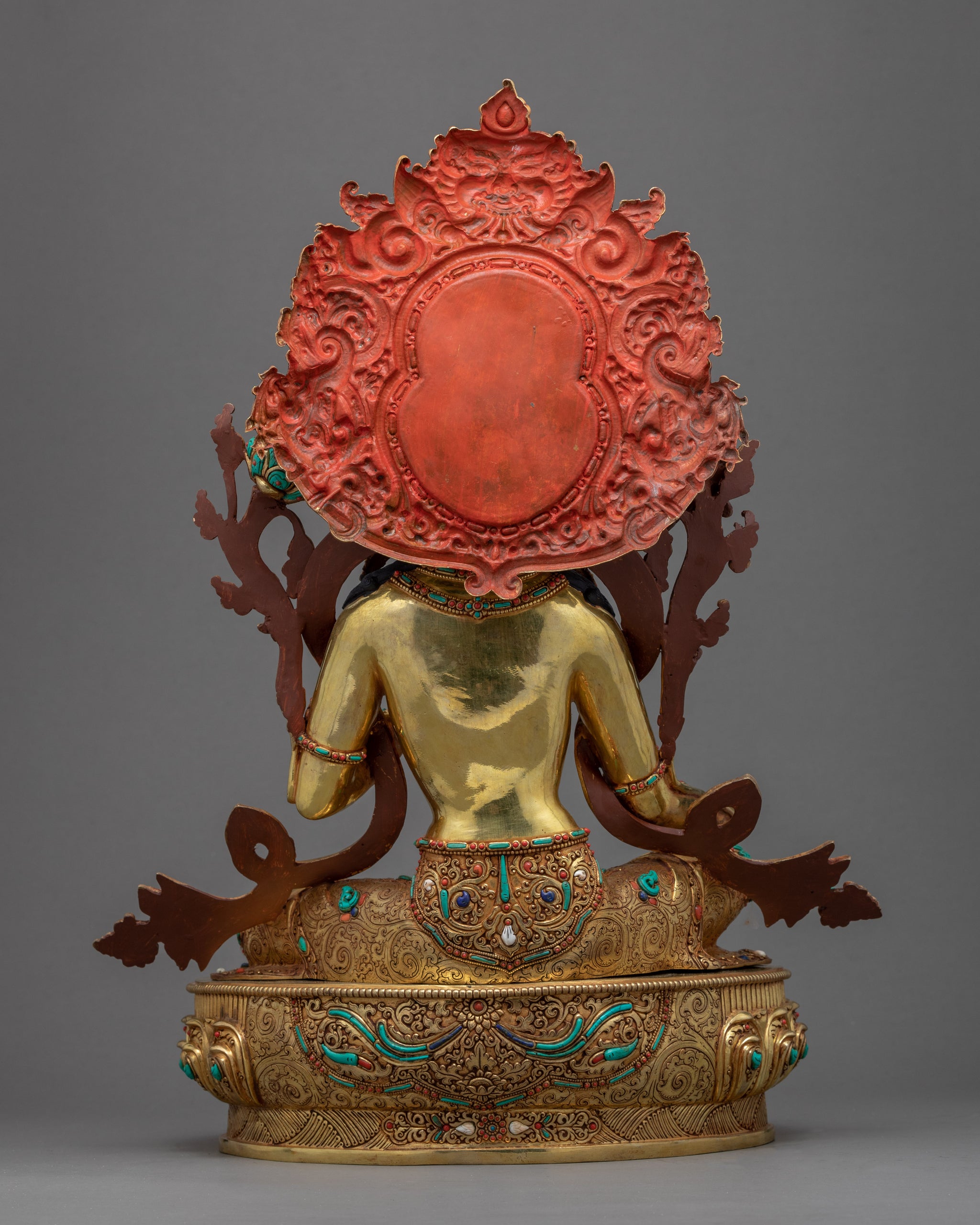 We have sculpted the statue of Green Tara Buddha in the traditional Himalayan Art of Nepal. The compassionate deity depicted atop a moon disc lotus seat will benefit you in meditation or yoga practices. You can also use the magnificent statue in different Buddhist rituals and occasions. We have exquisitely adorned the crown, halo, and jewels with precious corals and rare turquoise. The incredible statue of Mother Tara is hand-carved in a pure copper body and gilded with genuine 24k gold. This artisan of Nepal will be a tremendous gift to a practitioner like you.