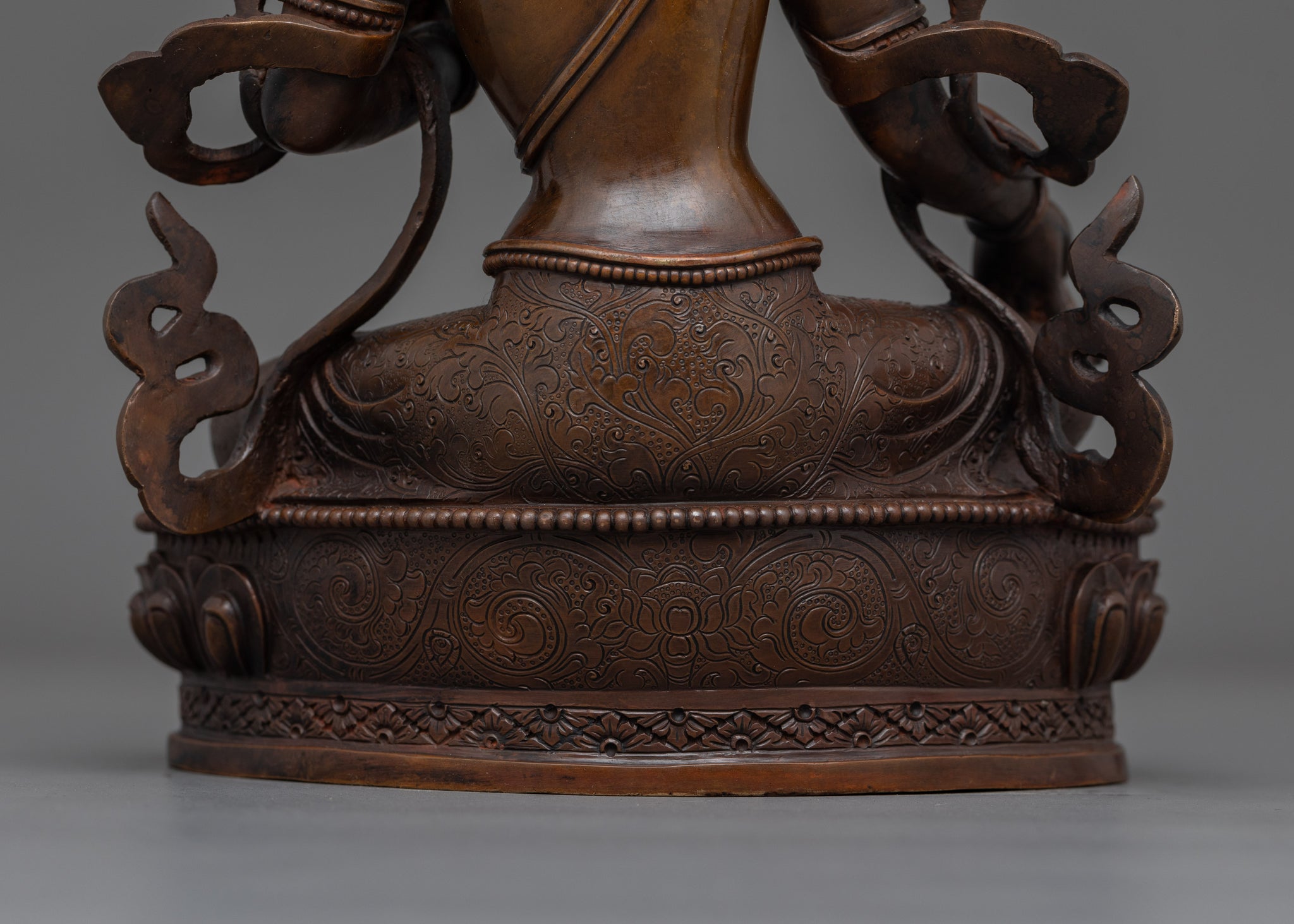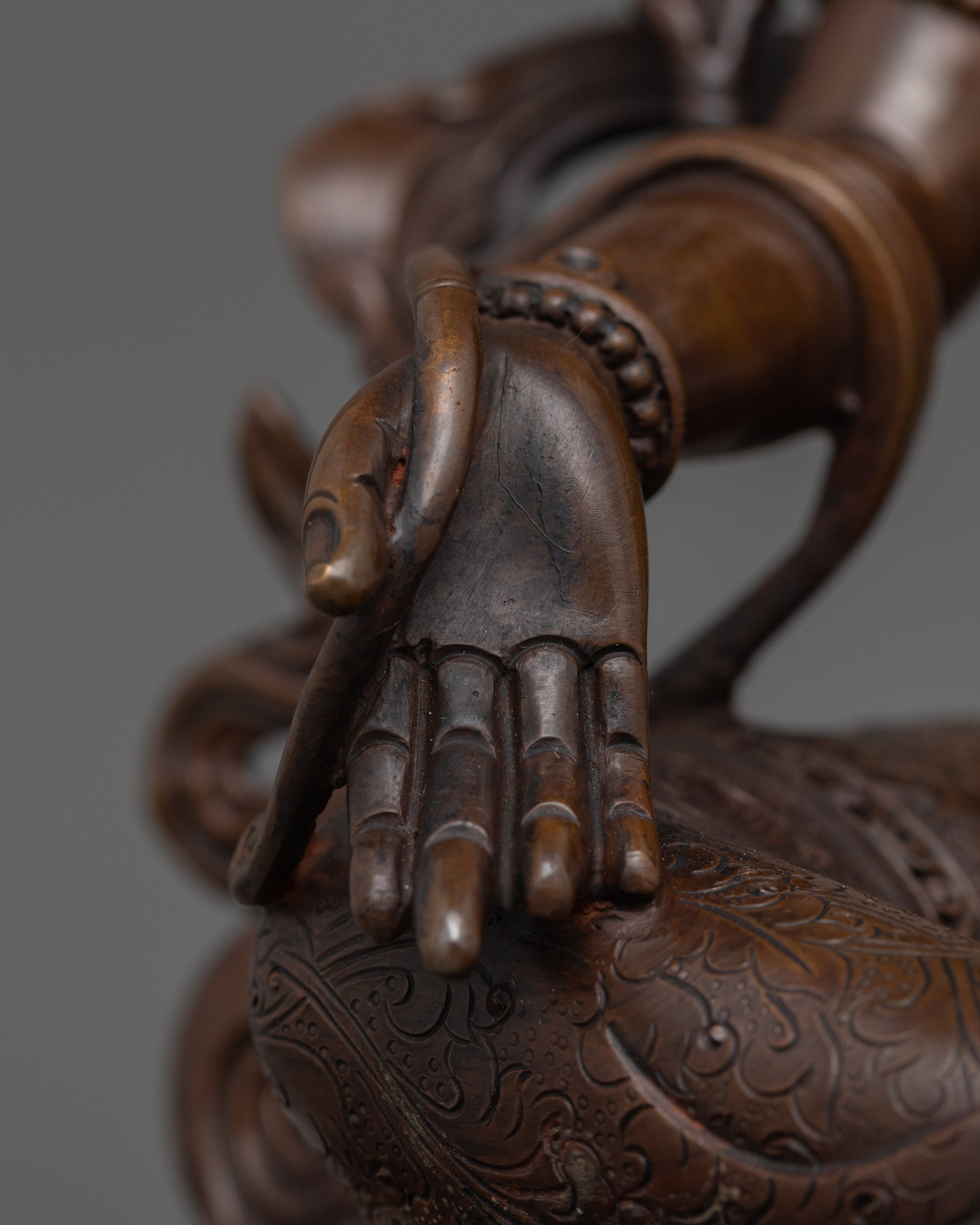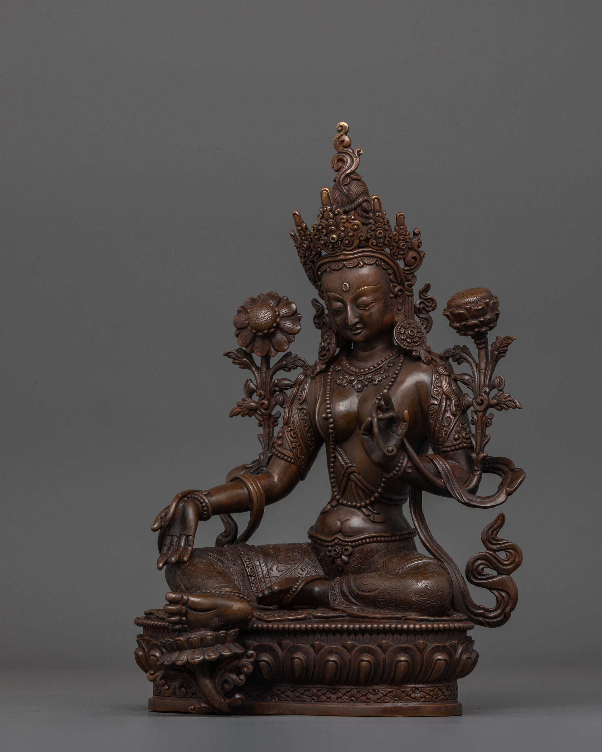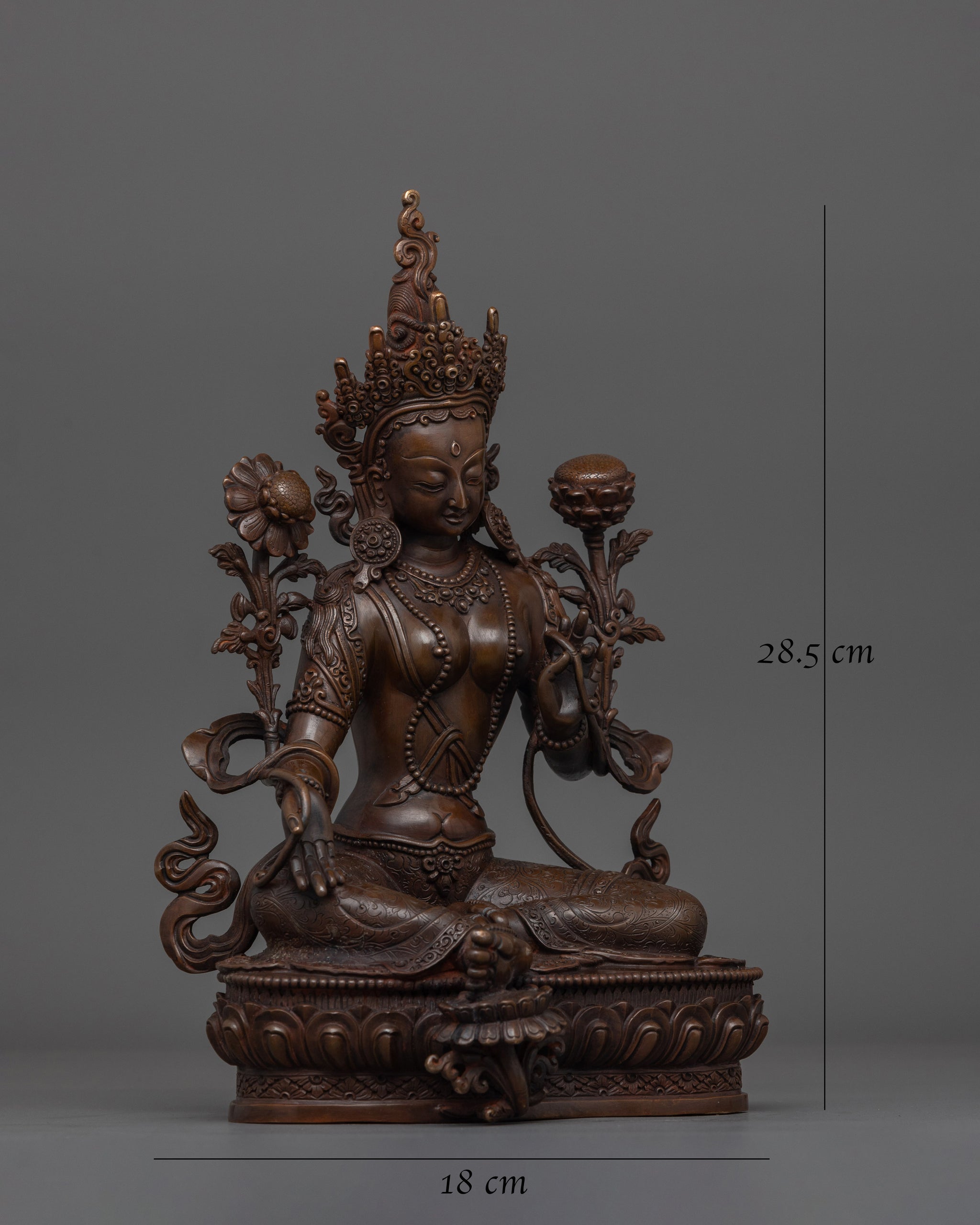 This hand-carved sculpture will bring the protecting and compassionate aura of Green Tara, the Buddhist Saviour, into your holy place. This statue, which measures 11.2" (height) x 7.1" (base) and weighs 2.13 kg, is made of oxidized copper, giving it a timeless and attractive look. This statue, created by skilled Nepalese artisans, represents the Himalayan region's creative traditions and spiritual legacy, making it an appealing centerpiece for altars, meditation areas, or home decor.