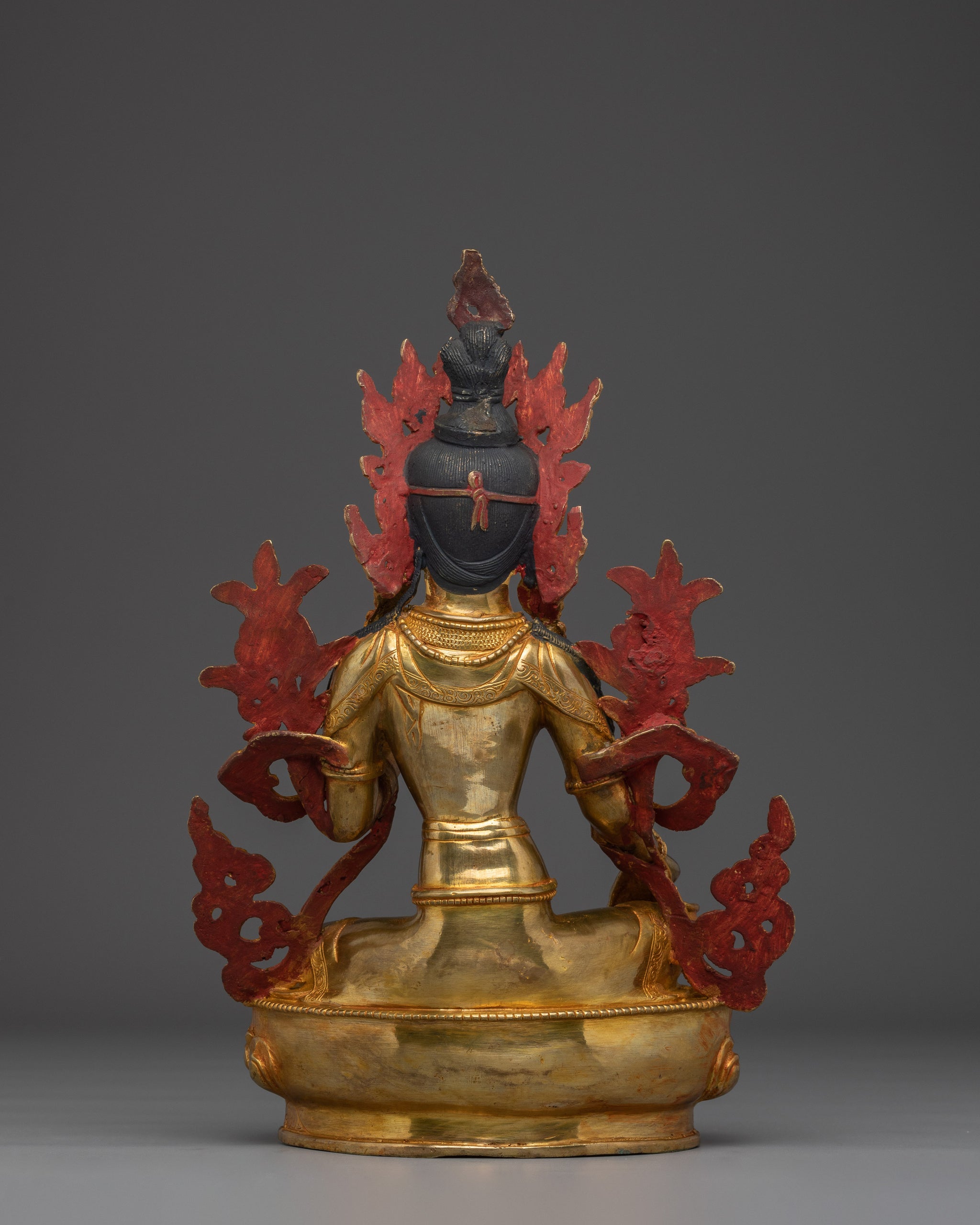 Vajrayogini is stunning. The details are amazing. It's easy to make out her facial expressions, skulls, feet, and the ring of fire around her. You can tell she's handmade. There is a consecration hole in her back.