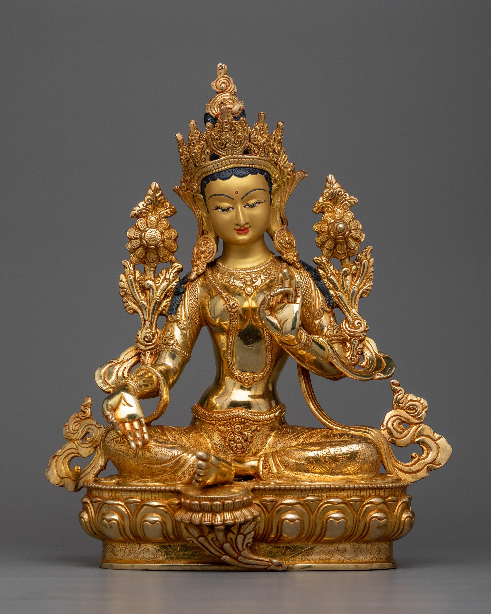 The statue depicts Green Tara in her signature attitude, with one leg outstretched, ready to rise and provide assistance, demonstrating her willingness to help sentient beings. Her hand movements, or mudras, symbolize blessings and protection for all. The meticulous craftsmanship, from the serene expression on Tara's face to the elaborate details of her robes and lotus seat, highlights her role as a source of refuge and solace.