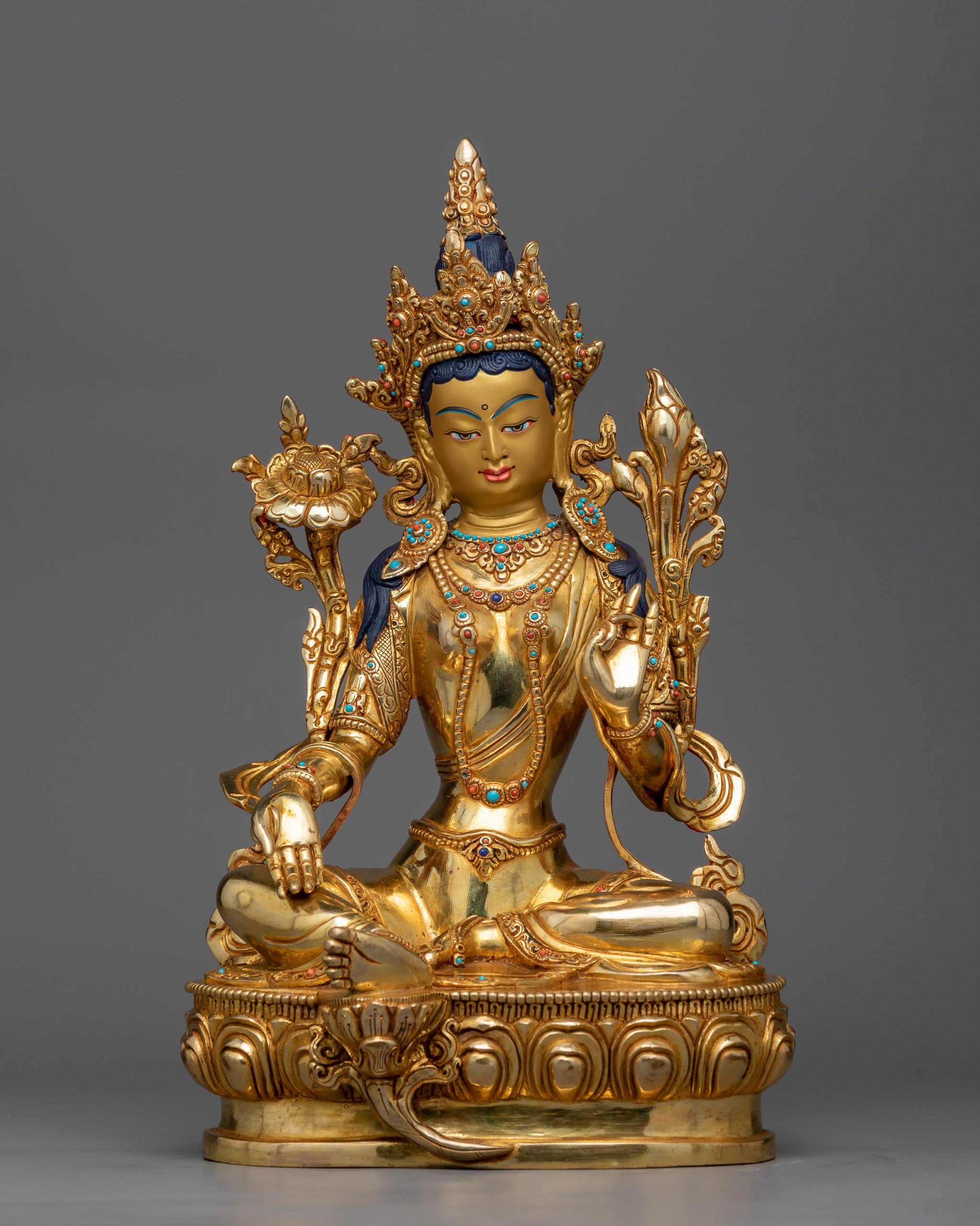With one leg outstretched in response to appeals from the needy, Green Tara is portrayed in her well-known stance. The 24K gold gilding illuminates the sculpture, highlighting her compassionate gaze and the flowing elegance of her garments, reflecting her role as a source of protection and salvation.