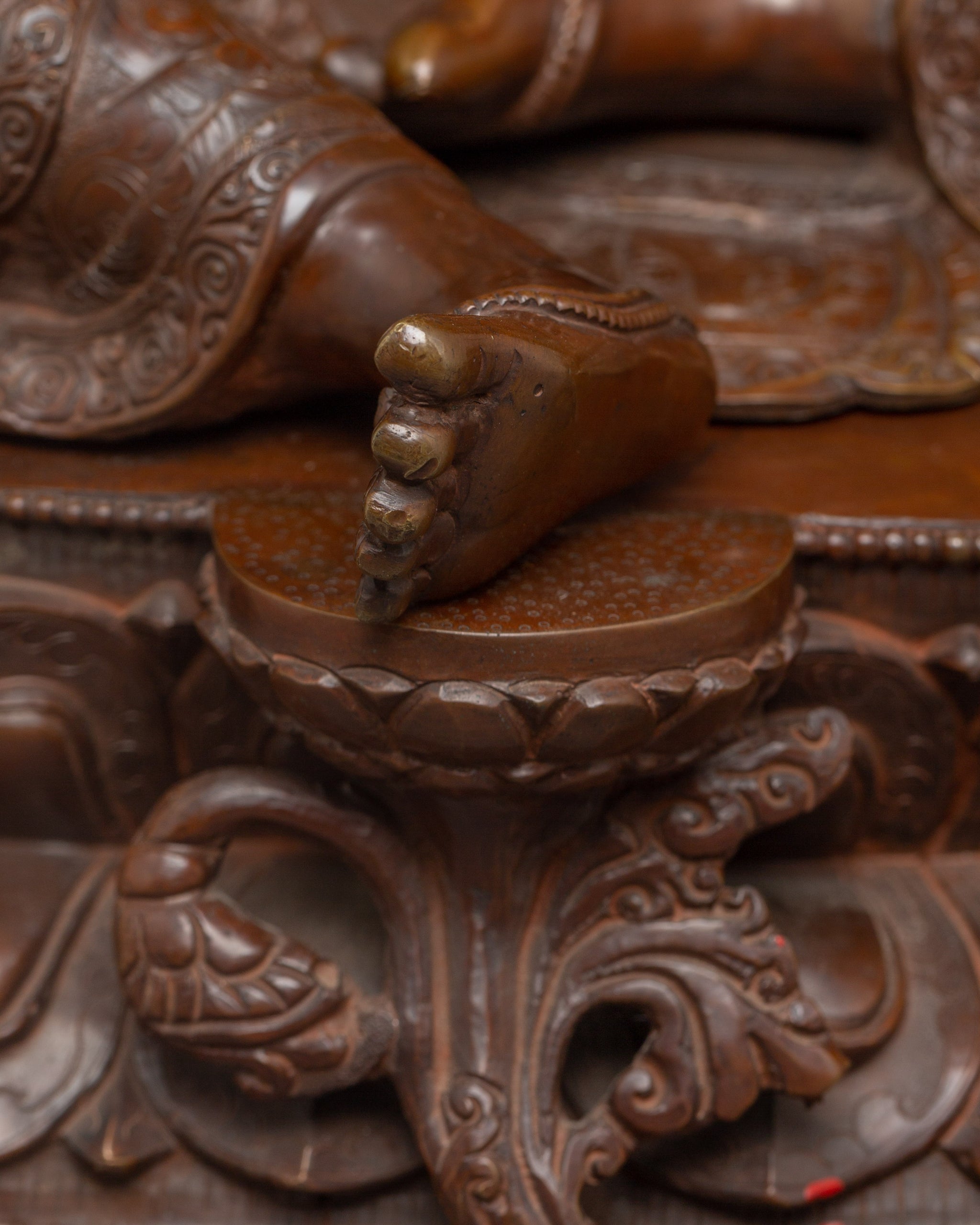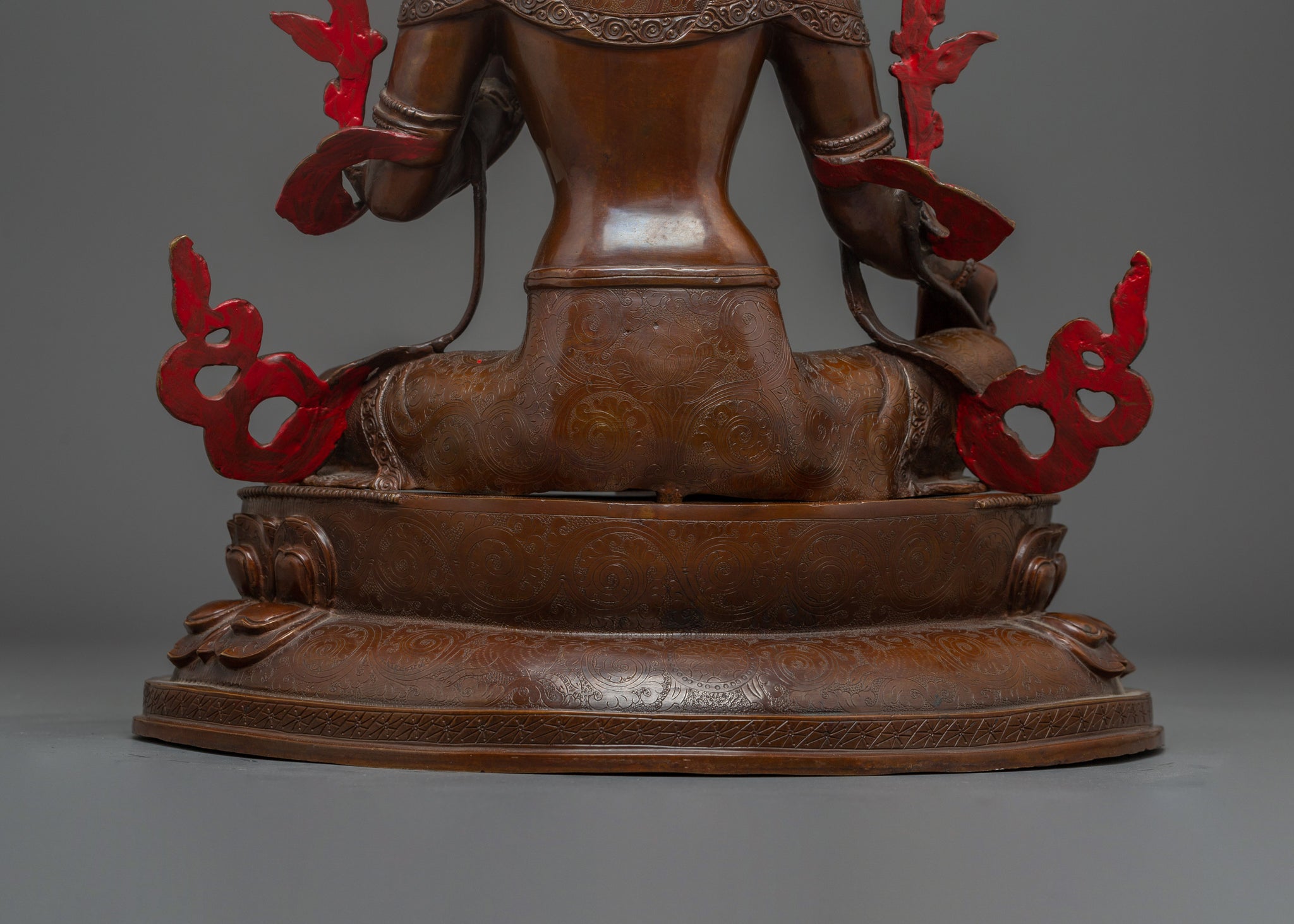 Vajrayogini is stunning. The details are amazing. It's easy to make out her facial expressions, skulls, feet, and the ring of fire around her. You can tell she's handmade. There is a consecration hole in her back.