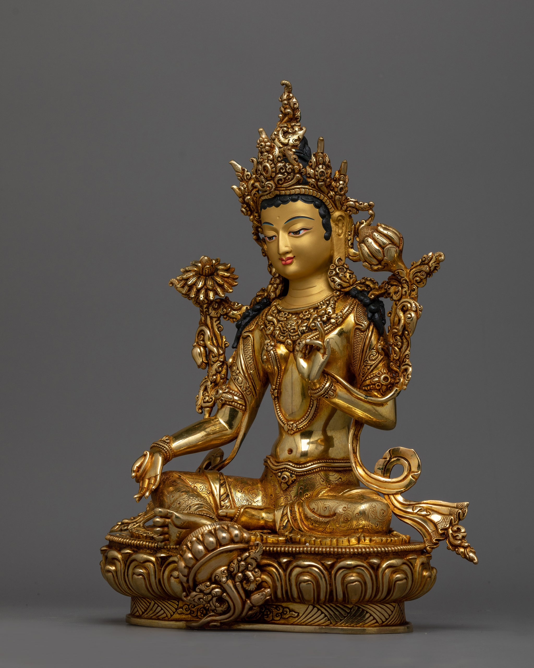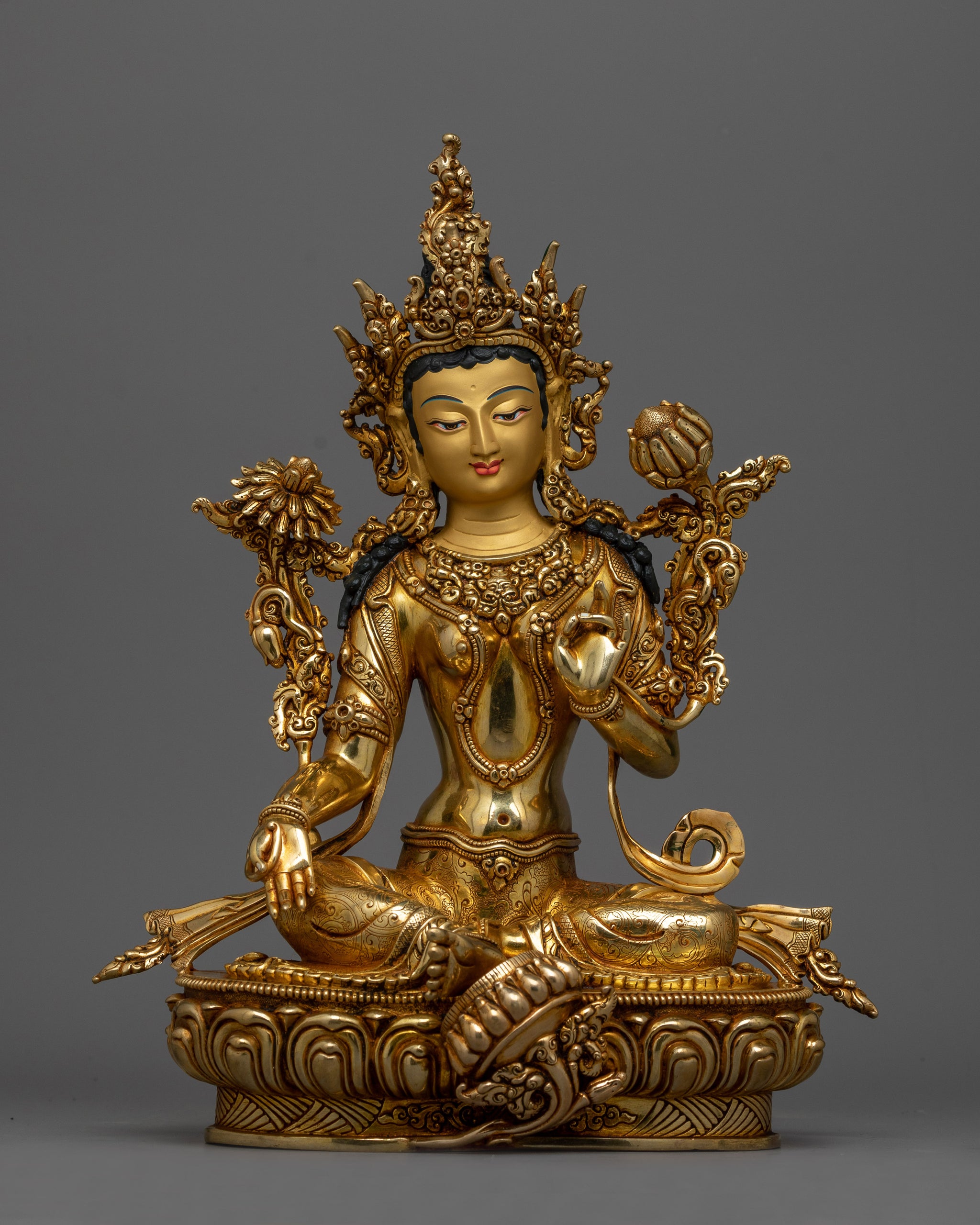 Experience the calm elegance of our Green Tara Gold Gilded Statue, lovingly carved by knowledgeable artists by hand. This statue, which has a base diameter of 10.2 inches and a height of 13.4 inches, is made of a copper body that has been beautifully painted with intricate designs and gilded in 24K gold. In Buddhism, Green Tara is regarded as the epitome of compassion and prompt action. She is beautifully rendered, radiating a serene aura.