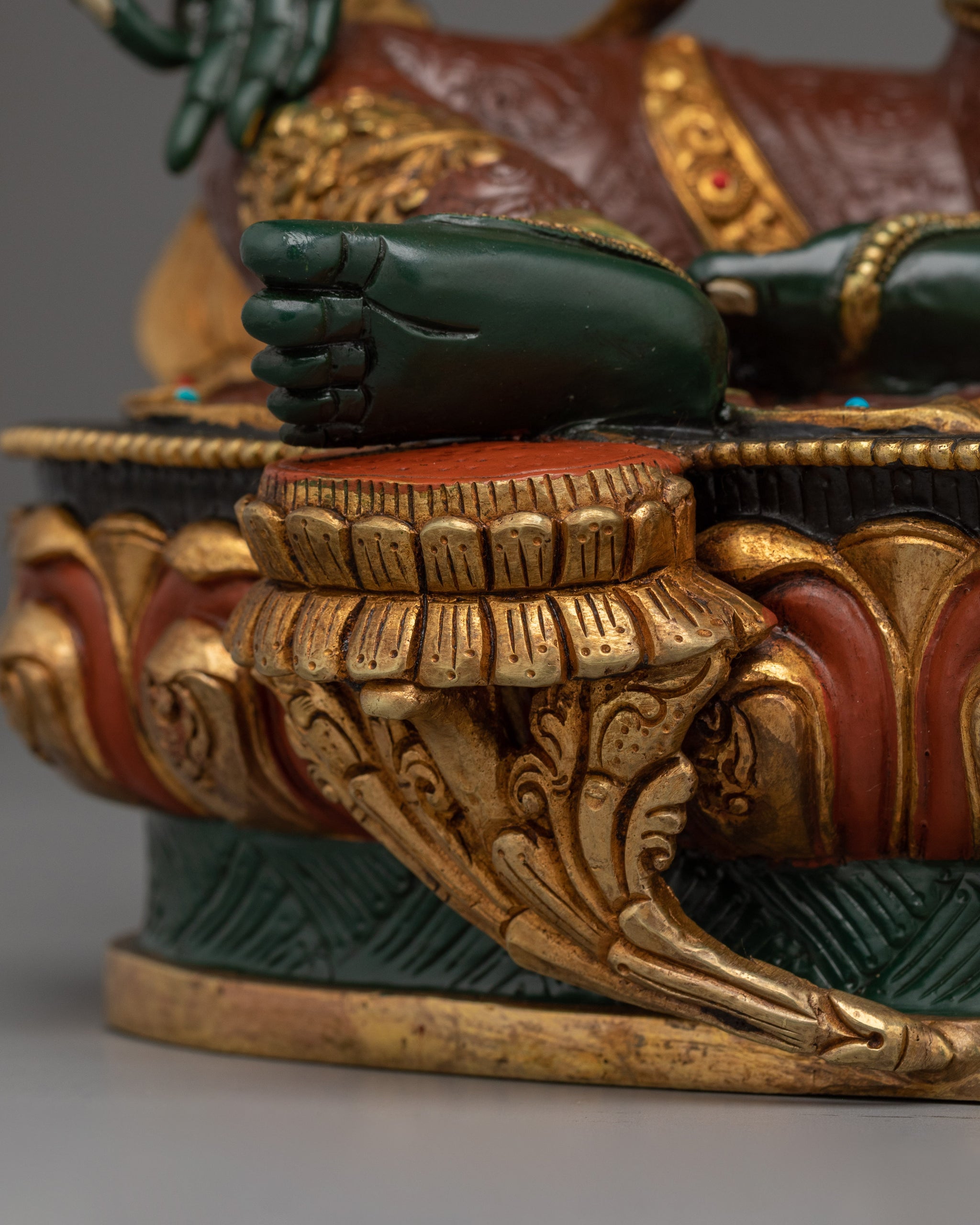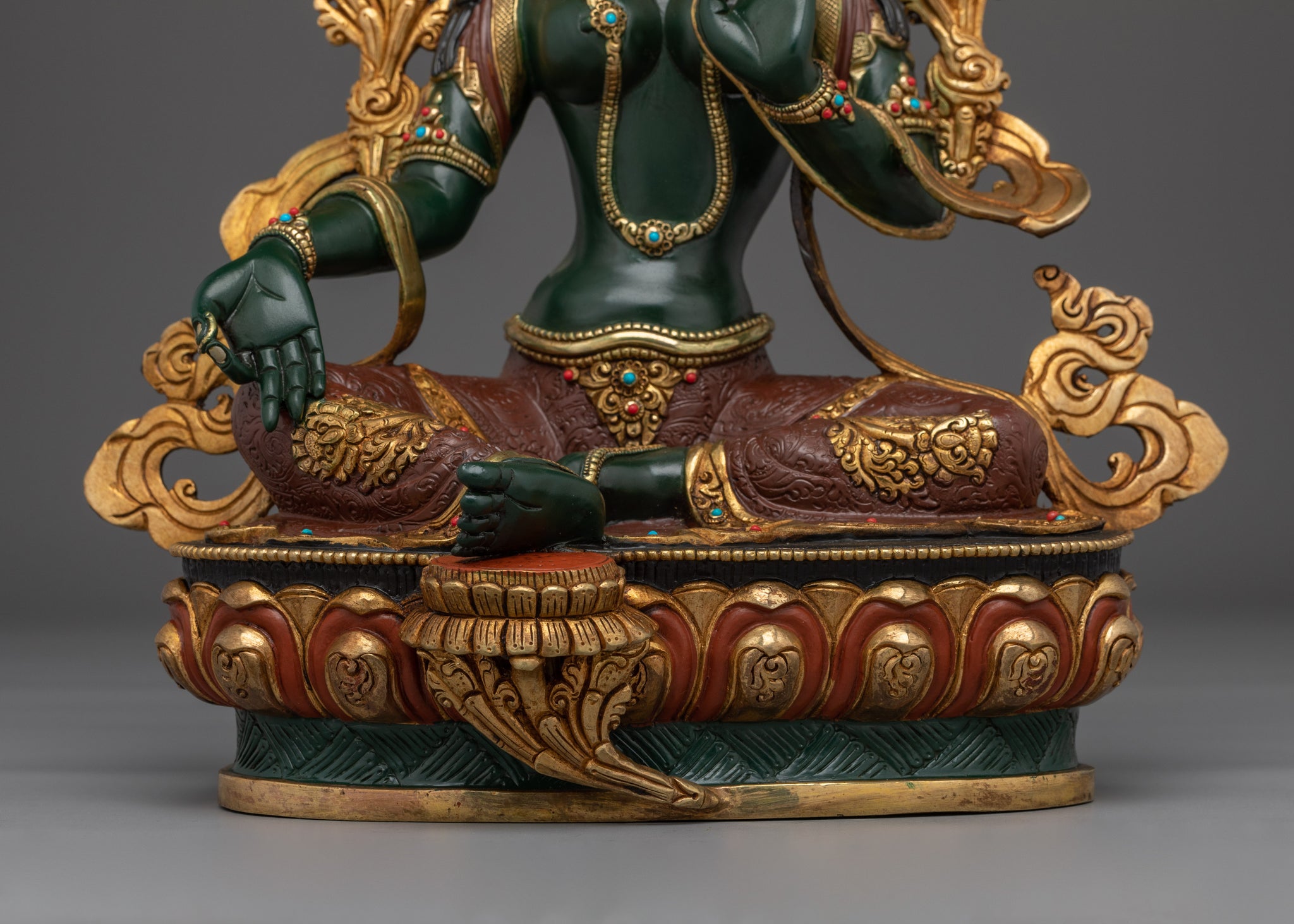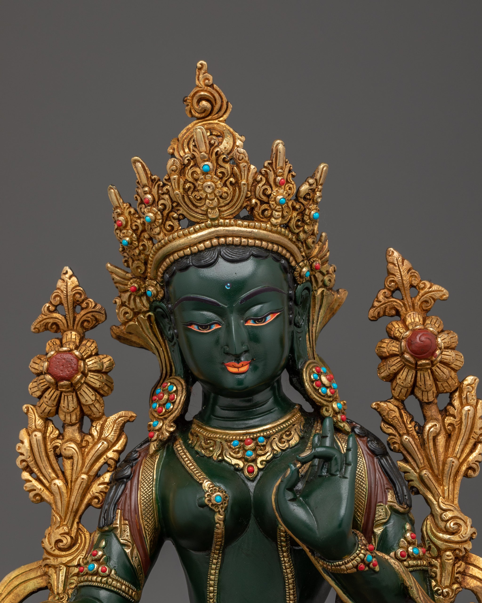 As depicted, Green Tara is shown seated on a lotus throne with her right leg typically extended forward, signifying her active compassion and willingness to help. Her hands express profound meaning through their gestures; the right hand is displayed in the "gesture of giving" (Varada Mudra), symbolizing her boundless generosity and willingness to provide blessings. Meanwhile, her left hand delicately holds a blue lotus (Utpala), a symbol of purity and spiritual awakening, offering protection and reassurance to those who seek her guidance.