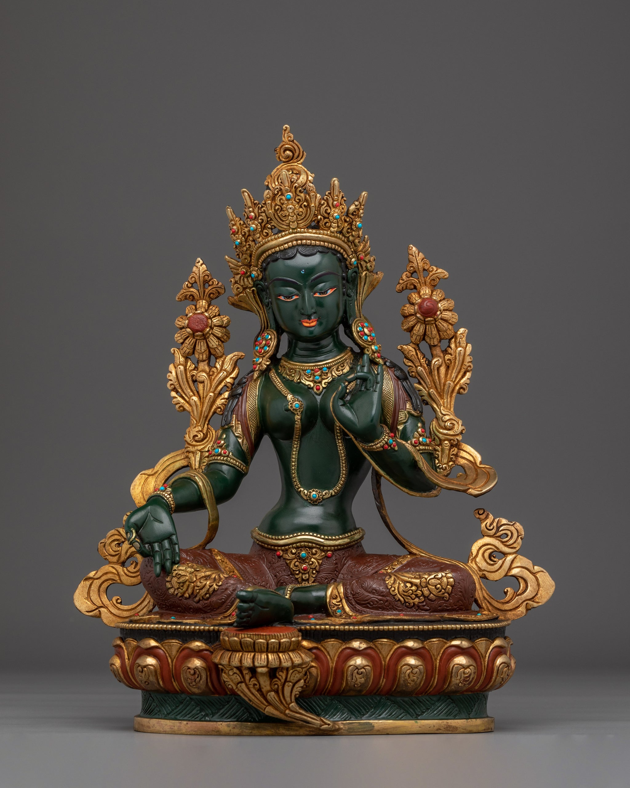 Handmade Green Tara Gold Gilded Copper Sculpture for Meditation