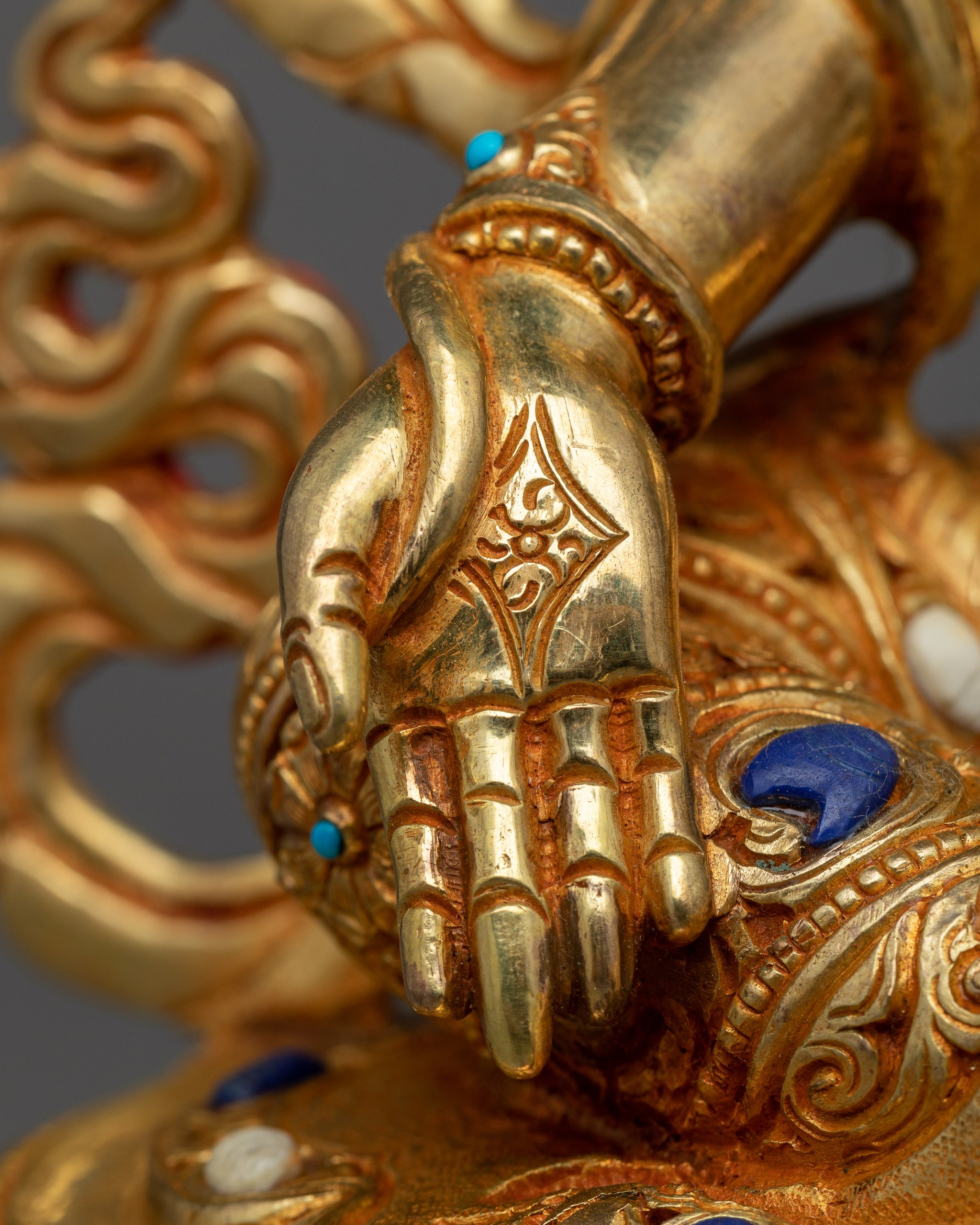 With this Green Tara statue, a magnificent synthesis of spiritual symbolism and aesthetic mastery, you may instill spiritual serenity and Experience Green Tara Mantra Miracles. This Nepalese wonder shows Green Tara, the "Mother of Liberation," whose mantra is said to bring forth miracles in difficult circumstances. The solid copper body of the statue, embellished with 24k gold gilding, accurate acrylic paintings, and hand-carved gemstones, is a monument to long-lasting toughness and visual attractiveness.
