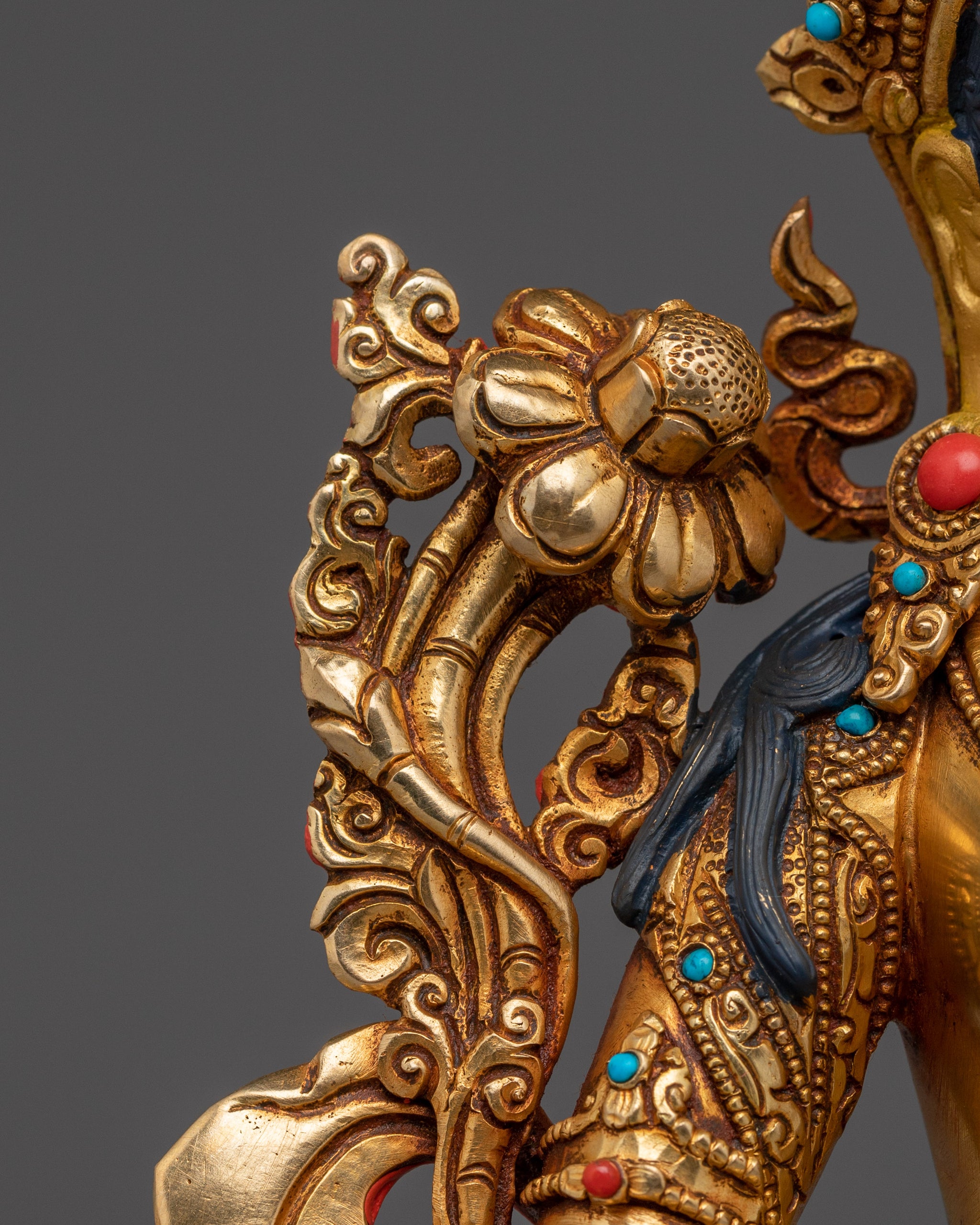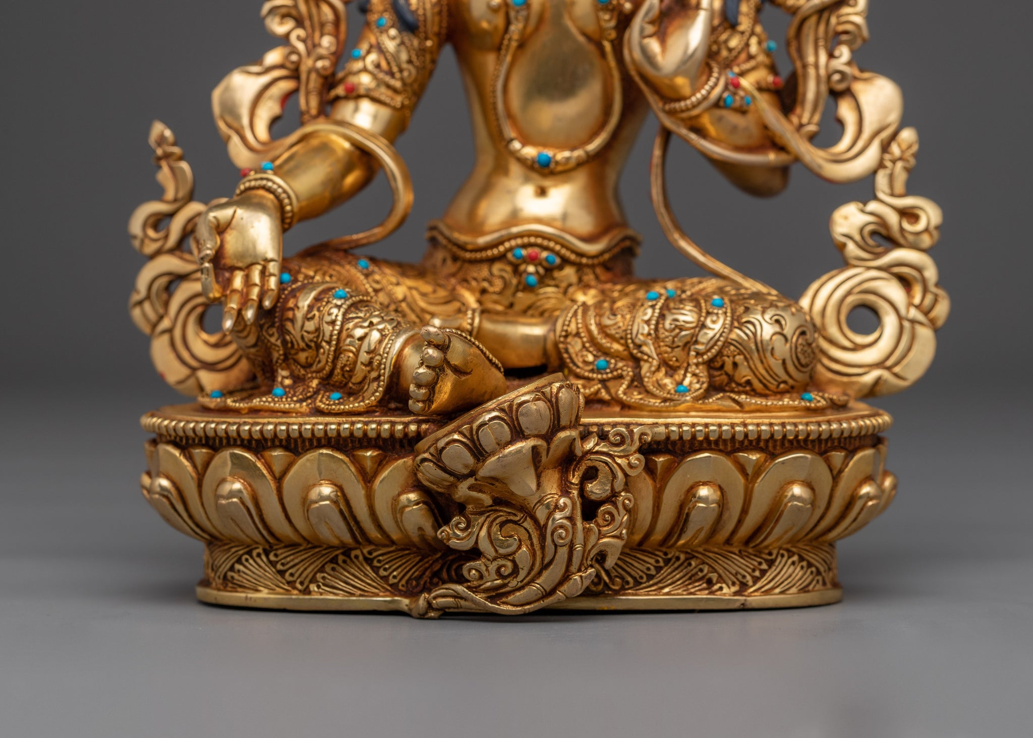 Green Tara, Meditation Altar stands 9.1 inches (23 cm) tall with a base measuring 6.3 inches (16 cm), and weighs 1.69 kilograms, offering a compact yet visually striking presence. Made from a solid copper body, it is richly adorned with 24K gold gilding that emits a radiant, sacred glow. The detailed gold and acrylic paintings enhance the statue's intricate features, while the inclusion of carefully inlaid gemstones adds vibrant color and symbolic depth.