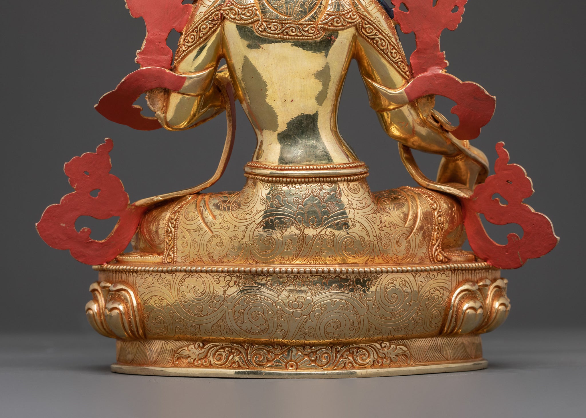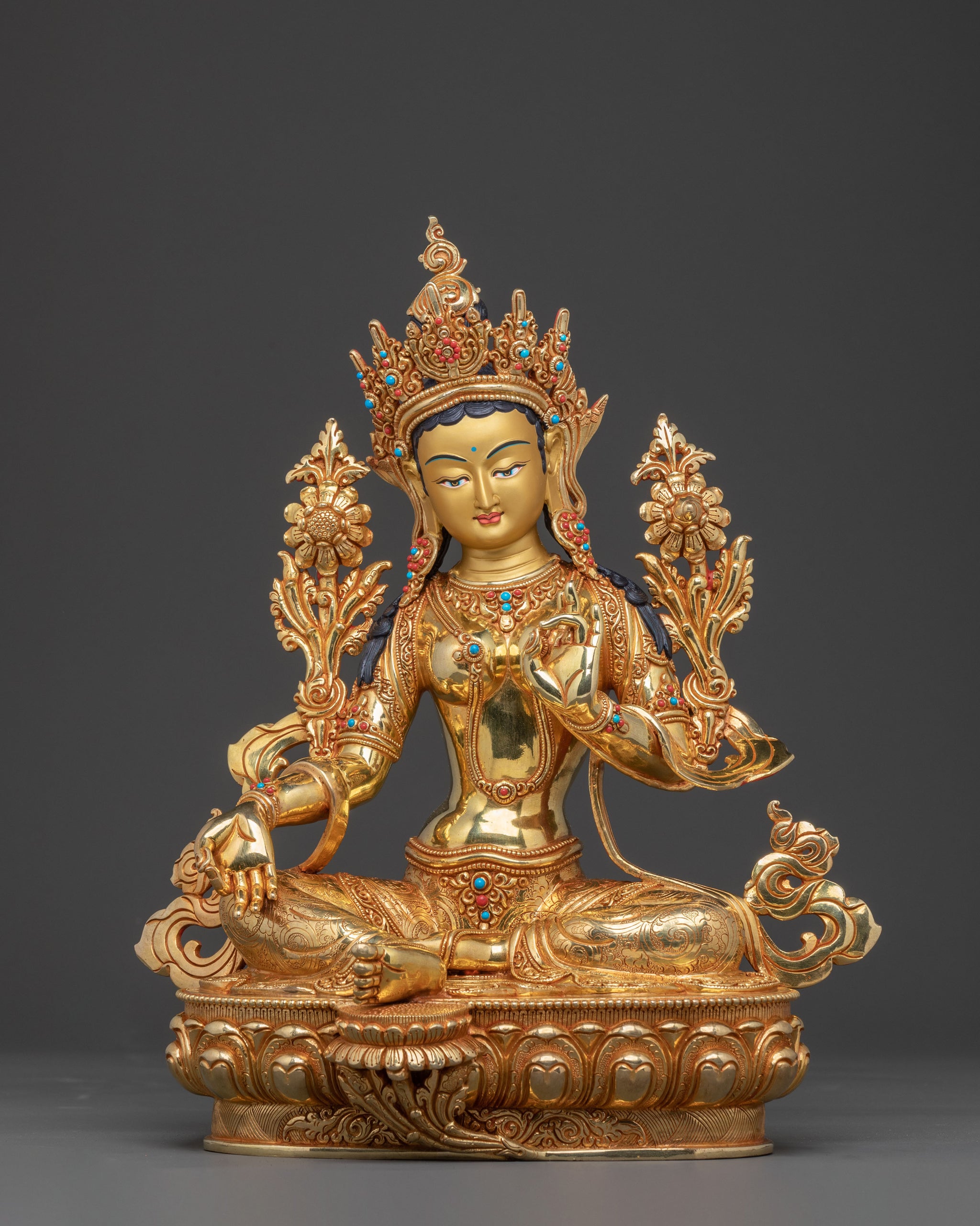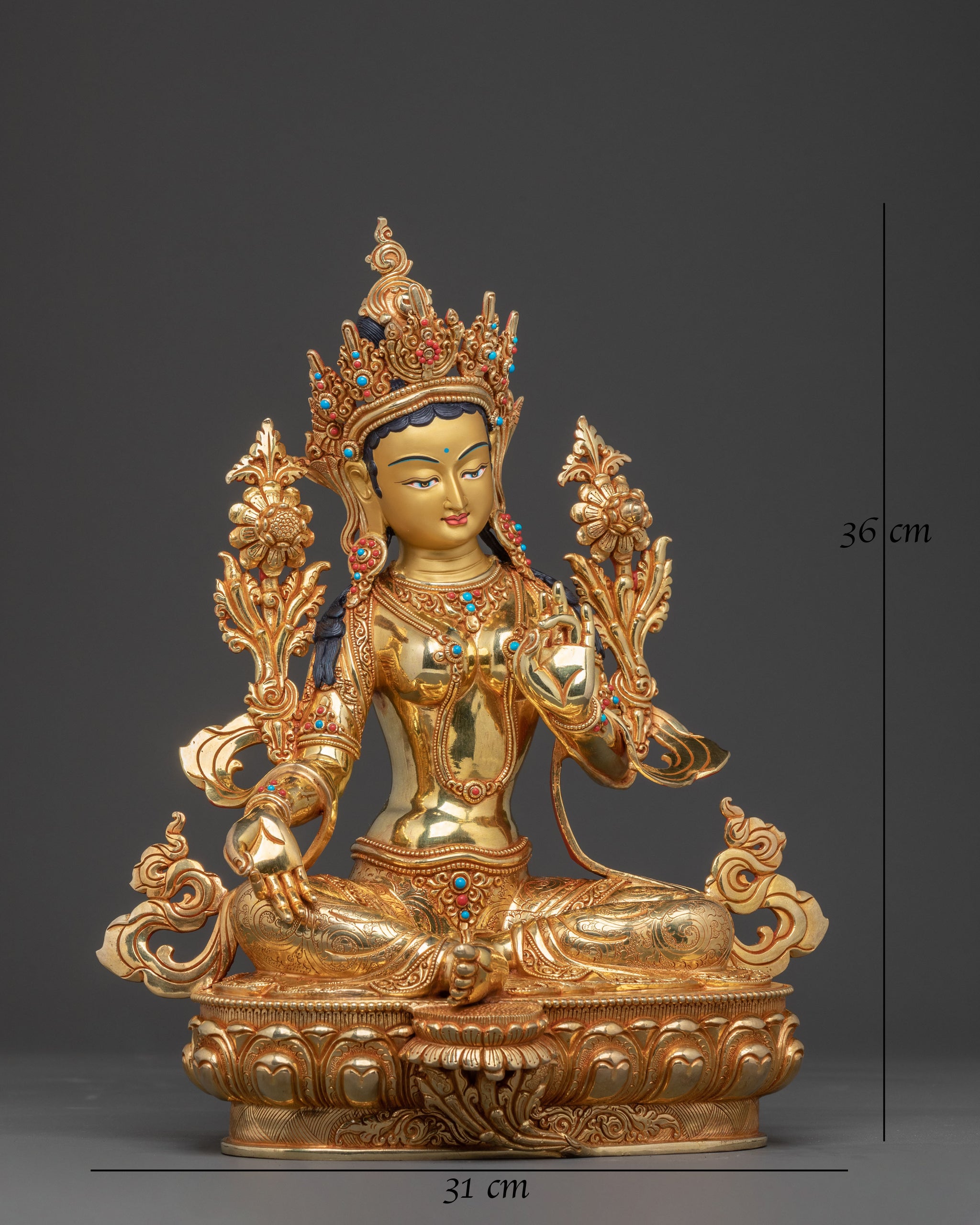 Radiating a gentle dynamism, this exquisite Green Tara Mercy Statue captures the essence of enlightened activity. Standing 14.17 inches (36cm) tall on a base of 12.20 inches (31cm), this handcrafted Buddhist art piece offers a tangible presence of compassion. Its copper body, meticulously crafted and adorned, is covered with a triple layer of 24K gold gilding and carved with deeply engraved carvings that produce a magnificent 3D-like effect. This statue promises to bring serene spiritual decor to any sacred space.
