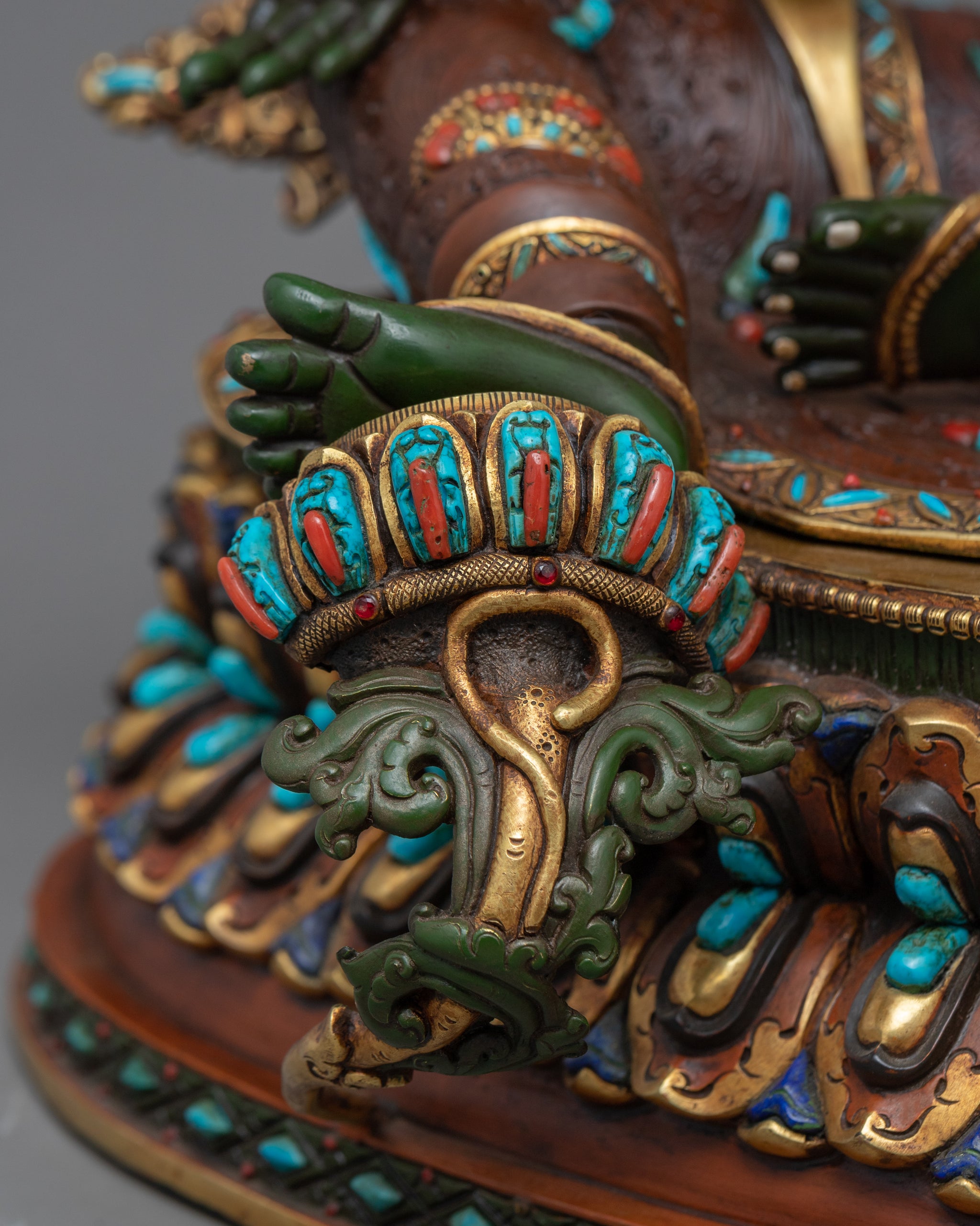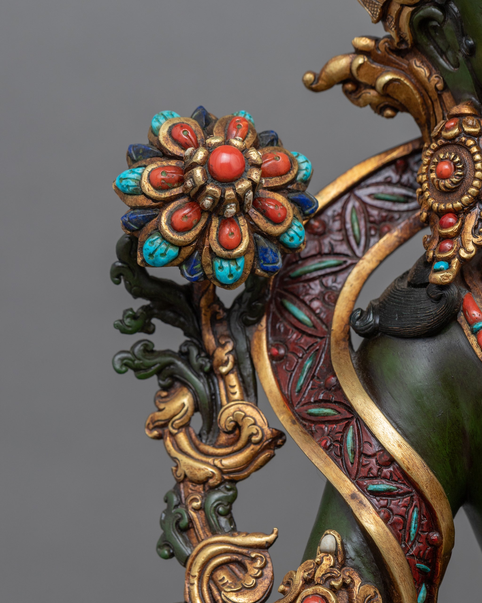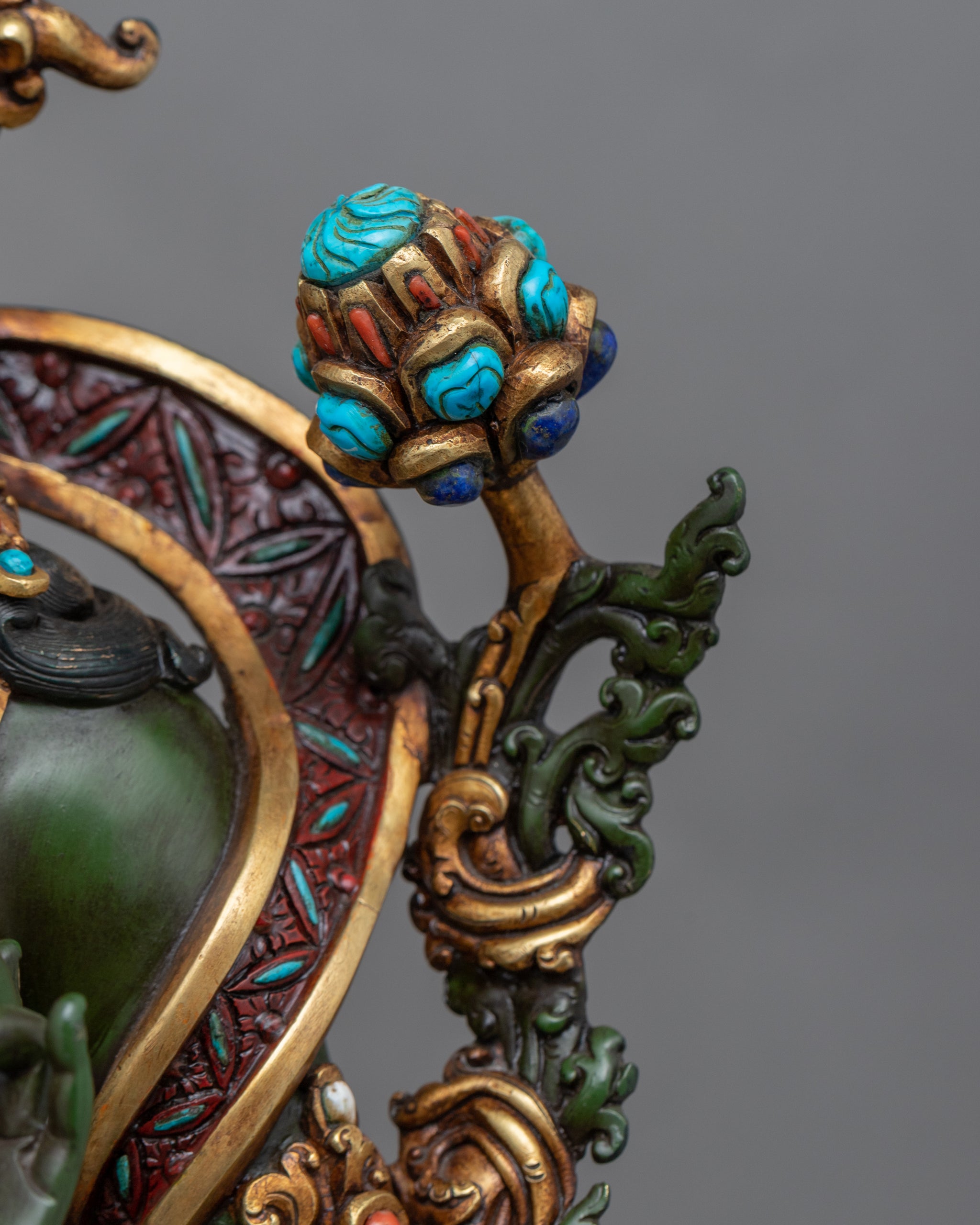Green Tara is the emanate manifestation of all other forms, and this Green Tara Necklace Statue represents enlightened action and active compassion. This exquisite Buddha Art masterpiece depicts the deity with a body of pure copper and 24k genuine gold, created in our workshop. The acrylic painting's intricacies are fascinating. She has a tranquil facial expression and is serenely seated on a moon disc lotus, holding two lotus flowers, one in full bloom and the other a bud, representing the purity of the mind. The deity's body is painted with a hue of green acrylic colors. The lotus seat, silk scarf, and robe have a hue of brown acrylic paint. The deity is magnificently adorned with precious gemstones on the crown, silk scarf, robe, lotus seat, utpala, and body ornaments (necklaces, earrings, bracelets, armlets, and anklets). We used materials of the highest quality to craft the statue. We assure you that this piece of art will last for many years.