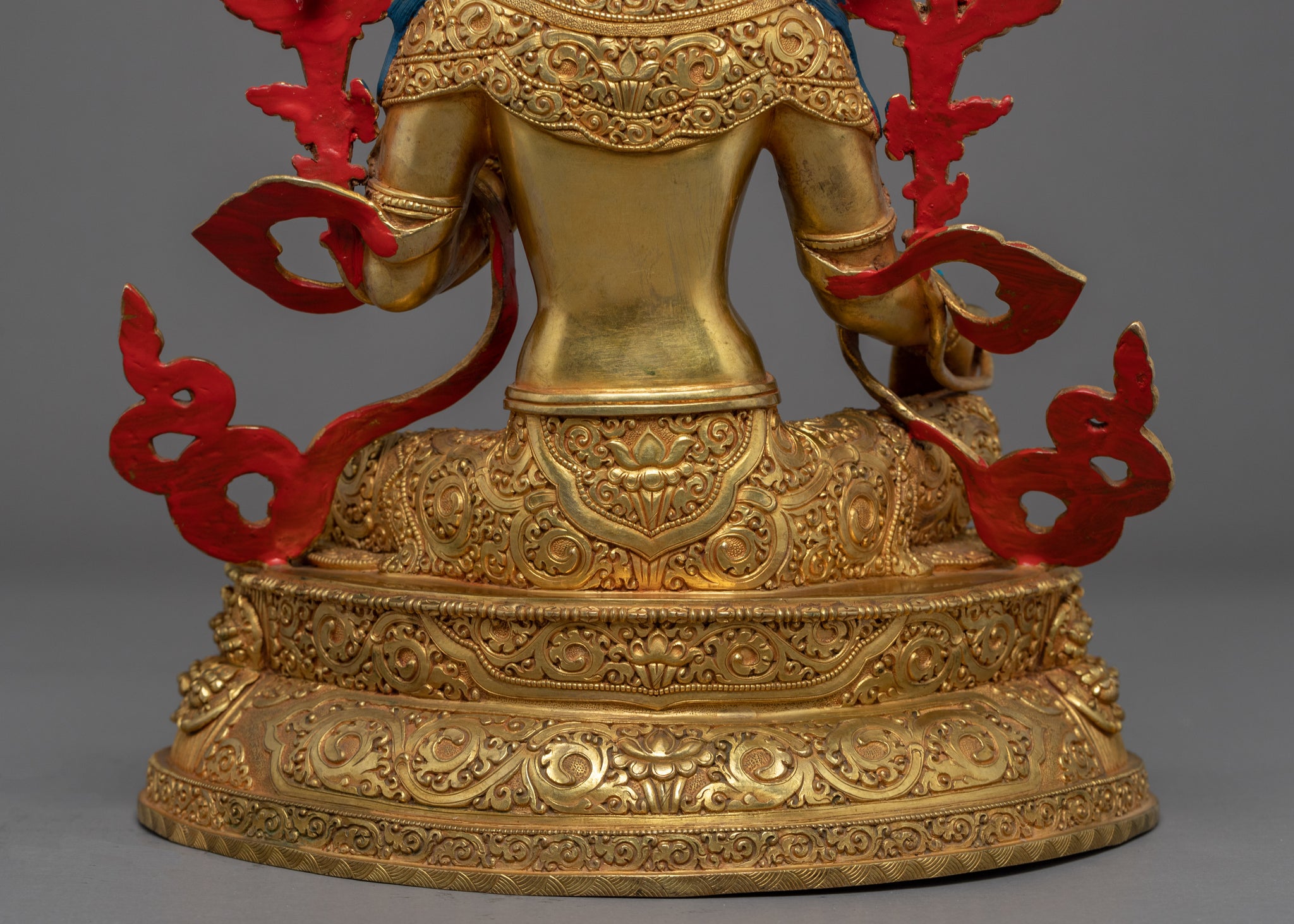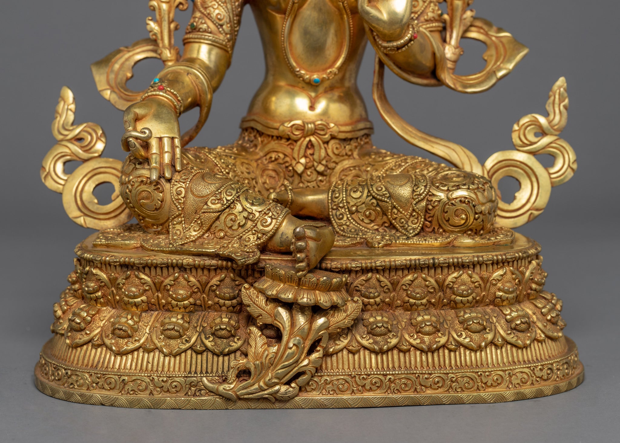 This handcrafted statue of Green Tara made by the master craftsmen of Nepal is one of a kind statue made flawlessly in detail. The sculpture was molded from a copper body with 24k genuine gold coating over the body of the statue. In this Tibetan statue, we have depicted a deity on top of a moon disc lotus seat with a peaceful expression making a Surya mudra with her left hand pointed outward and the other making a Gyan mudra rested upon her knee. Draped in royal robes and decorated in many ornaments, she is seen with her right foot pointed outward while it rests upon a blooming lotus. This indoor art of Himalayan from Nepal will be a tremendous gift to a practitioner like you.