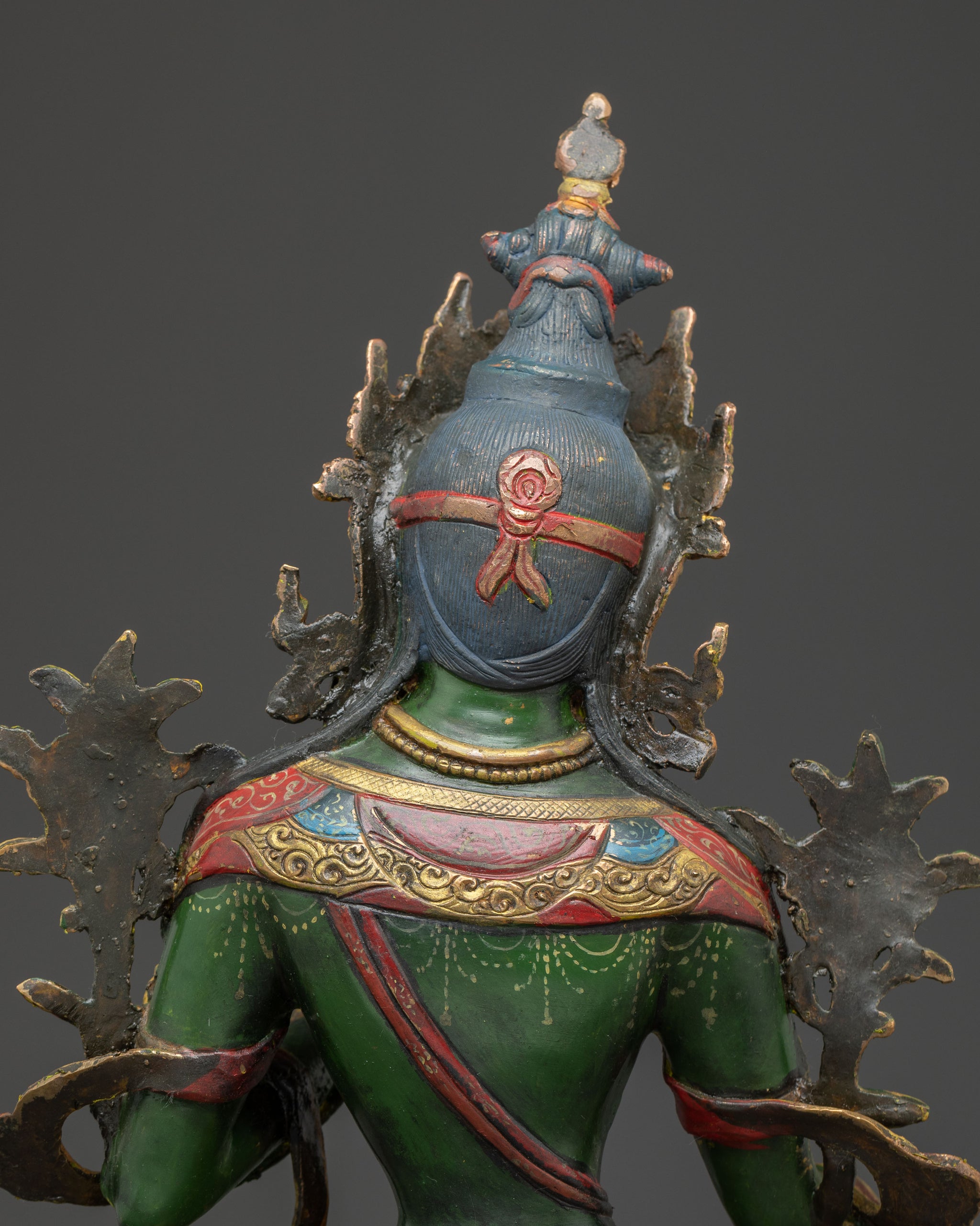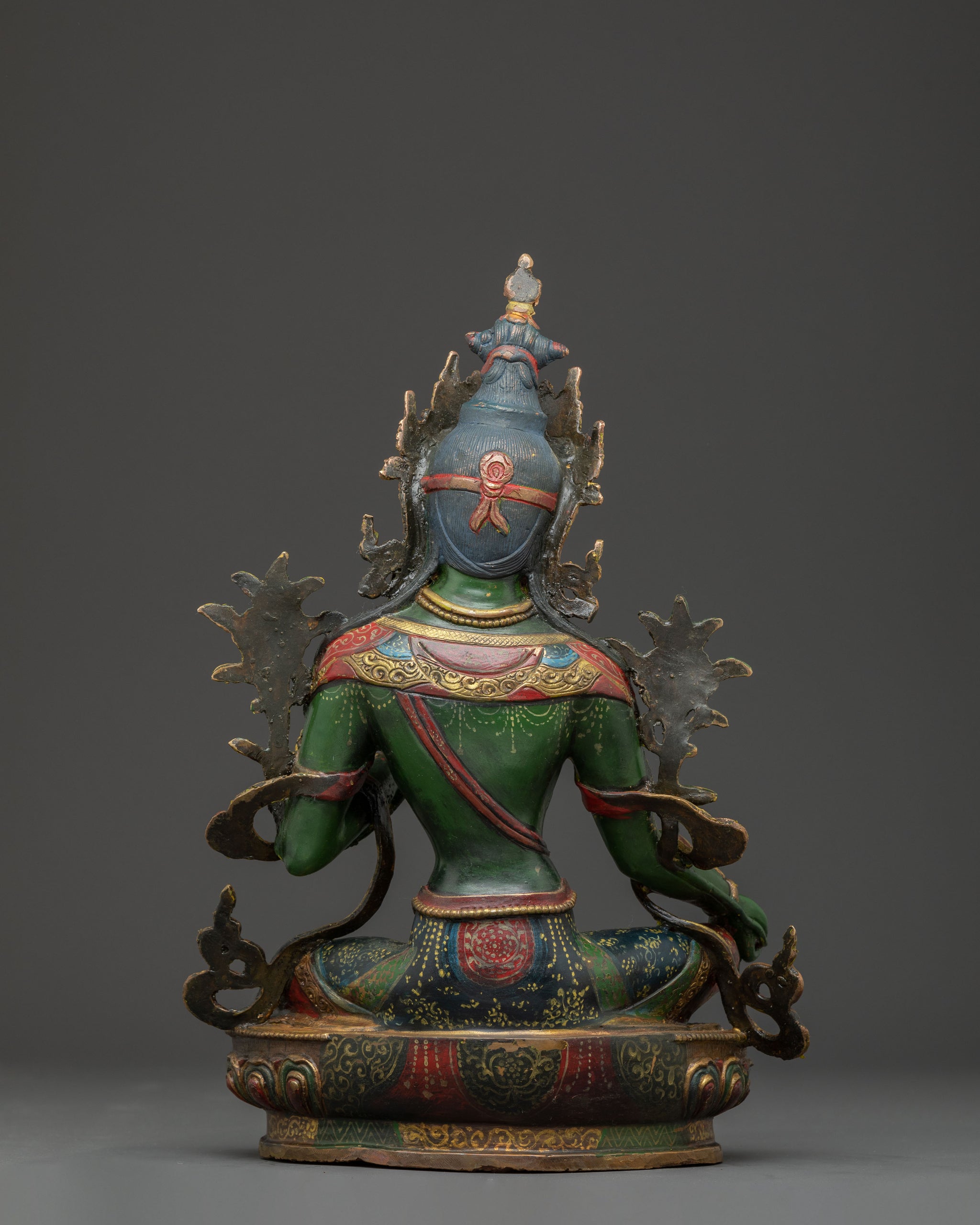 This stunning 12.6" Green Tara Protector Deity Nepali Handcrafted Statue, which was handcrafted in Nepal, is a strong symbol of divine protection. The statue, made of copper and finished with bright acrylic paints, depicts Green Tara sitting in a posture of readiness, signifying her commitment to assisting those in need. Her right hand, which is extended in a gesture of giving, represents the fulfillment of wishes and the removal of impediments, while her left hand, holding a blue lotus, symbolizes purity and knowledge.