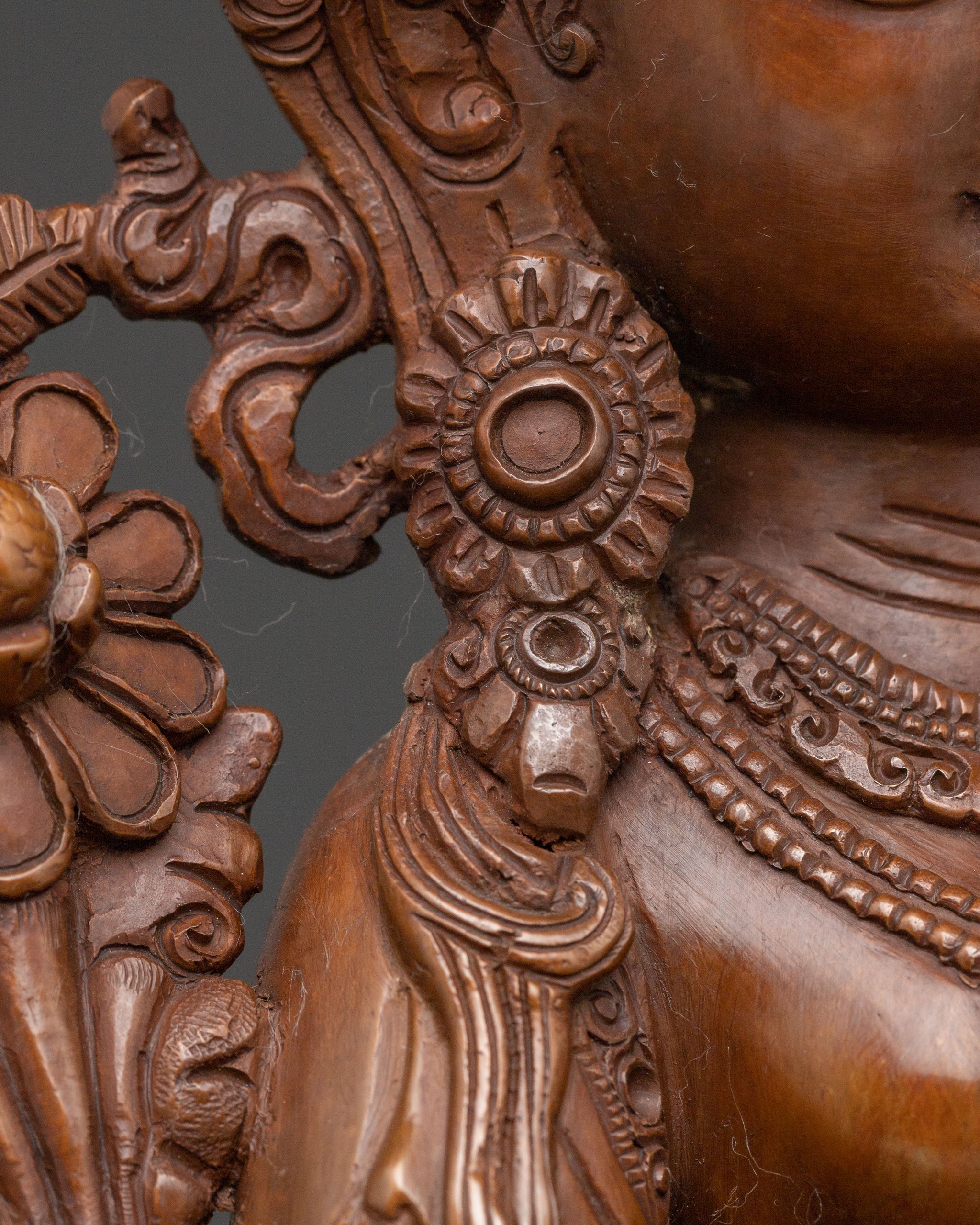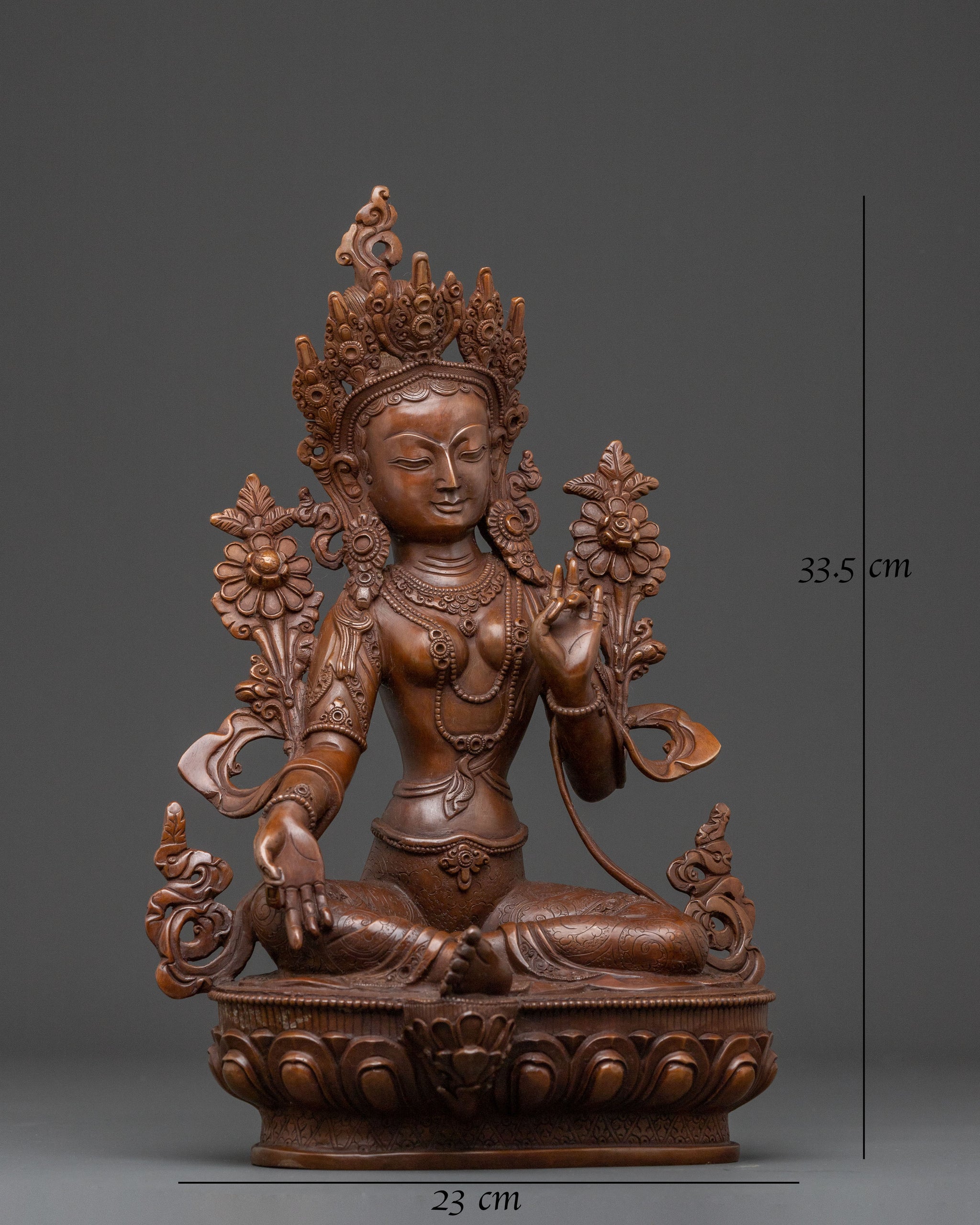 A radiant expression of feminine wisdom, this green tara sacred copper statue emerges from the heart of Nepalese tradition. Standing 13.2 inches (33.5cm) tall on a graceful lotus base, this deeply oxidized sculpture embodies profound serenity, inviting a sense of peace and protection into any spiritual decor. Its substantial weight of 3.28 kg affirms its lasting presence and quality.