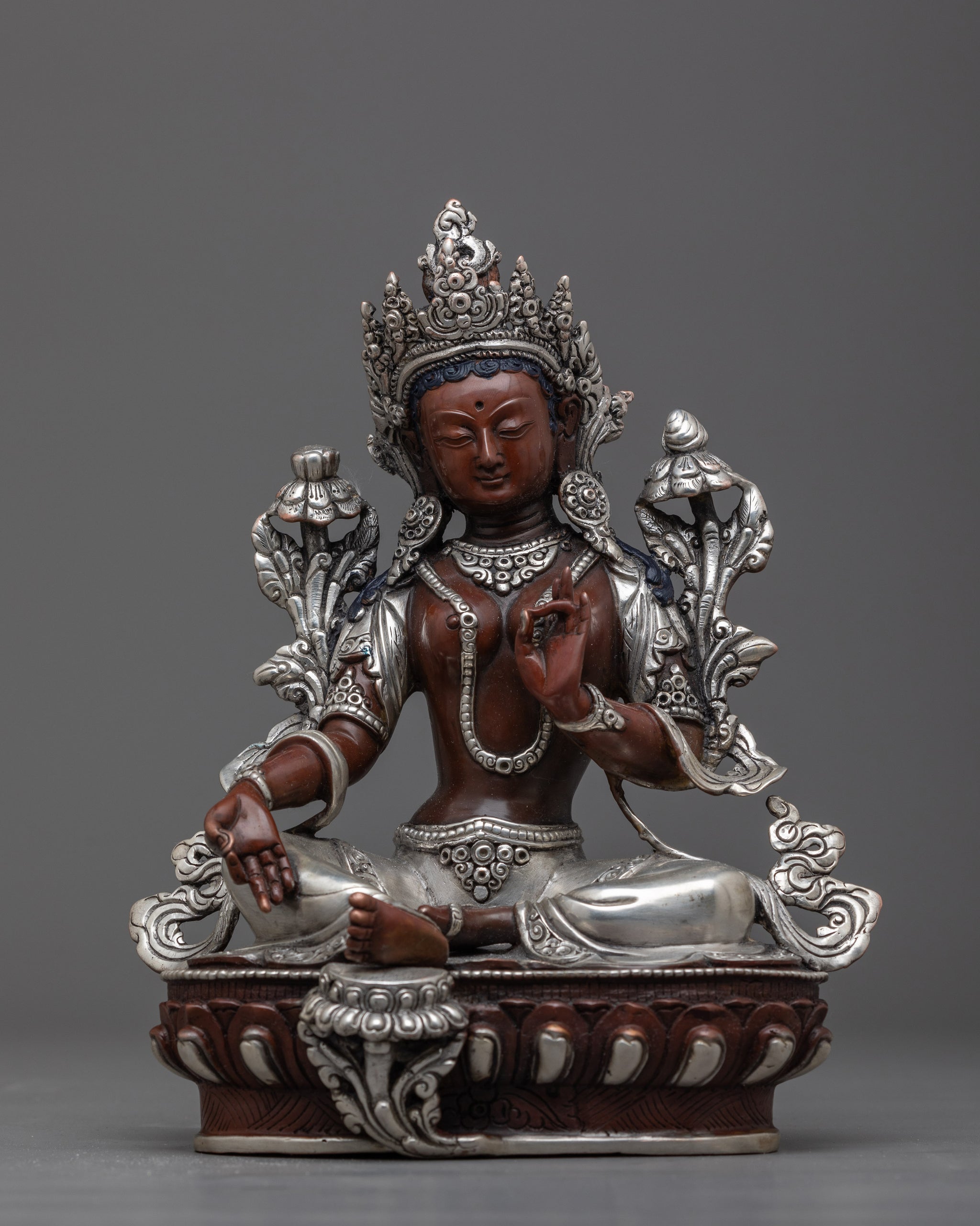 Indulge in the calm presence of the Green Tara Silver Plated Figure, a representation of understanding and kindness. Wonderfully detailed, this statue exudes elegance and peace. With the elegant shape and height of 9.4 inches and weight of 1.96 kg, it is sure to draw attention. This sculpture, which is made of oxidized copper and has a silver-plated finish, has a heavenly presence. Put it in your hallowed area and allow its presence to motivate you to live a compassionate and wise life.