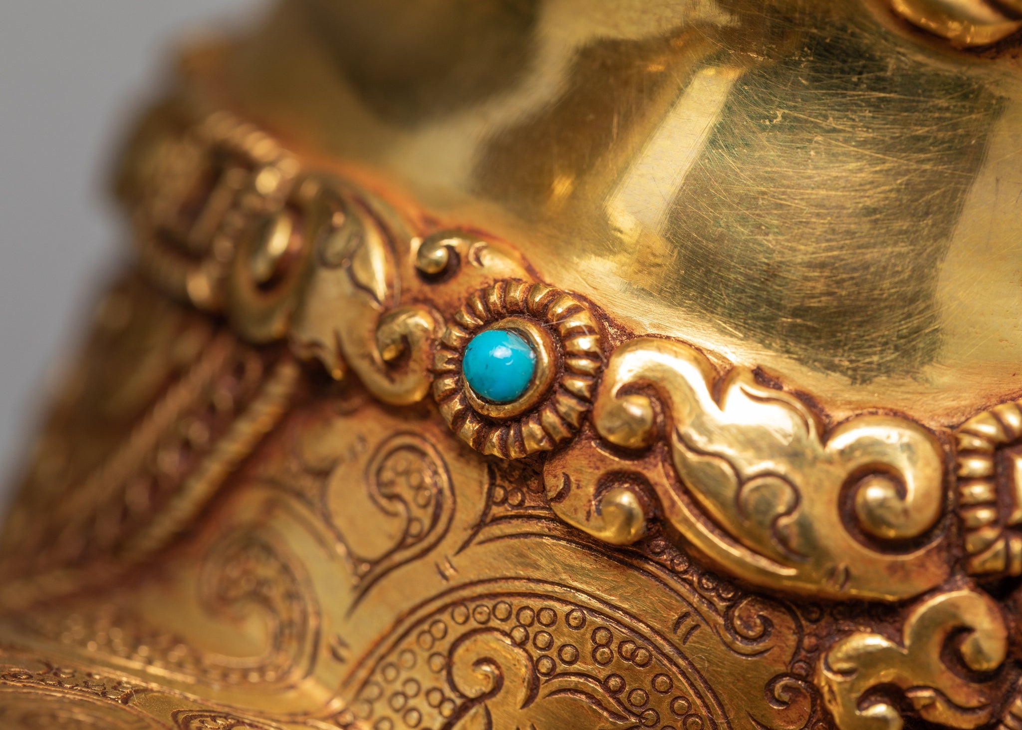Beautifully hand-carved Green Tara statue, with embedded precious corals and turquoise, Pure 24K Gold Gilded.