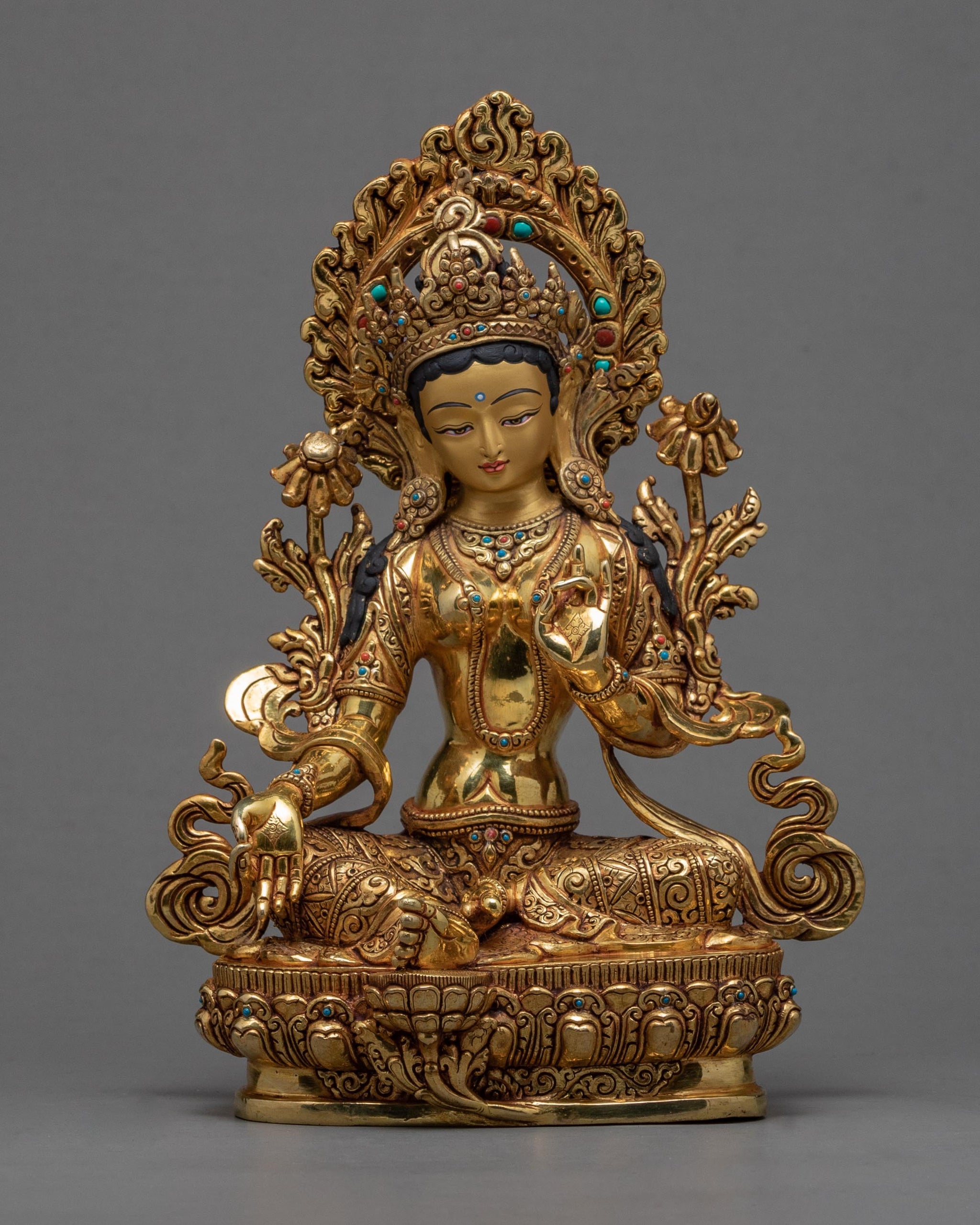 This Green Tara Statue is embedded with precious corals and turquoise. This statue is plated with pure 24K Gold Gilded. It helps you release hope for a particular outcome and bring the energy back to yourself, generating inner peace and clarity.Her Mantra is " OM TARE TUTTARE TURE SOHA".
