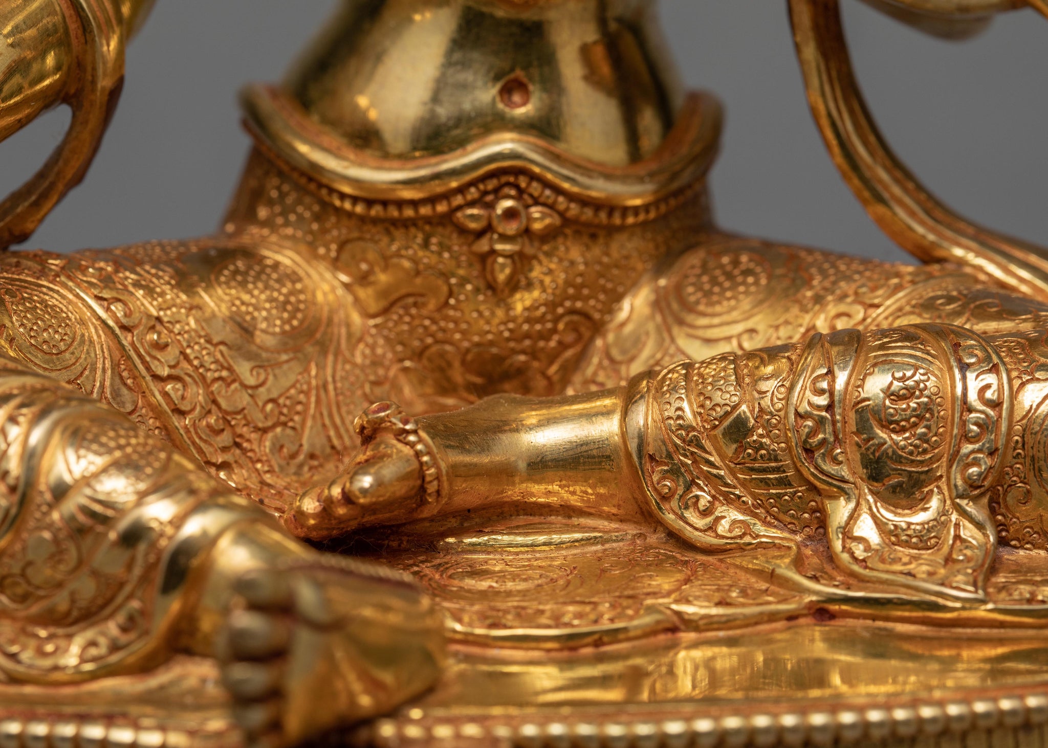 Green Tara is sometimes called the actual Tara, though she is parallel to White Tara. She is also called the Nepali princess and an emanation of Avalokiteshvara. She protects us from negative energies, diseases, or other difficult predicaments, and so she does not sit in a complete meditational pose, with one leg down.
