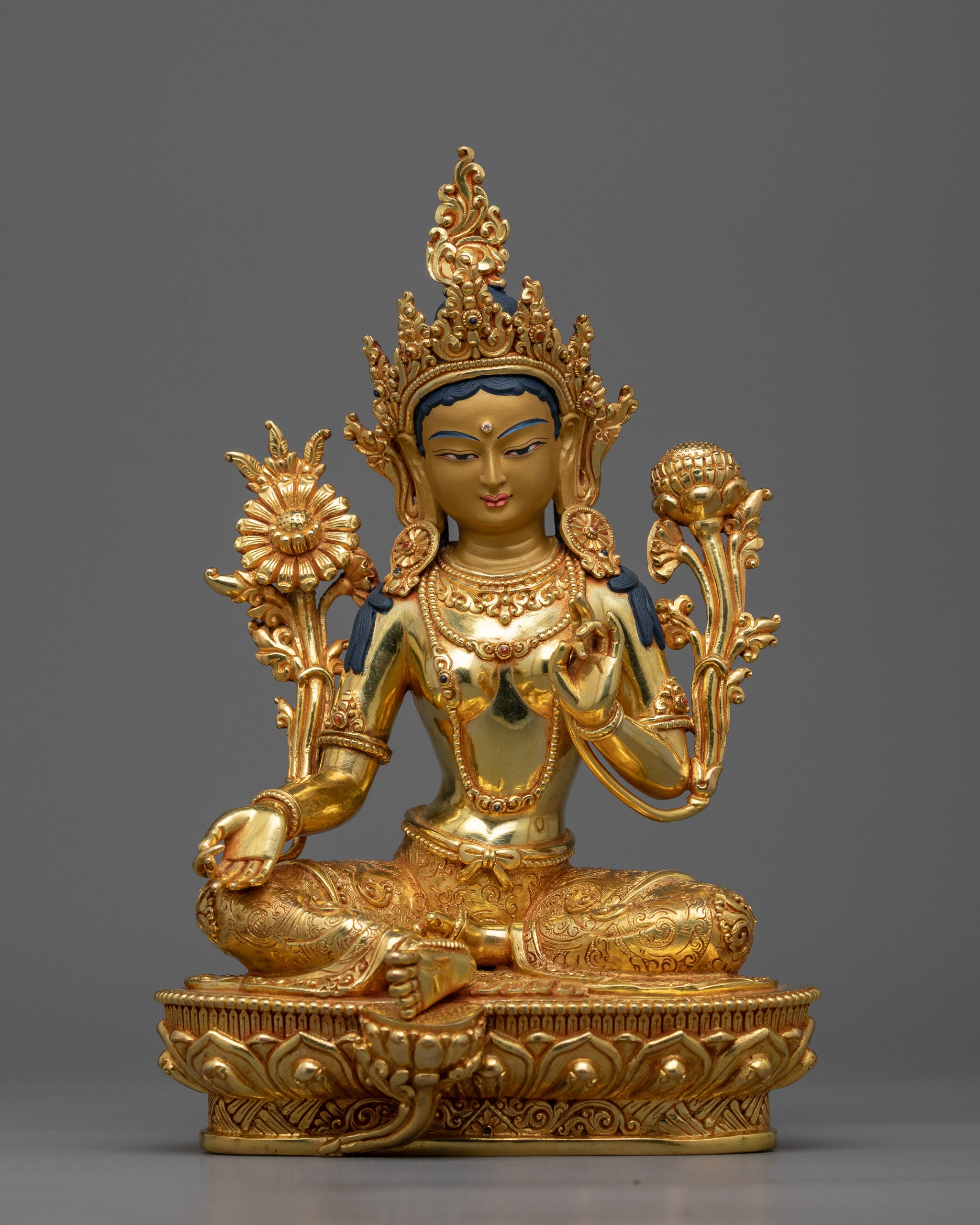 24K Gold Gilded Green Tara Statue For Shrine, The Buddhist Syamatara Statue embodies divine protection and compassion, enhancing your spiritual space with its peaceful presence and nurturing energy.