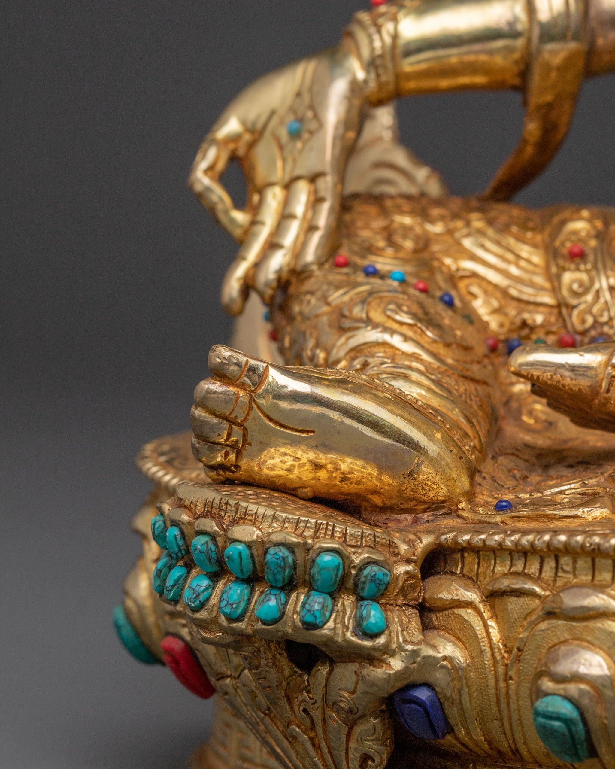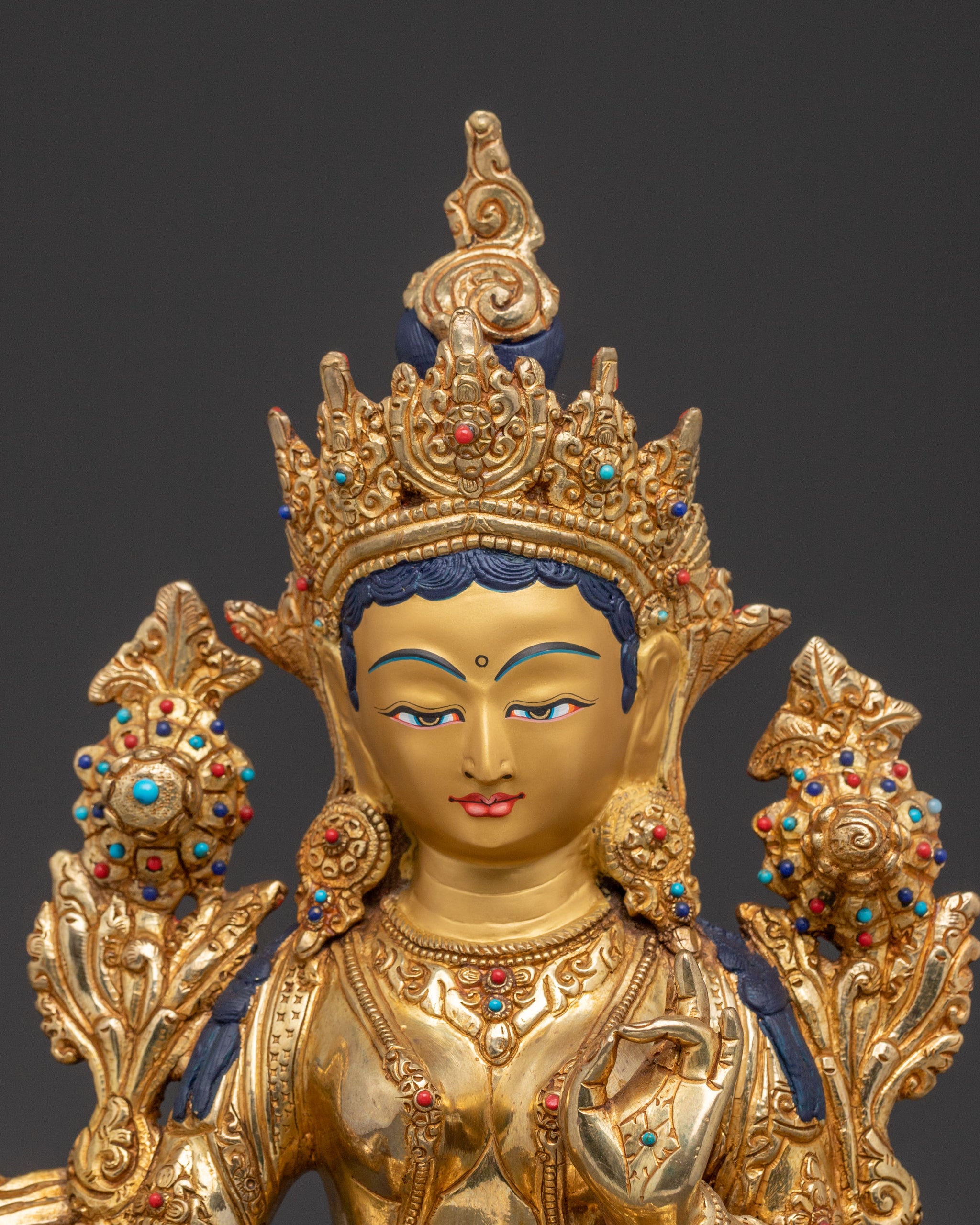 Green Tara arises as a radiant guardian green tara statue, embodying swift compassion and protection. This exquisite piece of Buddhist art offers a tranquil presence, meticulously handcrafted from copper and adorned with brilliant 24K gold gilding. She invites connection with her liberating energy, bringing peace and solace to any sacred space. The copper body is meticulously shaped and then generously 24K gold gilded, highlighting intricate details. Delicate acrylic paintings capture her serene expression, while carefully inlaid gemstones add sacred brilliance, embodying Nepalese Buddhist art.