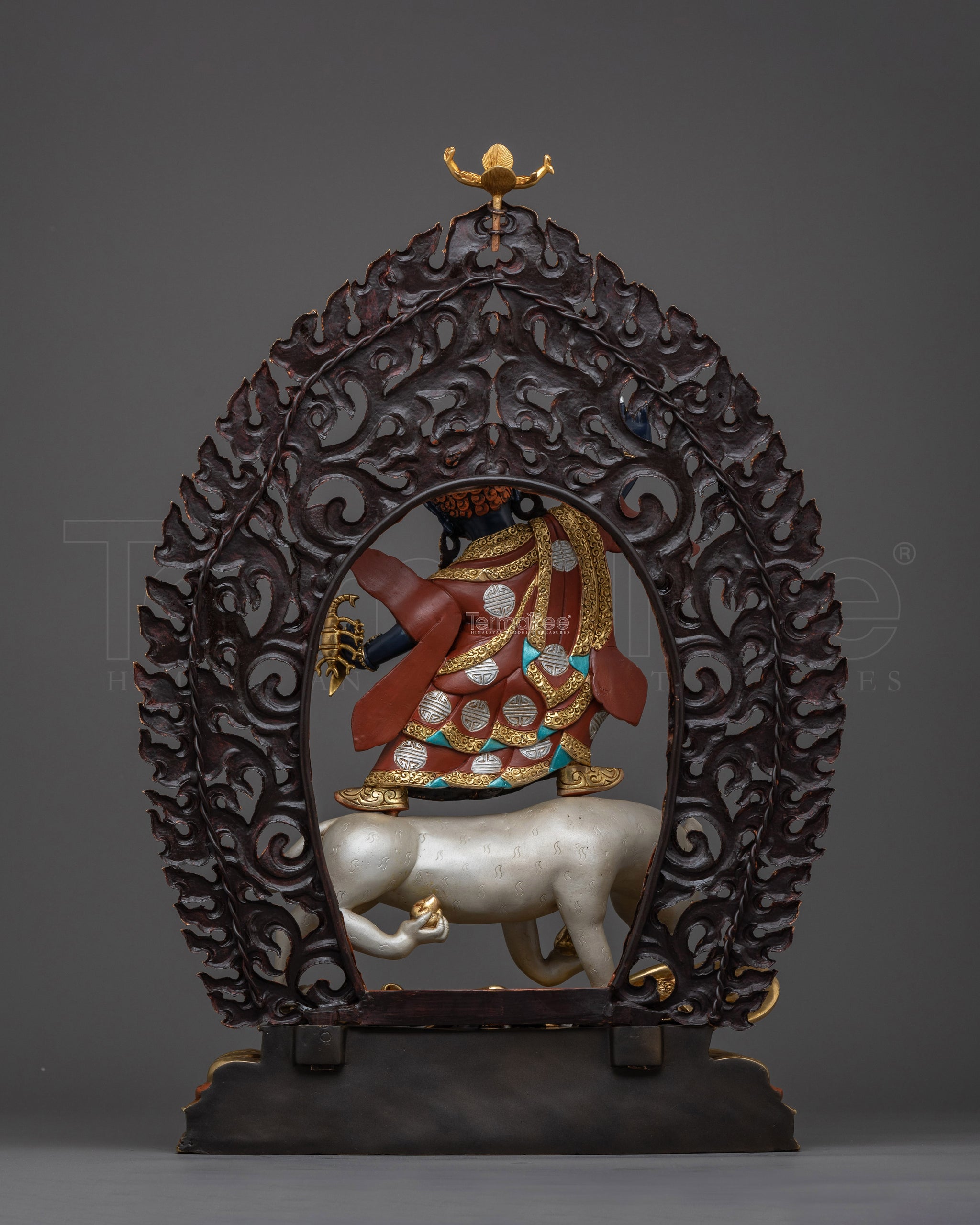 In Tibetan Buddhism, Dorje Drollo is a furious incarnation of Guru Rinpoche (Padmasambhava), representing fierce compassion and protection. With an angry expression, a crown of skulls around his head, a vajra and phurba in his hands, and flames all around, he is shown as having the ability to change bad energy. Dorje Drollo, riding a pregnant tigress, represents his control over wild elements. He transforms toxic emotions into enlightened consciousness and offers protection from bad influences and impediments. Practitioners ask for his blessings in order to be courageous, fearless, and empowered. Chanting "Om Ah Hung Benza Guru Pema Siddhi Hung," his mantra, summons his powerful powers of transformation and protection.