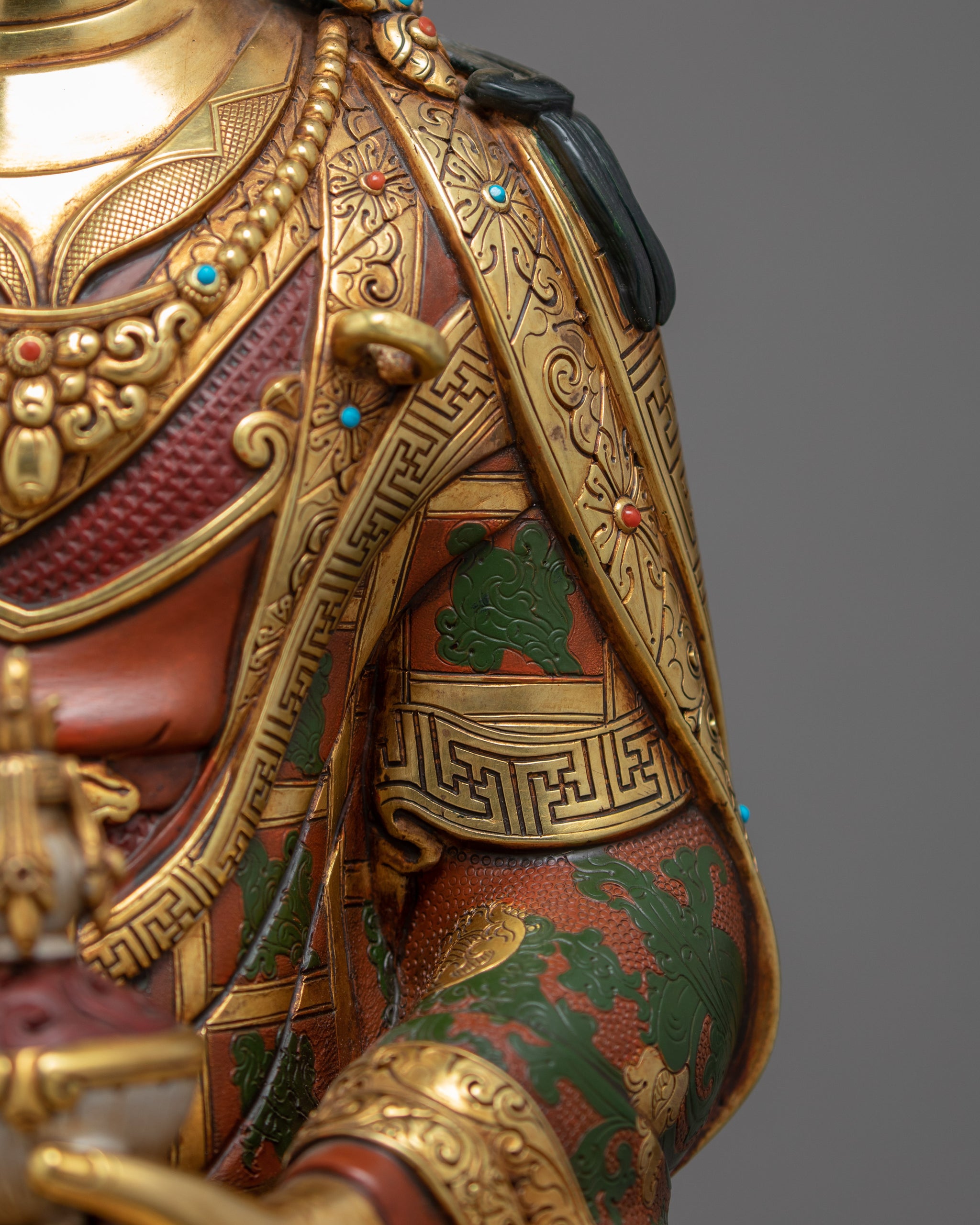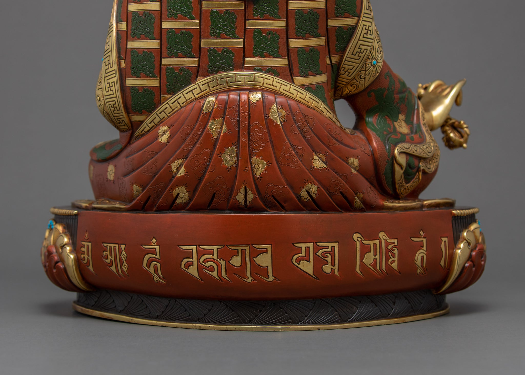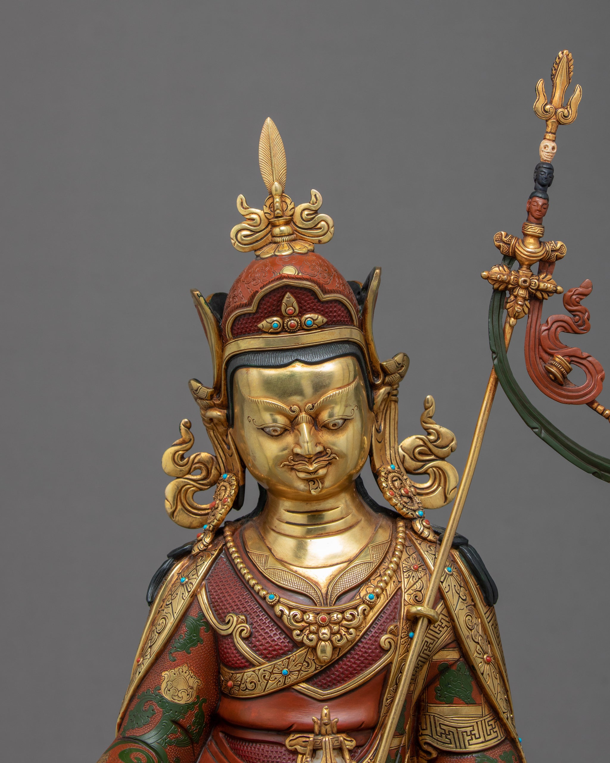 We have exquisitely hand-carved the art of Guru Padmasambhava, also known as Guru Rinpoche, in traditional Himalayan style. We have depicted a deity sitting atop a moon disc lotus seat, holding a vajra in his right hand while a vase in his left. We are the artist of Kathmandu valley whose artisan has passed from generation to generation, reflecting Buddhism. You can use this statue for different purposes like meditation or yoga practices and even in many Buddhist rituals. We have sculpted the sculpture in a pure copper body and gilded it with genuine 24k gold. We also adorned and embellished the ornaments with precious gems and rare turquoise, which are exclusively hand crafted.